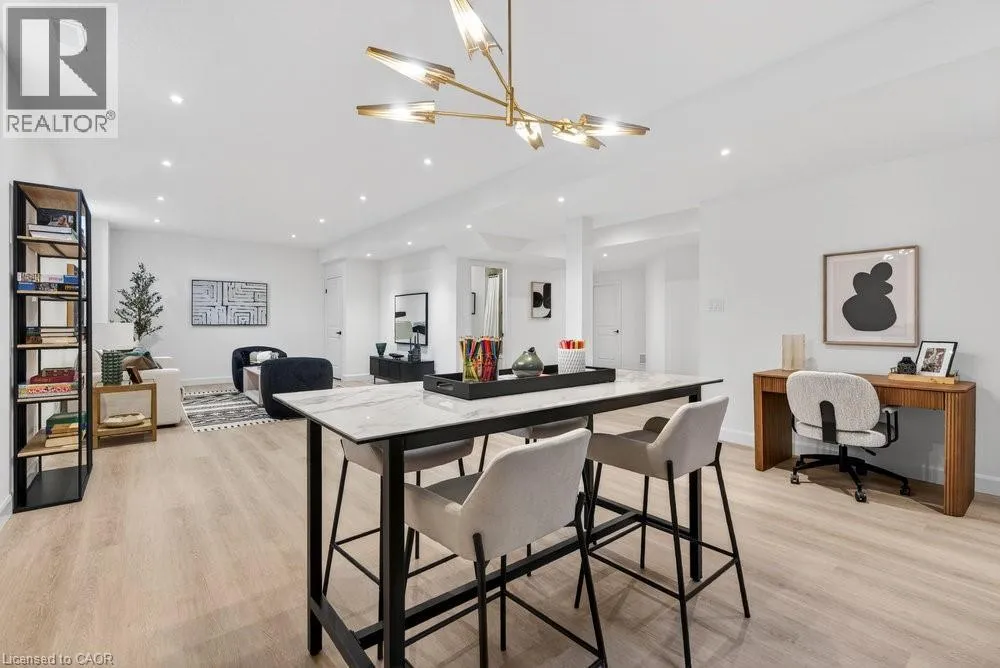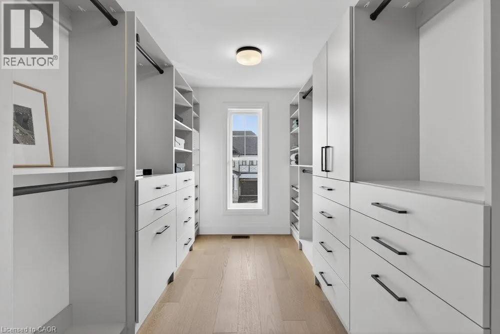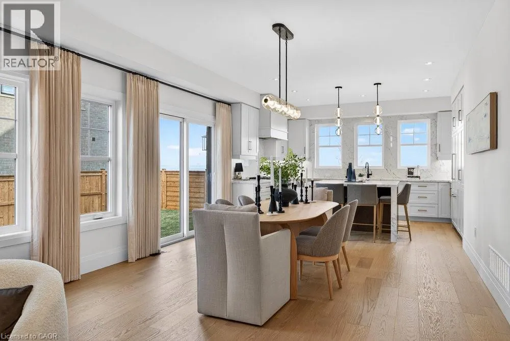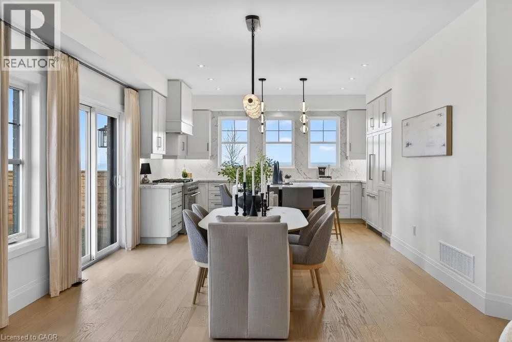 Fruitland to N. Service to Glover and Watershore Brand new lake-facing home in award-winning community- The Residences at Watershore! Don't miss this rare opportunity to own a stunning 4-bedroom, 4.5 bathroom home on a premium corner lot just steps from Lake Ontario. This home features a custom layout that has been professionally designed with elevated finished throughout. The bright, open concept main level features 12 x 24 tiles, engineered hardwood flooring, oak stairs to both the upper and lower levels, and a thoughtfully designed main floor den with reeded glass door. At the heart of the home, the chef-inspired kitchen is a true statement- featuring a countertop with full-height quartz backsplash for a sleek, cohesive finish. Premium details like the panel-ready fridge and dishwasher, along with a decorative hood fan, complete with kitchen's timeless and elevated aesthetic. The large living and dining areas are anchored by a gas fireplace with custom wood mantle, perfect for relaxing or entertaining. A dedicated mudroom adds convenience and function. Upstairs, retreat to the lake facing primary suite, complete with private balcony, walk-in closet with custom organizers, and a spa-like ensuite featuring a freestanding tub, custom glass shower, double sinks & quartz counters. The second bedroom includes its own ensuite with a roll-top shower and quartz vanity. Two additional spacious bedrooms share easy access to a well-appointed main bath. The second-floor laundry room includes a washer, dryer and built-in cabinetry and counter space for added function. The fully finished basement featured 9-foot ceilings, larger windows for increased natural light, vinyl plank flooring and a 3-piece bathroom- ideal for a home gym, guest retreat, or family room. Ideally located just minutes from the QEW, top-rated schools, shopping, and everyday amenities. Don't miss it! (id:27476)