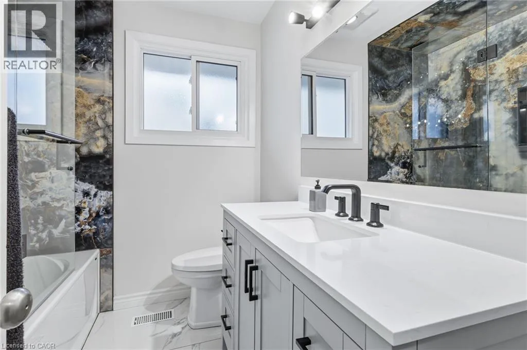 Hwy 8 to Blenheim 27 Blenheim Dr offers a tremendous opportunity to live in and to provide rental income from an exiting 3 bedroom rental unit (with a separate entrance). Located in Stoney Creek this family friendly community contains 3+3 bedrooms / 2 full bathroom and is suited to a large family or anyone looking to live and rent (existing seller would be interested in renting either the unit for $2,500 per month plus a share of the utilities. This move in ready home features updated lighting, new modern laminate flooring, new broadloom in recreation room, freshly painted, replaced windows (2019) roof ( 2015) eavestrough and fascia (2023) furnace and air (2023). 100 amp service. Detached garage with room for 8 cars in the driveway. Fully fenced backyard. Close to all amenities. Don't miss out on the opportunity to make this home your own!! (id:27476)