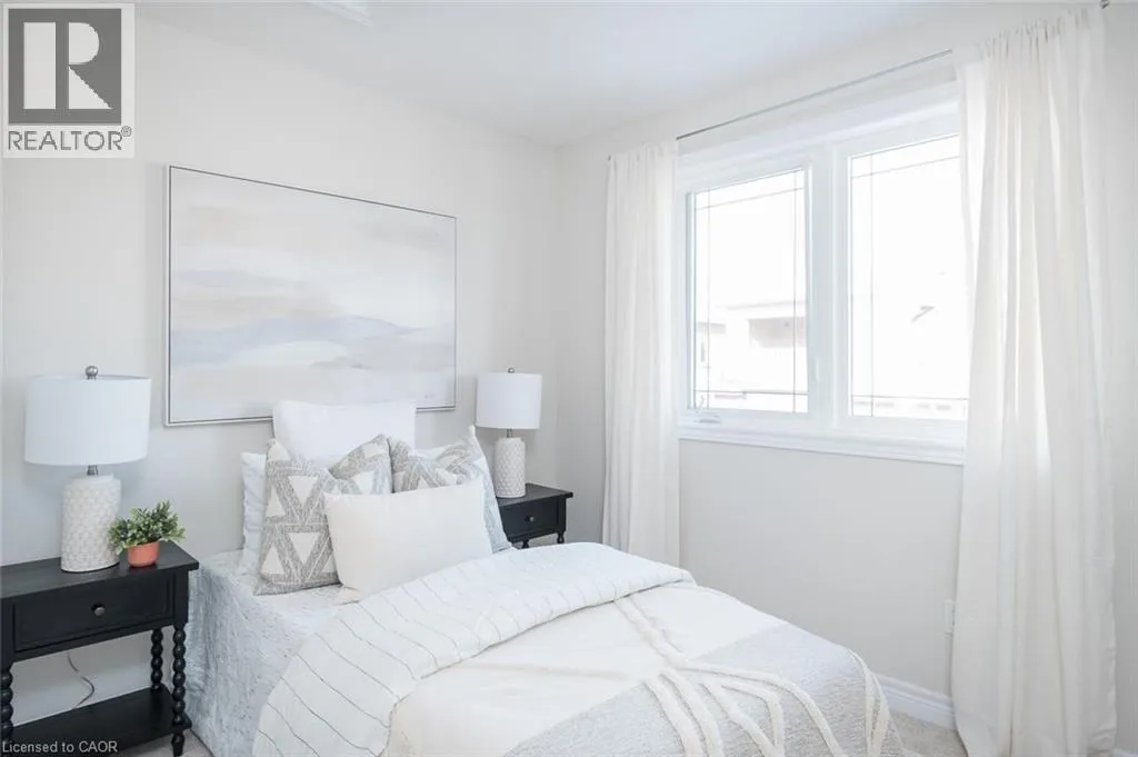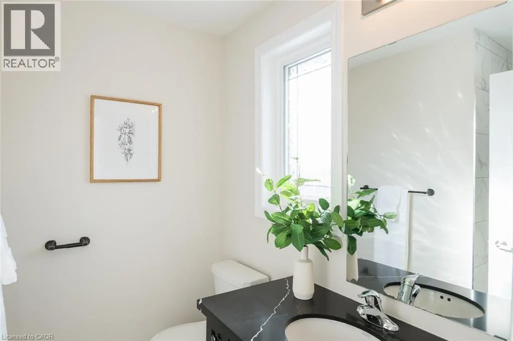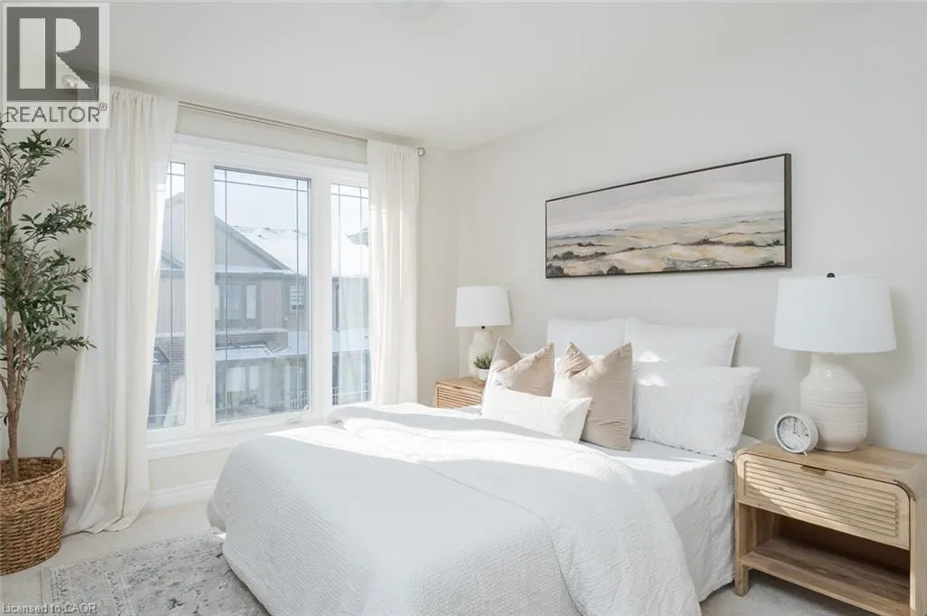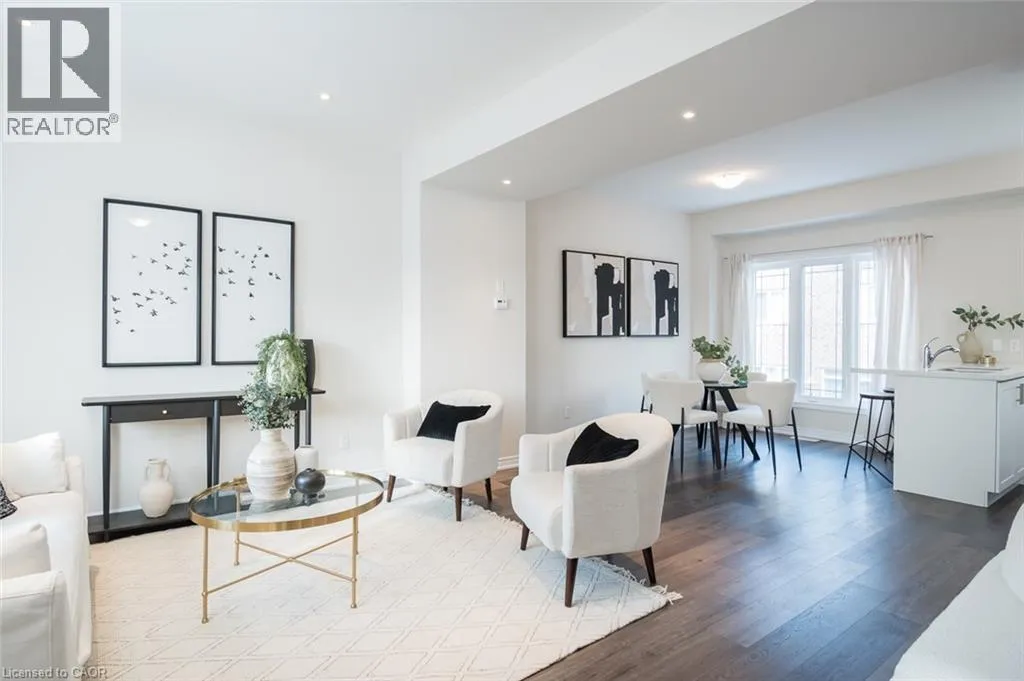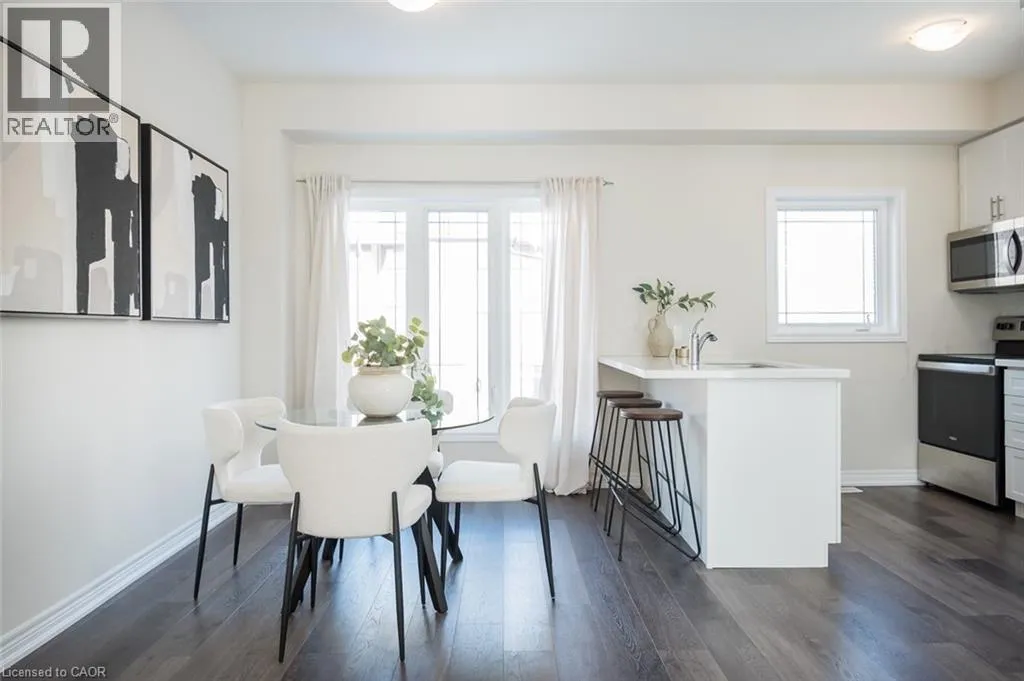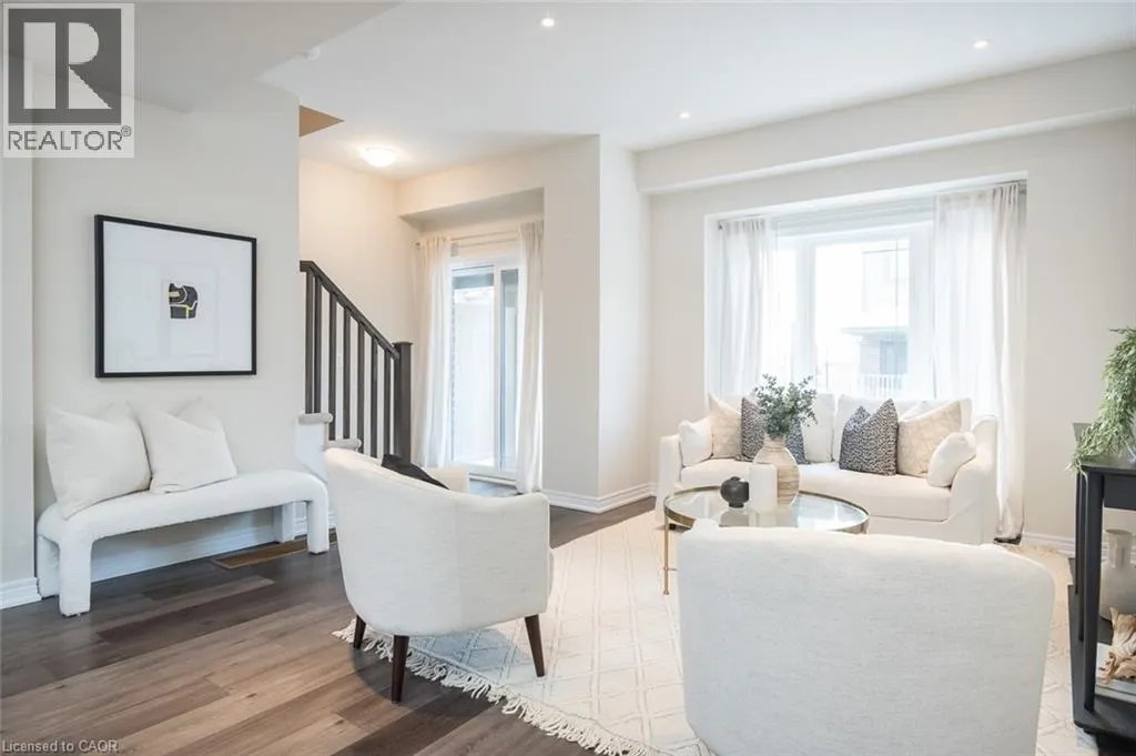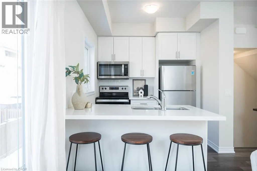 Upper Centennial Pkwy to Highland Rd W to Picardy This newer built freehold townhome is thoughtfully finished throughout, offering a clean, modern layout designed for easy day-to-day living. Wide plank, wood-inspired flooring, pot lights, and large windows create a bright, cohesive main level anchored by a sleek kitchen with quartz countertops, stainless steel appliances, tiled backsplash, and a double undermount sink with breakfast bar seating. The upper level is well laid out with two bedrooms, including a primary suite complete with a walk-in closet and a three-piece ensuite featuring quartz finishes and a large window. A second bedroom with a double-door closet and convenient upper-level laundry add to the homeâs practical appeal, making the space equally suited to professionals or a young family. Outdoors you'll find a rear yard and parking conveniences that include an attached garage, and a driveway parking space, along with visitor parking for guests. Ideally located close to Saltfleet District High School, nearby parks, and everyday amenities enjoy all this move-in ready home has to offer. (id:27476)