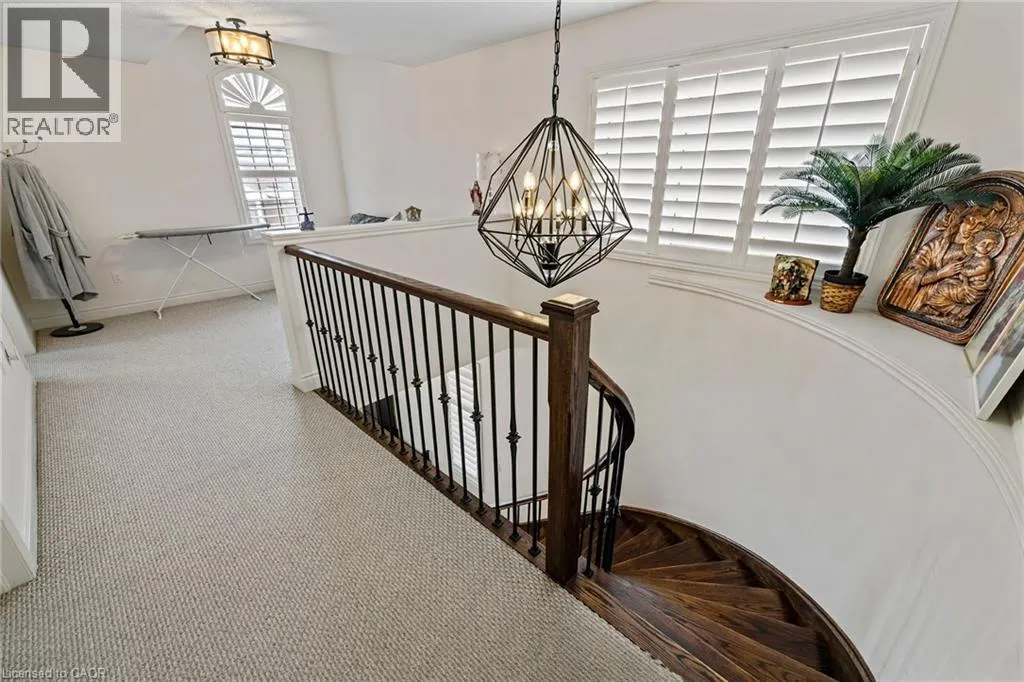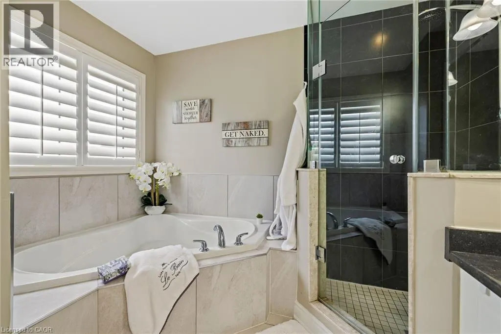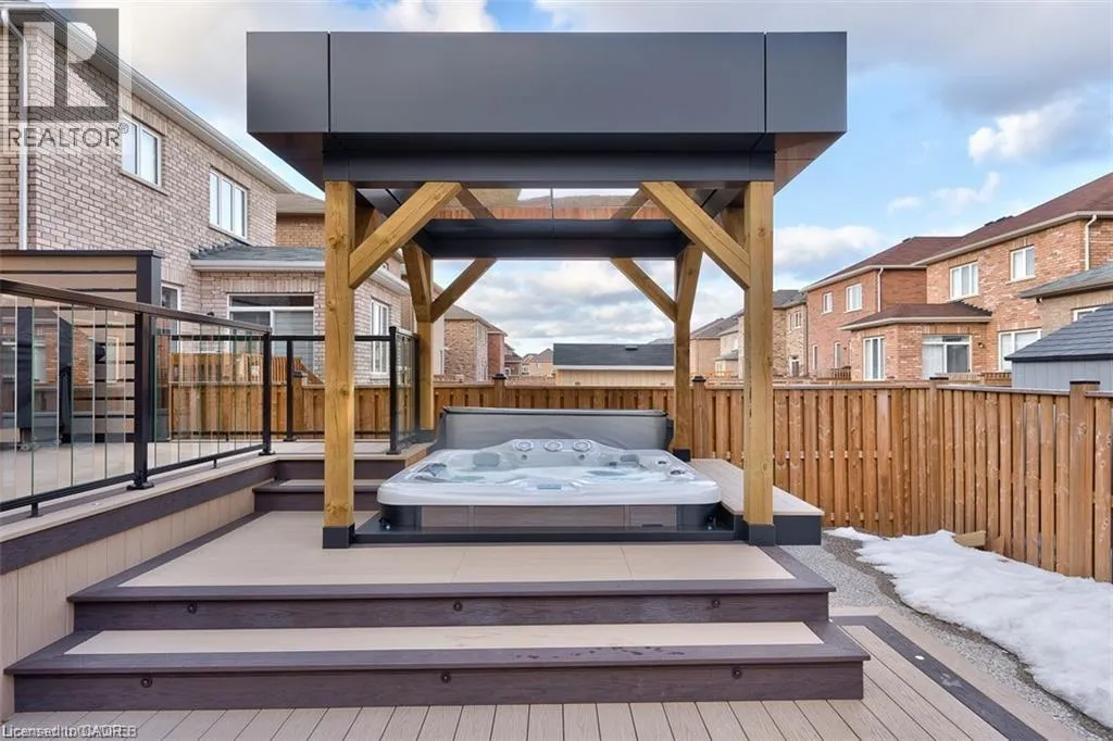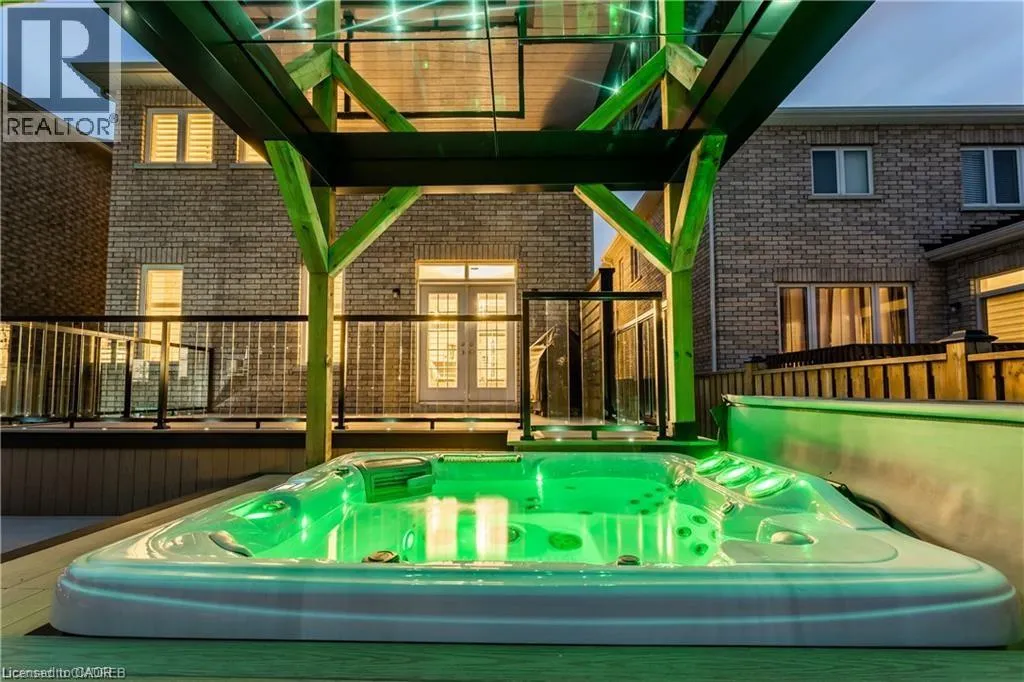 Upper Centennial Pkwy to Highland Rd to Chaumont Dr Welcome to 114 Chaumont Dr and step into refined living in this beautifully appointed Stoney Creek Mountain home, offering soaring 9-foot ceilings, and impressive grand foyer, main-floor laundry, and a convenient separate entrance for In-Law Potential. Rich hardwood floors, California shutters, and in-ceiling speakers complement the thoughtfully designed layout, featuring separate living and dining spaces, a gas fireplace, and a bright open-concept kitchen with a breakfast bar, quartz countertops, designer stone backsplash, premium appliances, and a French door walkout to the backyard, all filled with an abundance of natural light. The second level offers four generously sized bedrooms and two full bathrooms, including a Jack-and-Jill layout, while the spacious primary suite features a walk-in closet and a luxurious five-piece ensuite. The finished basement, complete with a separate entrance, is designed for entertaining and relaxation, showcasing a large recreation area, custom stone wet bar with built-in wine cooler, sleek quartz countertops, a striking stone feature wall, an electric fireplace, and pot lighting throughout. Outside, enjoy an expertly crafted composite deck with gas BBQ hookup, a custom cabana, and a stunning illuminated hot tub for year-round hosting and enjoyment. Ideally located in the heart of Stoney Creek Mountain, just minutes from top-rated schools, parks, shopping, and quick highway access, this exceptional home is a must-see! (id:27476)