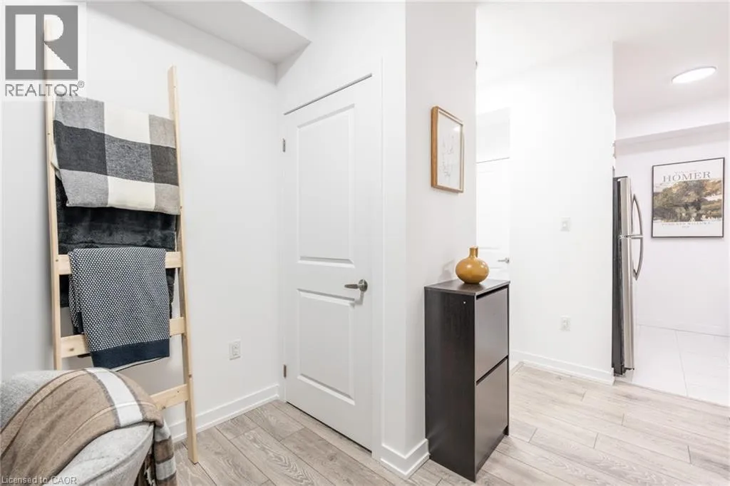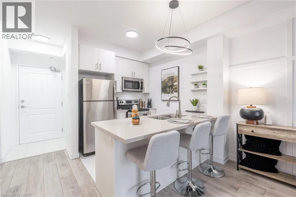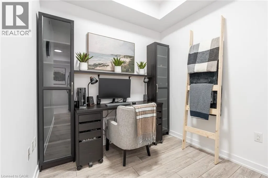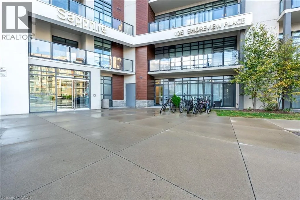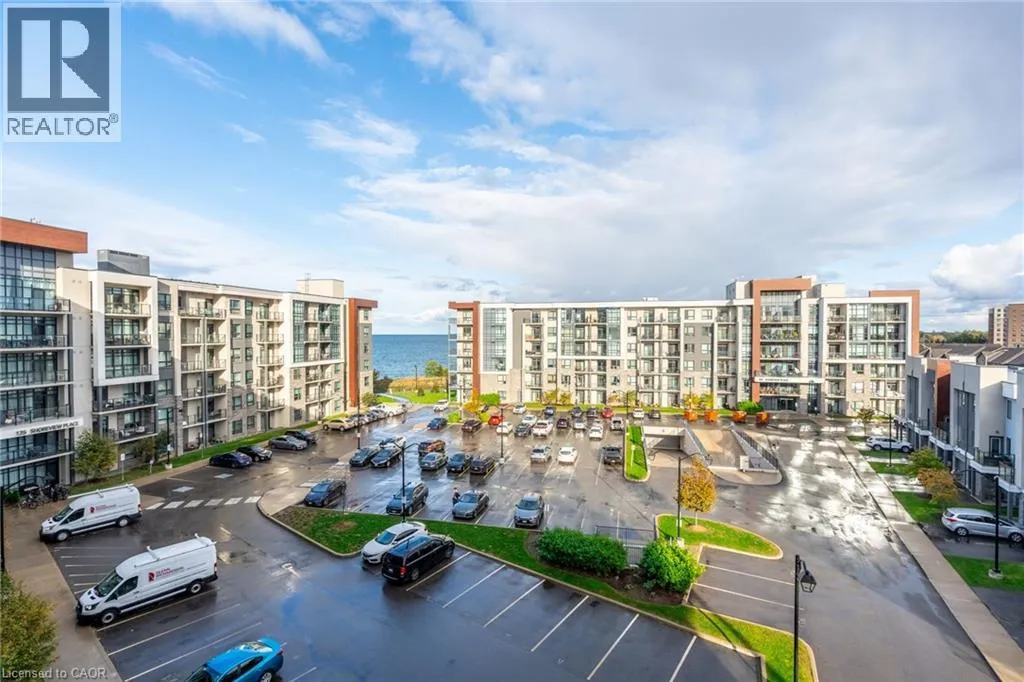 NORTH SHORE TO MILLEN TO SHOREVIEW This 668 square foot lakeside condo in the Community Beach area of Stoney Creek combines style and convenience. It features a bright, open layout with one bedroom and a flexible denâperfect for a home office or reading nook. The modern kitchen is equipped with quartz countertops, subway tile backsplash and stainless-steel appliances, while the living room is highlighted by a stylish feature wall. The primary bedroom comes with a walk-in closet and ceiling fan and the bathroom includes a quartz vanity. Not to be missed are the updated light fixtures, laminate floors that provide warmth and ease of maintenance, and floor-to-ceiling windows providing loads of natural sunlight. Step out onto your private balcony where you can take in views of Lake Ontario. Step out onto your private balcony where you can take in views of Lake Ontario. Residents can enjoy building amenities such as a rooftop patio, gym, and a party room for gatherings. This unit comes with one underground parking space and one locker. Youâll love the location being able to walk along the waterfront, going to the beach and parks and quick access to the highway. Donât be TOO LATE*! *REG TM. RSA (id:27476)