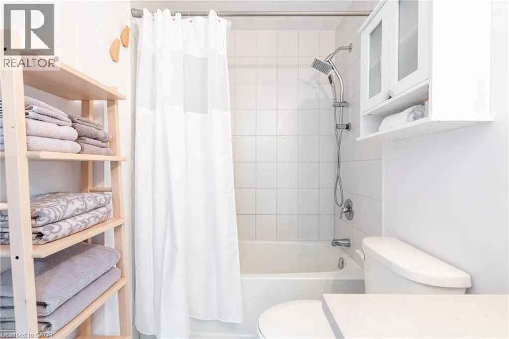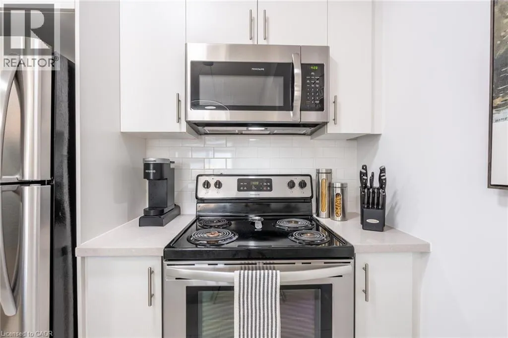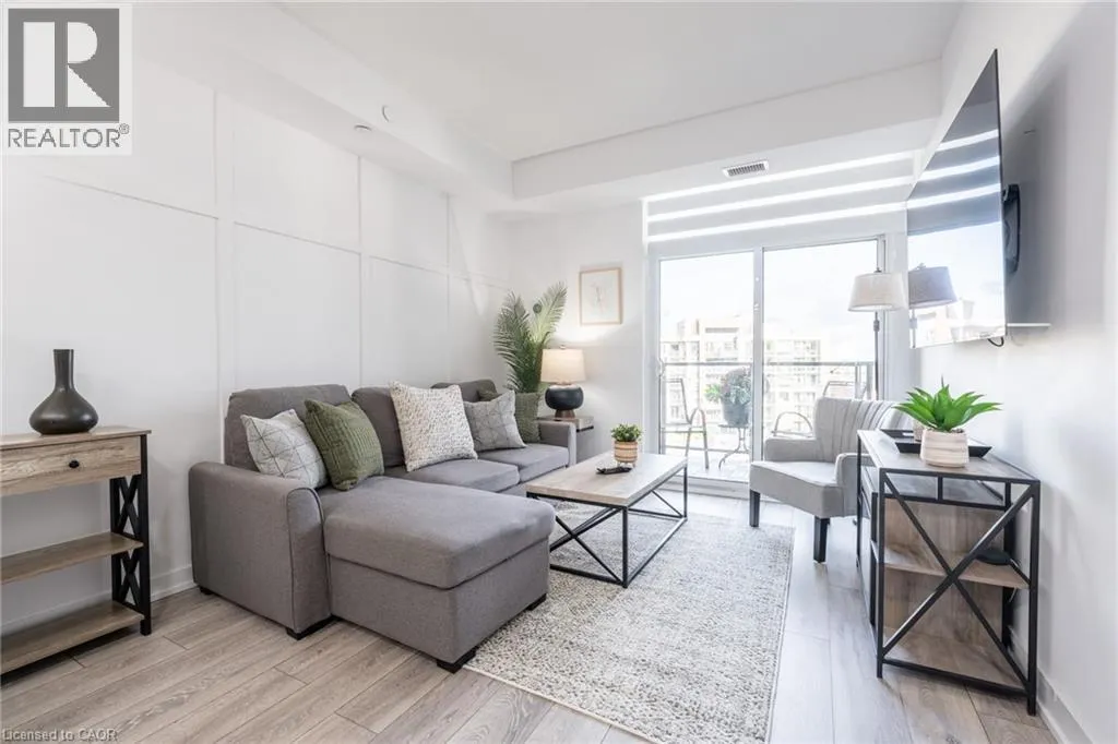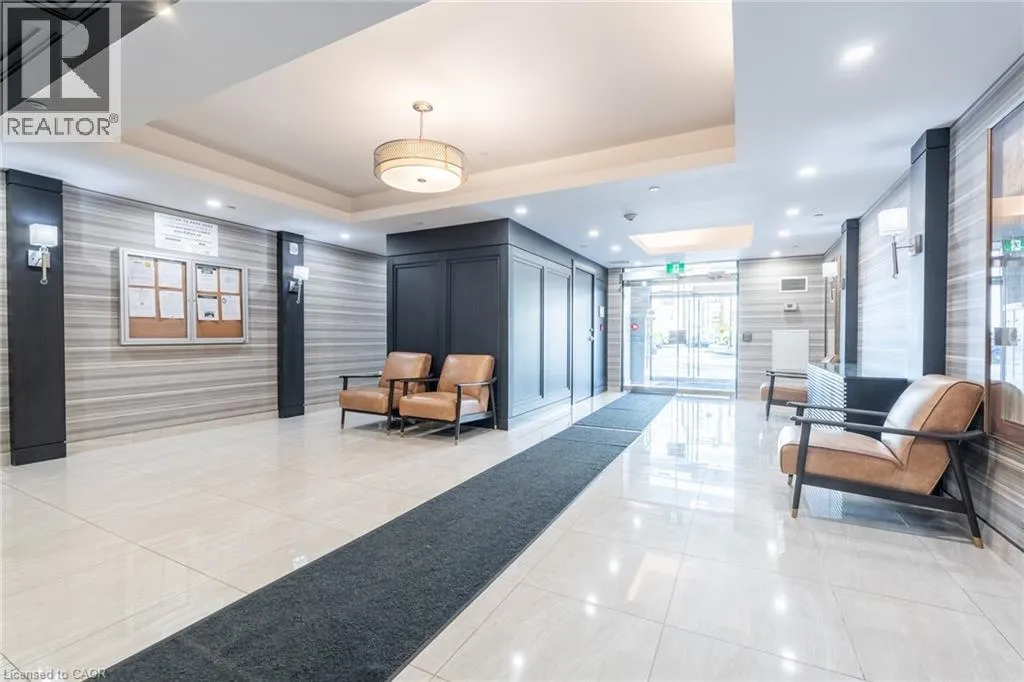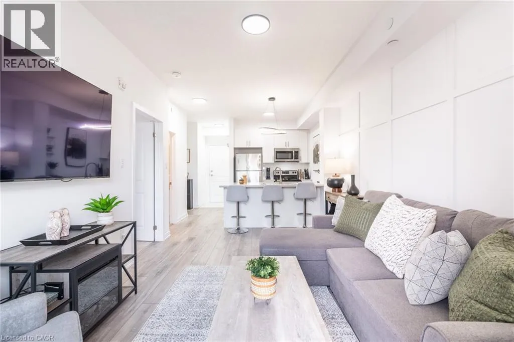 NORTH SHORE TO MILLEN TO SHOREVIEW This 668 square foot lakeside condo in the Community Beach area of Stoney Creek combines style and convenience. It features a bright, open layout with one bedroom and a flexible denâperfect for a home office or reading nook. The modern kitchen is equipped with quartz countertops, subway tile backsplash and stainless-steel appliances, while the living room is highlighted by a stylish feature wall. The primary bedroom comes with a walk-in closet and ceiling fan and the bathroom includes a quartz vanity. Not to be missed are the updated light fixtures, laminate floors that provide warmth and ease of maintenance, and floor-to-ceiling windows providing loads of natural sunlight. Step out onto your private balcony where you can take in views of Lake Ontario. Step out onto your private balcony where you can take in views of Lake Ontario. Residents can enjoy building amenities such as a rooftop patio, gym, and a party room for gatherings. This unit comes with one underground parking space and one locker. Youâll love the location being able to walk along the waterfront, going to the beach and parks and quick access to the highway. Donât be TOO LATE*! *REG TM. RSA (id:27476)