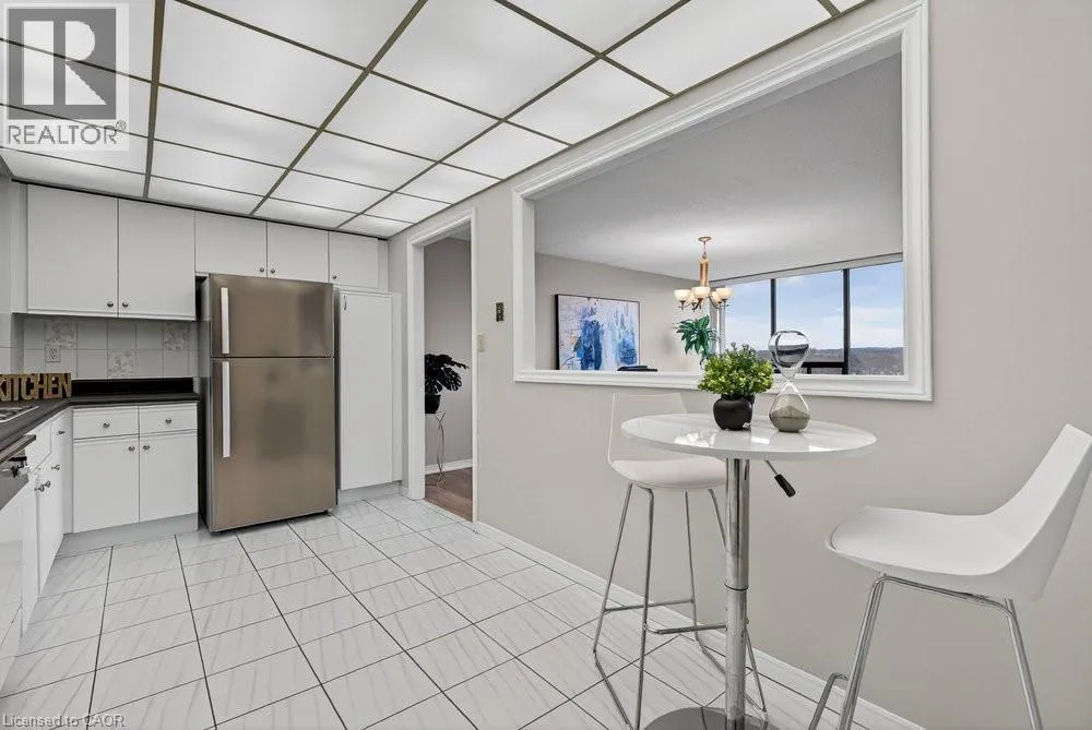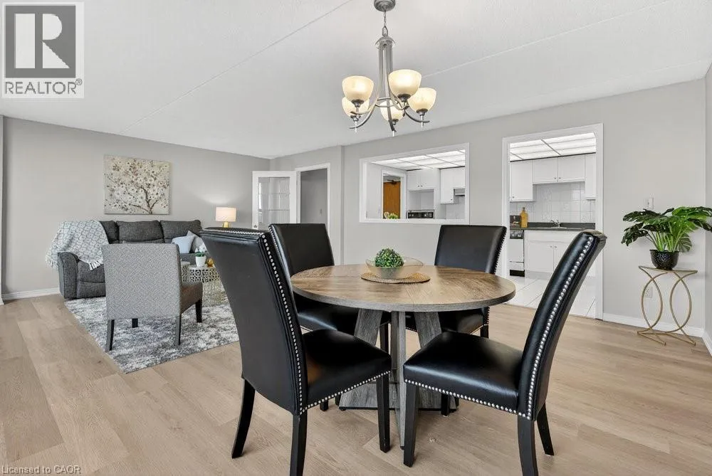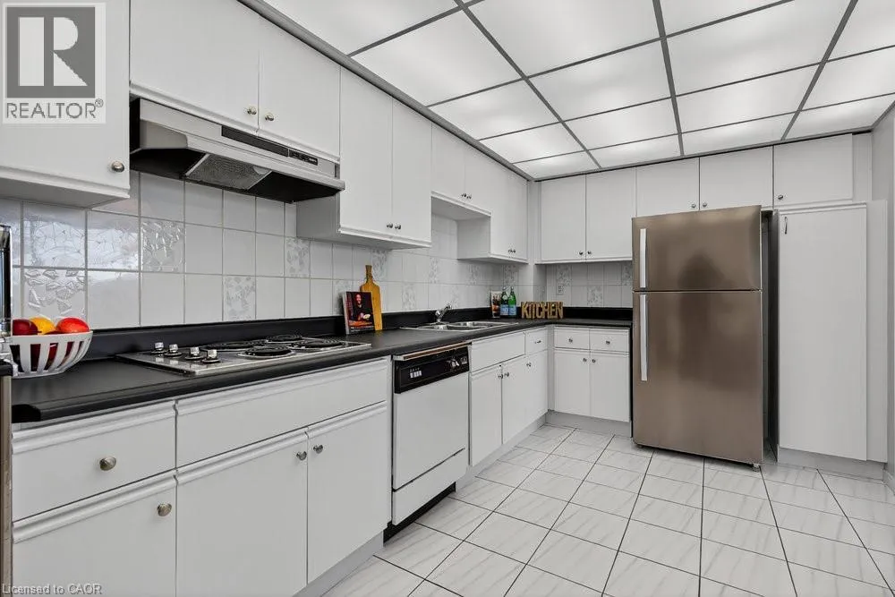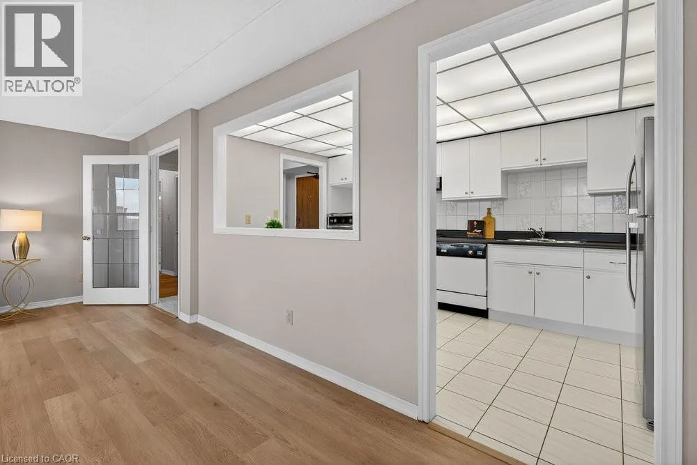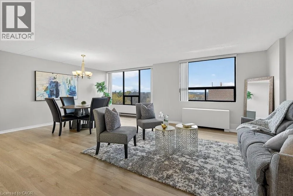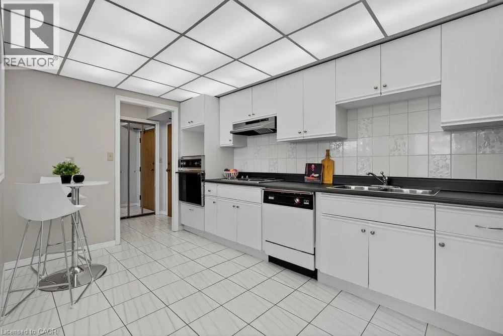 west on Highway #8 - left onto Donn Ave Highly sought-after Florentine building just steps from public transit, Confederation GO Station, shopping, dining, pharmacies, and countless everyday conveniences. This bright and spacious west-facing unit offers beautiful sunsets, featuring 2 bedrooms, 2 bathrooms, a massive living area, huge kitchen, and more. Views of the ravine through large picture windows. Enjoy open-concept living and dining areas with stylish hardwood-look vinyl flooring, and an eat-in kitchen with ample cabinetry and counter space. The generously sized primary bedroom easily fits a king-size suite and includes a 3-piece ensuite with a step-in shower and an extra linen closet. The second bedroom is also spacious, and the main bath features a relaxing tub to soak in. In-suite laundry adds everyday convenience. The building offers excellent amenities including a fitness room, party room, games room, roof top patio & underground parking. A prime location with everything at your doorstep-this is one you won't want to miss! (id:27476)