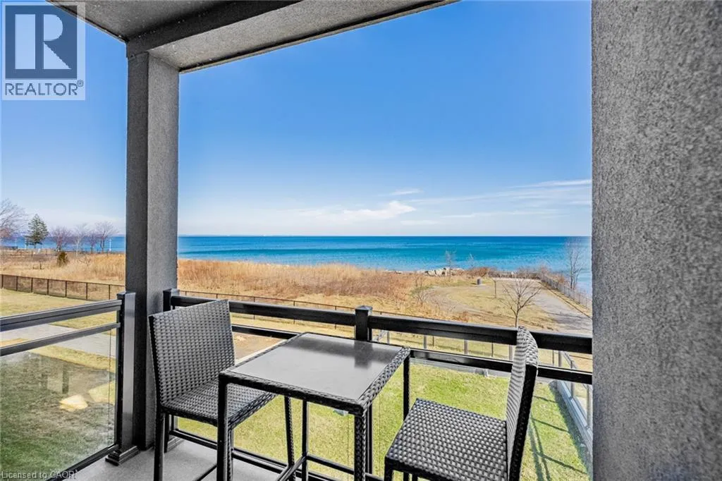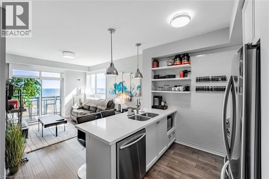 Frances to Southshore Wake up to breathtaking, unobstructed views of Lake Ontario right from your living room, primary bedroom, and private balcony! Welcome to Waterfront Trails - one of Stoney Creek's most sought-after boutique lakeside communities. This stunning 2-bedroom corner unit is bright, modern, and move-in ready, with natural light pouring in throughout the day. The open-concept layout features beautiful hand-scraped hardwood flooring, a sleek white kitchen with stainless steel appliances, quartz countertops, upgraded pendant lighting, and a breakfast bar island - perfect for morning coffee or entertaining guests. Both bedrooms are generously sized, with the primary bedroom capturing those gorgeous lake and Toronto skyline views. The updated 4-piece bathroom is clean and contemporary. Step outside to your private balcony and let the sound of the water do the rest. This building is heated and cooled by geothermal - while fees are listed as excluding heat, A/C & hydro, there are no gas or traditional energy costs; only minimal hydro for the air handling unit. Building amenities include a spectacular rooftop terrace with panoramic lake and escarpment views, a well-equipped fitness centre, party room, bike storage, and ample visitor parking. Walking trails and beach access are right at your doorstep, with quick and easy access to the QEW and all local amenities. Don't miss this one! (id:27476)