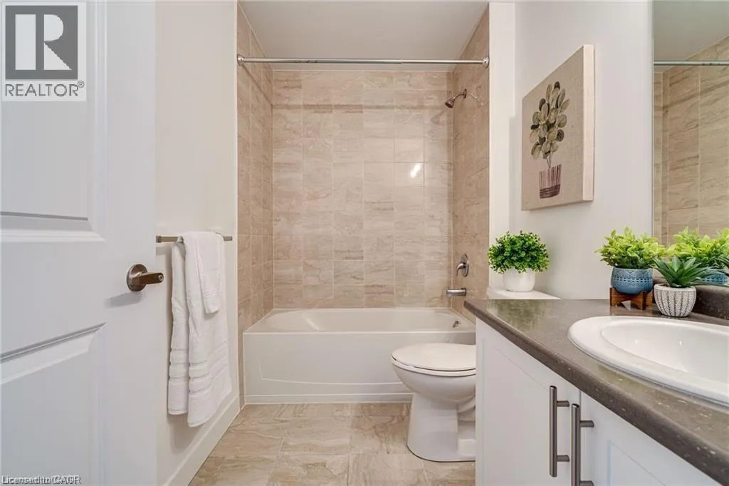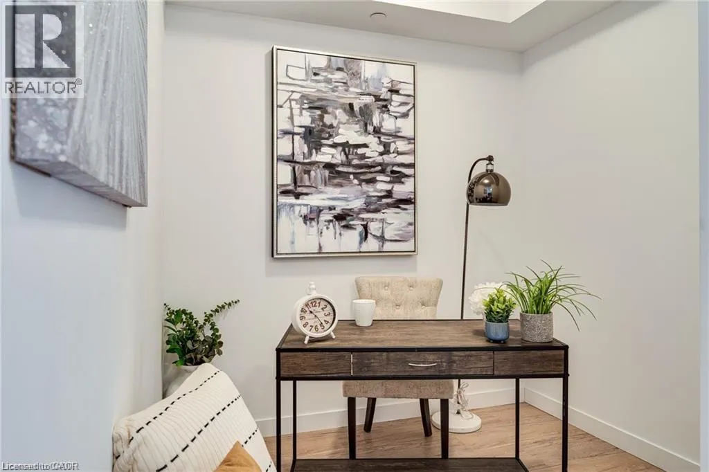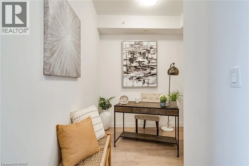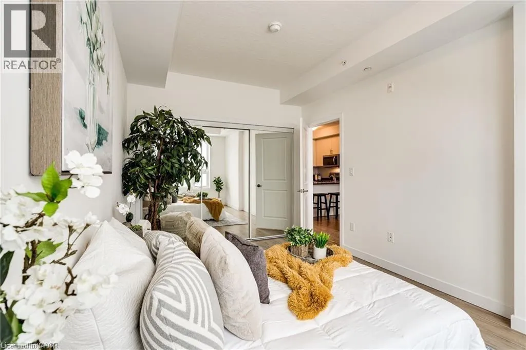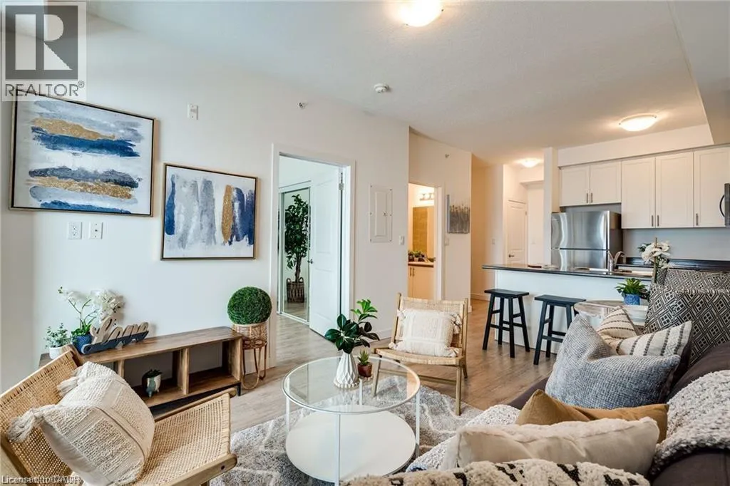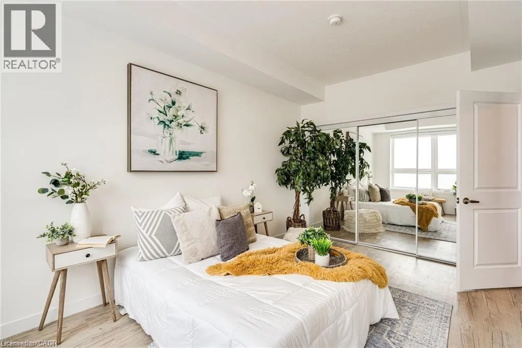 Exit Centennial or Fruitland to North Service Road to Green Road, right Frances Avenue, left on Southshore Crescent. Follow to the Waterfront Trails condo building on the water / lake. Live lakeside and be inspired by direct water views in this second floor in the sought after Waterfront Trails Condo. Modern, spacious and bright one bedroom + den unit with luxury vinyl flooring, 9 foot ceilings and ample natural light. The u-shaped kitchen offers generous counter and cupboard space. The master bedroom wall to wall mirrored closet reflects the green and blue of nature outside your window. Sliding patio doors welcome you to your balcony retreat. Ultimate convenience with ensuite laundry and proximity to highways. Paved Waterfront Trail and beach are steps away. Amenities include: roof top terrace, exercise room, bike room and party room ($). Geothermal heating and cooling and water are included. Tenant to pay hydro (approximately $40 - $50 per month). One underground parking spot and storage locker included. Rental Application, Full Credit Report and Proof of Employment are required. Available immediately. Don't wait, call today to view. (id:27476)