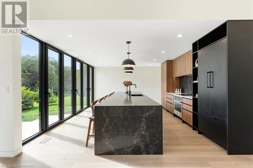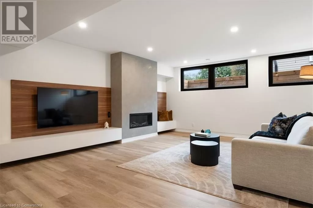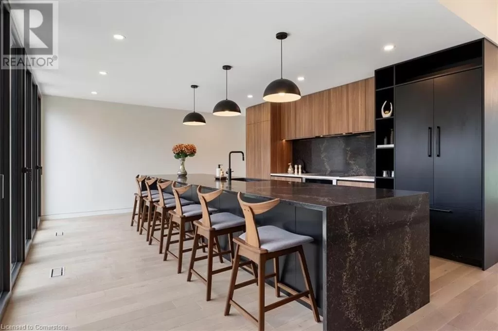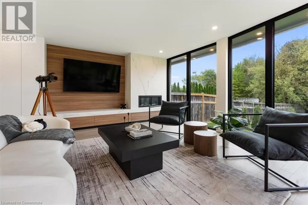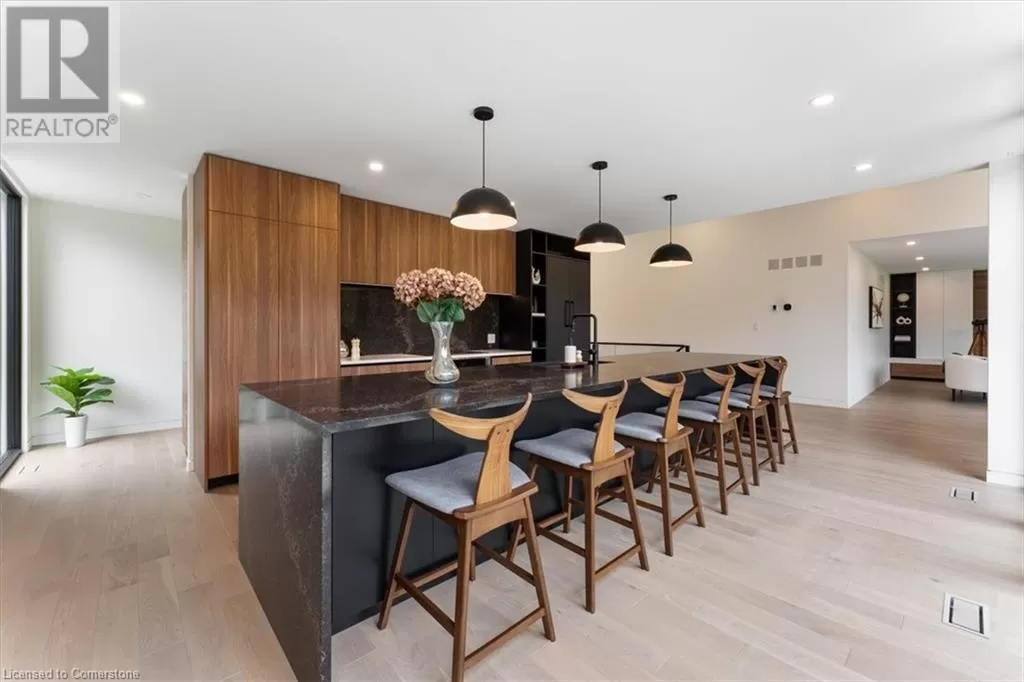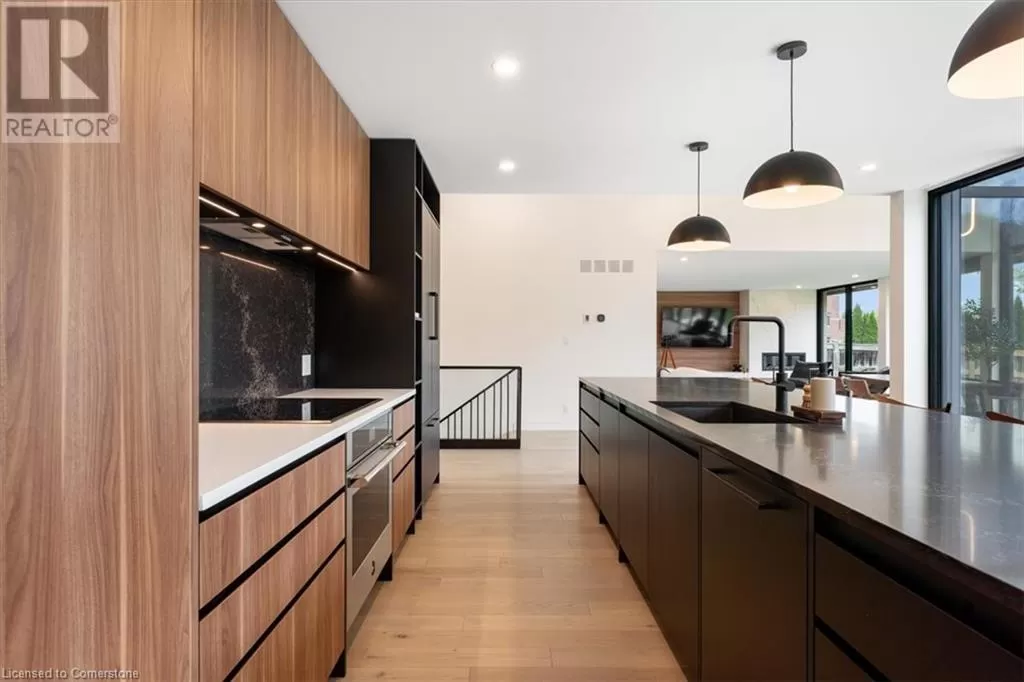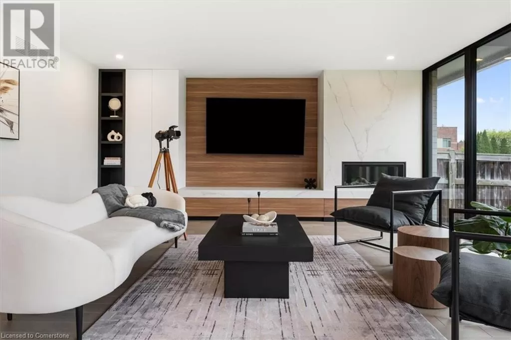 South on Mornington and East on Vivian Line 37 Seller looking for a fair market value offer. Welcome to 3207 Vivian Lineâan architectural masterpiece crafted by SMPL Design Studio, where modern design meets timeless sophistication. This one-of-a-kind residence features expansive floor-to-ceiling windows across the rear facade, flooding the home with natural light and offering a seamless connection to the outdoors. The heart of the home is the custom-designed kitchen with striking black and walnut cabinetry, a show-stopping 15-foot Vanilla Noir Caesarstone island, and a walk-in pantry for added function and style. The open-concept living and dining space is anchored by a sleek gas fireplace and light-toned engineered hardwood floors that flow throughout the main level. The home offers three main floor bedrooms, each with custom-built wardrobes. The primary suite includes a private 3-piece ensuite, while a separate 4-piece bath serves guests and family. The fully finished lower level adds a cozy rec room with a second gas fireplace, a fourth bedroom, an additional 3-piece bathroom, and ample storage. Outside, a modern concrete driveway leads to a spacious two-car garage. A perfect blend of form, function, and flairâthis home is a rare offering in a sought-after Stratford location. (id:27476)