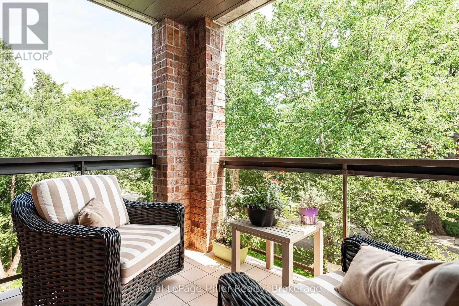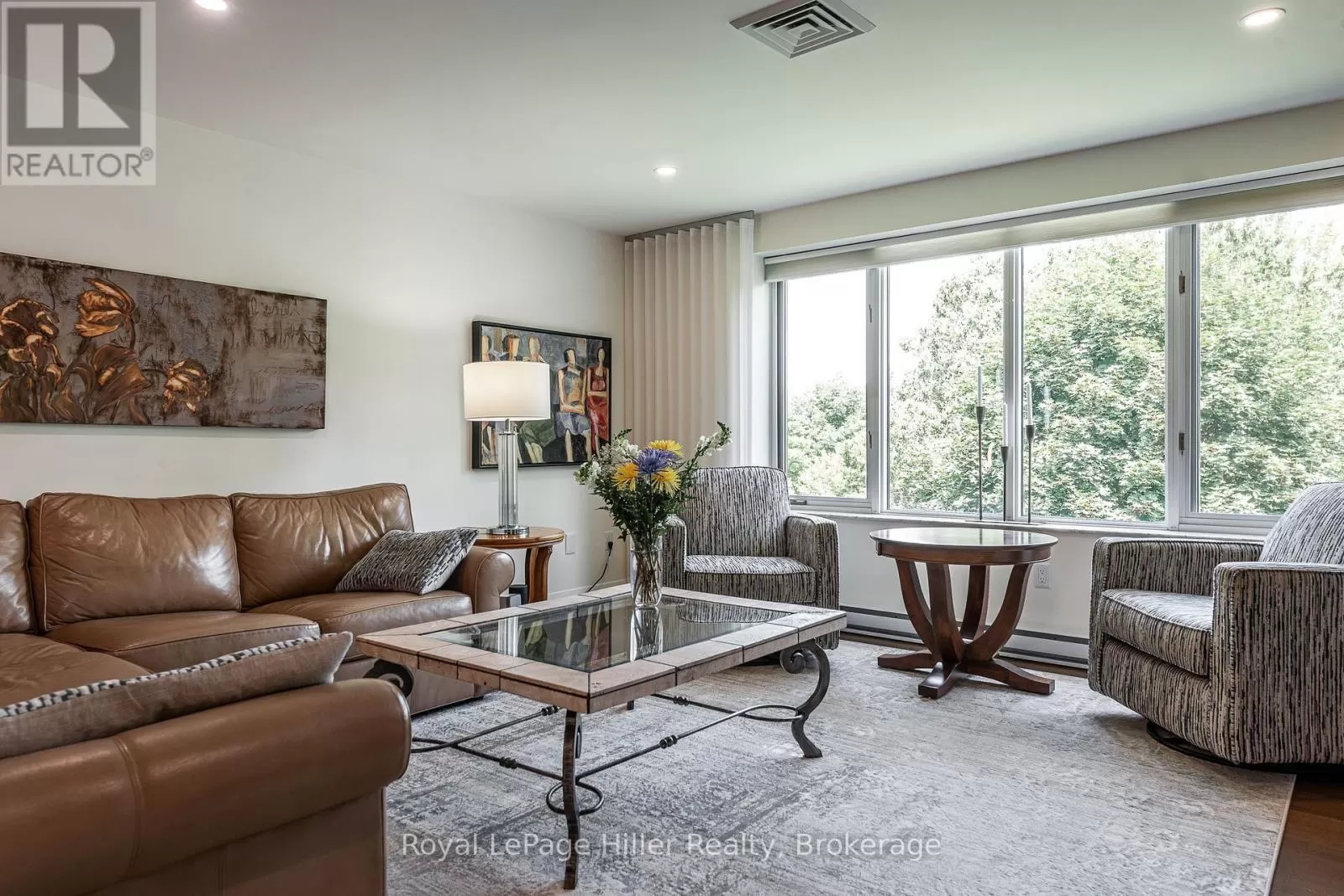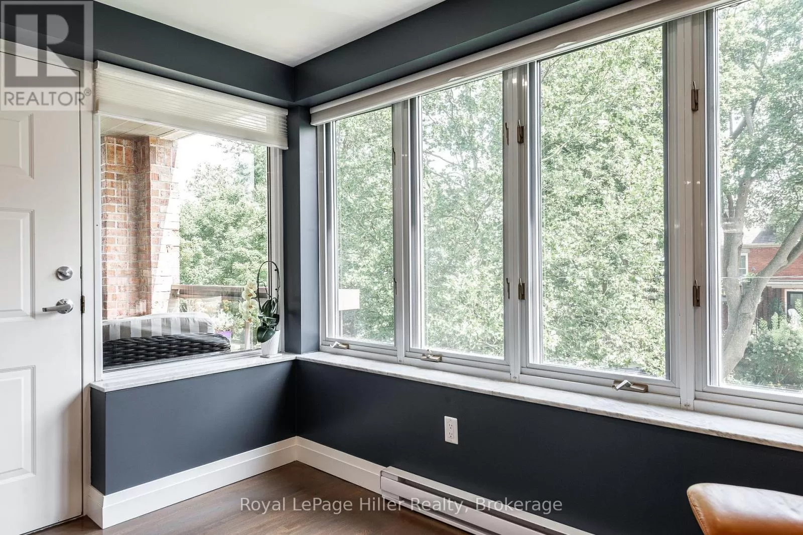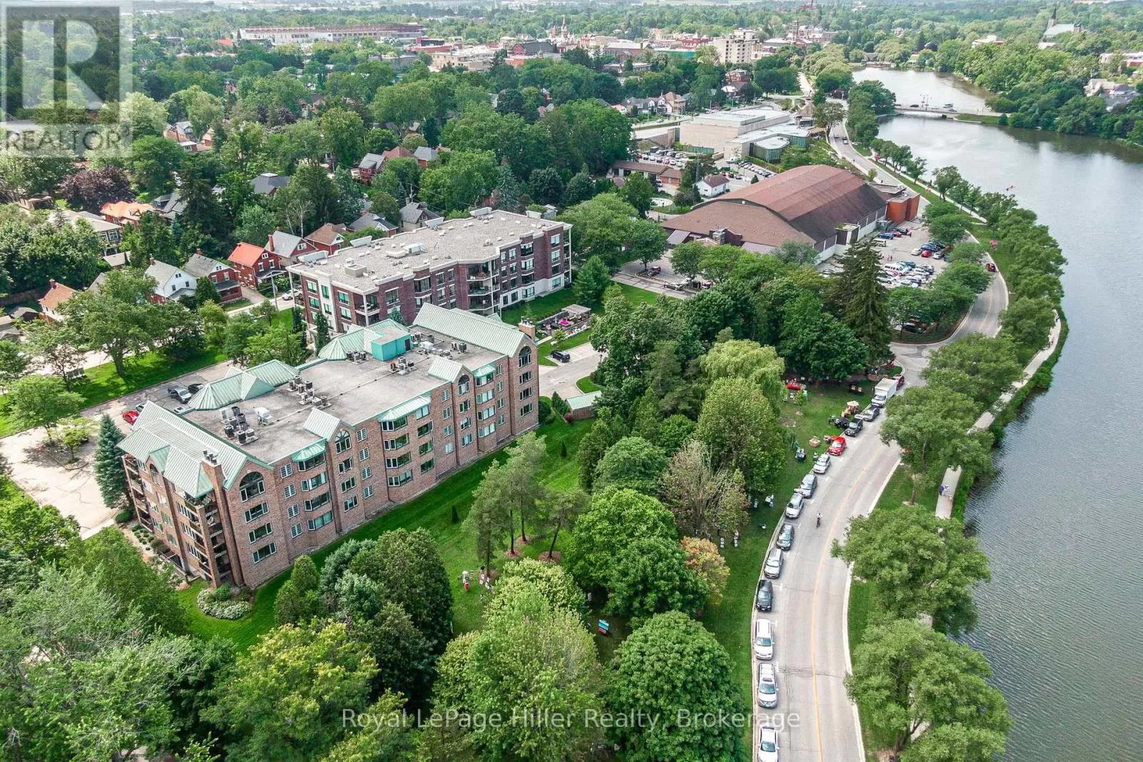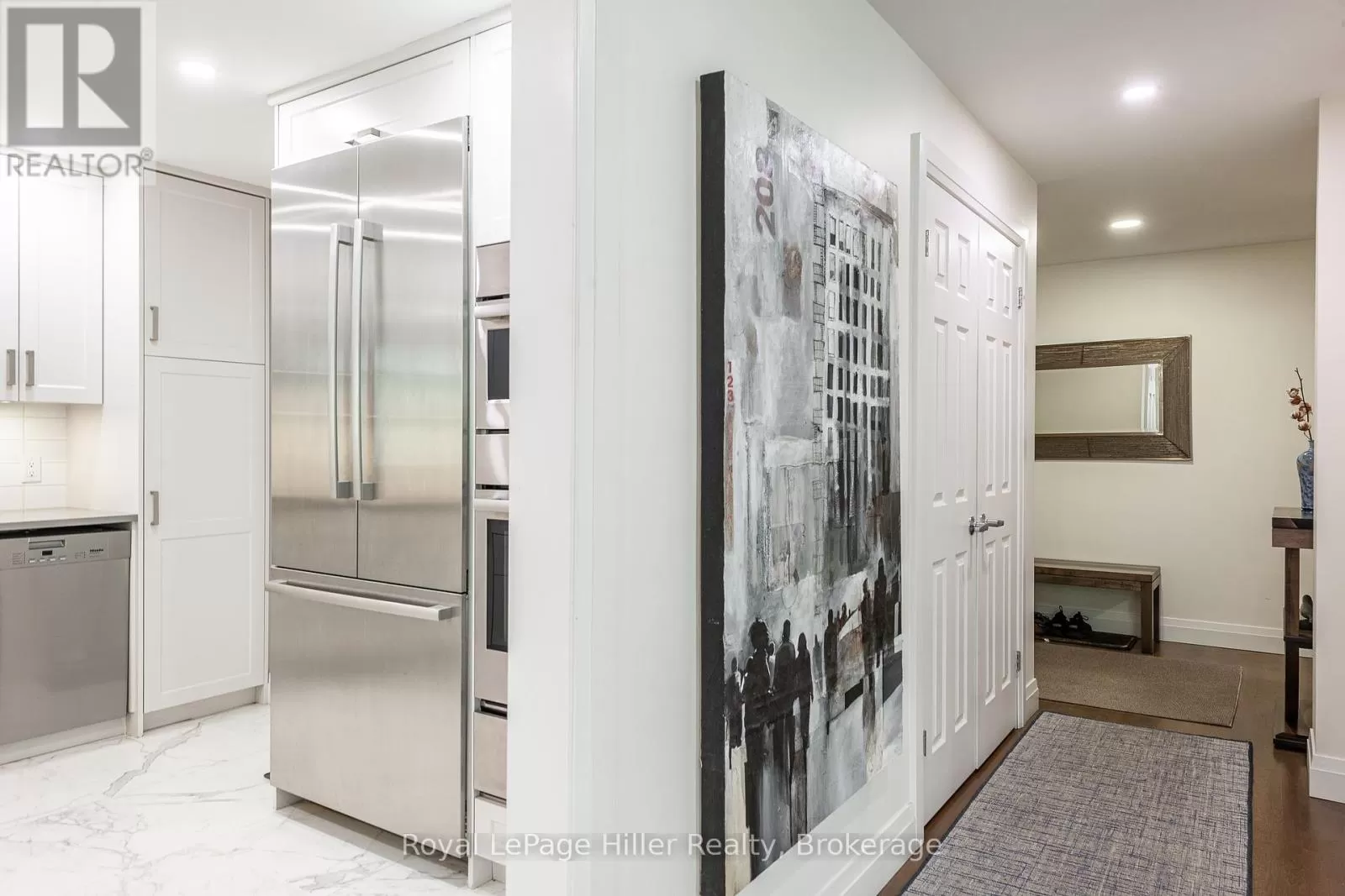 Cross Streets: Corner of Front and Ballantyne. ** Directions: Corner of Front St and Ballantyne St. Sophisticated condo living in Stratford's most sought-after location; The Huntingdon. Overlooks the Avon River and Art in the Park. Steps to the Stratford Festival and the new Tom Patterson Theatre. Minutes from downtown where you can enjoy the local restaurants and shops. This 1841 sq ft condo is on the second floor with both North (river facing) and East (morning sun) exposure. The condo has been extensively renovated in 2019 making this large bright space a piece of art with calming decor throughout. Heated flooring in Bedrooms, Den and Main Bathroom. Upscale kitchen with all new high-end Bosch (2 yrs old) and Miele appliances, new cabinetry and quartz countertops. Pantry area provides storage and laundry with stacked Miele washer/dryer. The office nook/sunroom has an entrance to the East side balcony where you can sit and enjoy the energetic surroundings. The Dining area and Living area boast refinished oak floors and large windows with views of the Avon River. Both bathrooms have been refreshed with high end finishings. The Primary bedroom has lots to offer in space including a dressing room. Includes one underground secured parking spot. This is truly a well designed living space. Nothing is left to do but move in and enjoy ALL that Stratford has to offer. Give your REALTOR a call today to view this beautiful "home". (id:27476)