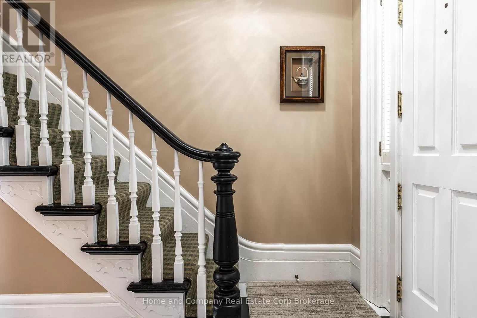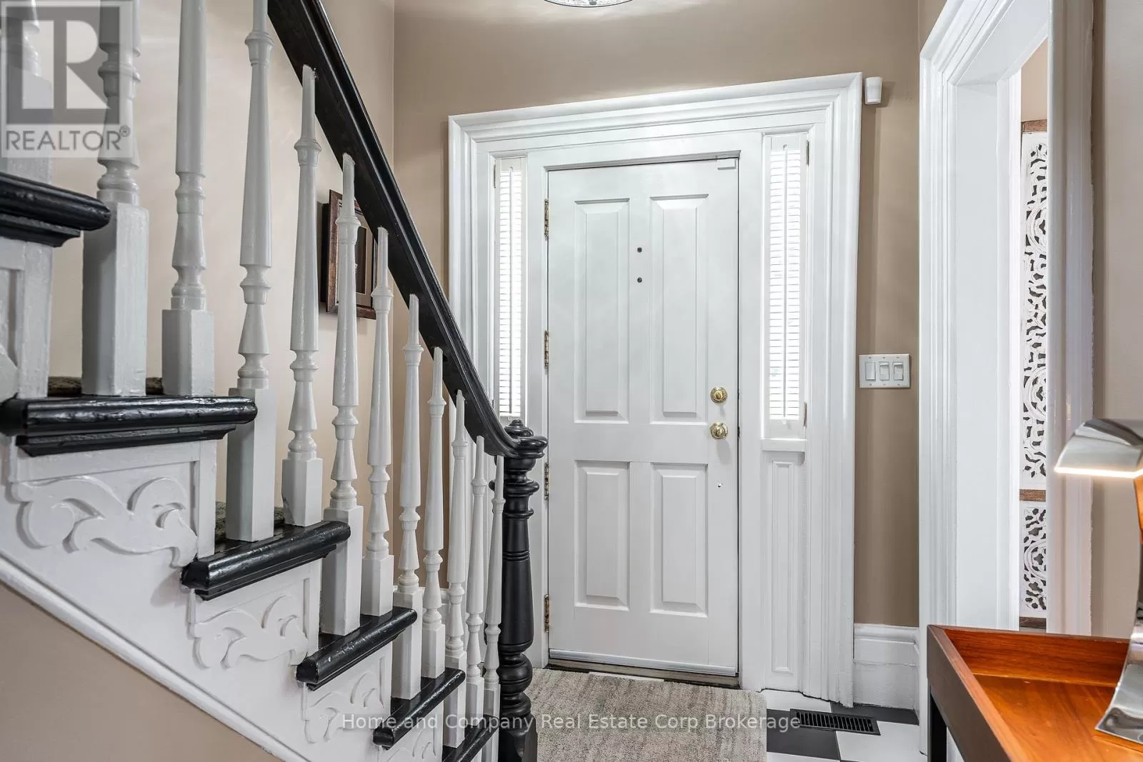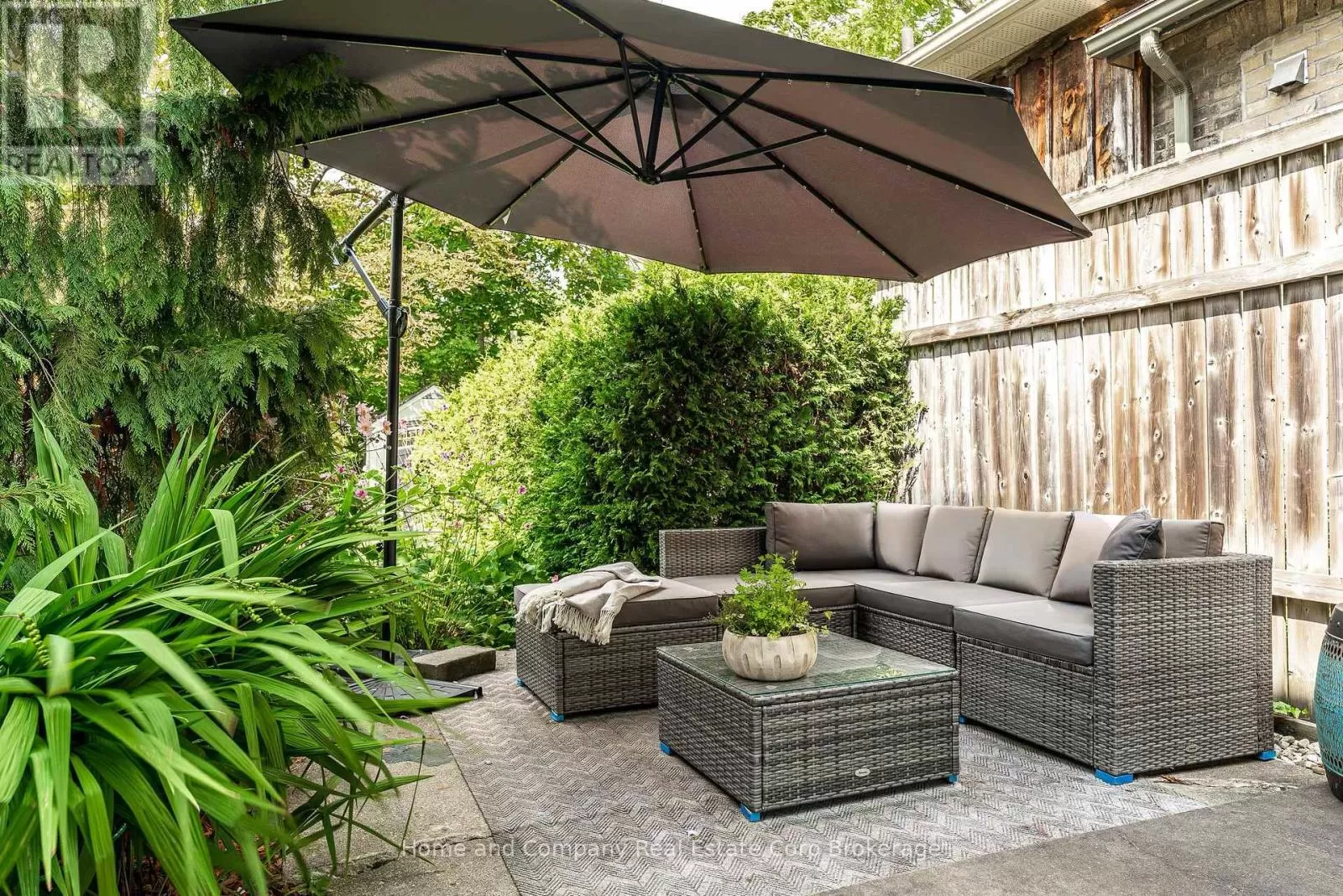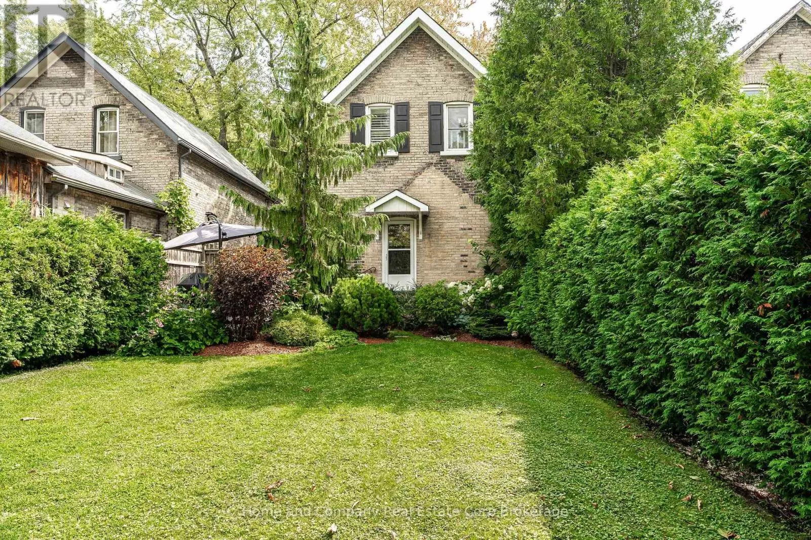 Cross Streets: St. David and Wellington street. ** Directions: South off of St. David. Welcome to this stunning yellow brick century home, perfectly blending timeless charm and modern upgrades, all just walking distance away from the vibrant Stratford downtown core. With beautiful curb appeal, original pine floors, and timeless trim throughout, this home is sure to impress. Step inside to an incredible foyer with stylish black and white tile flooring that flows seamlessly into the updated kitchen that includes a gas stove, quartz countertops, a granite sink, newer appliances, and direct access to a fully fenced backyard where you can enjoy year-round privacy on the spacious concrete patio and lots of green space for kids and pets. The incredible layout also features an inviting living room and a separate dining room perfect for family gatherings and entertaining. Upstairs, the oversized primary bedroom boasts ample closet space, complemented by a second well-sized bedroom. The home includes two updated bathrooms, including an upstairs laundry room for added convenience. Additional highlights include a large basement perfect for storage, shed in the backyard, all new eaves, and private parking. With everything updated and move-in ready, this beautifully maintained home is an exceptional opportunity to be yours! (id:27476)