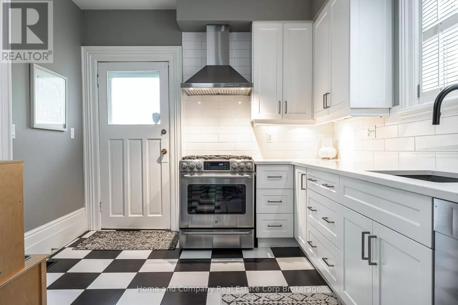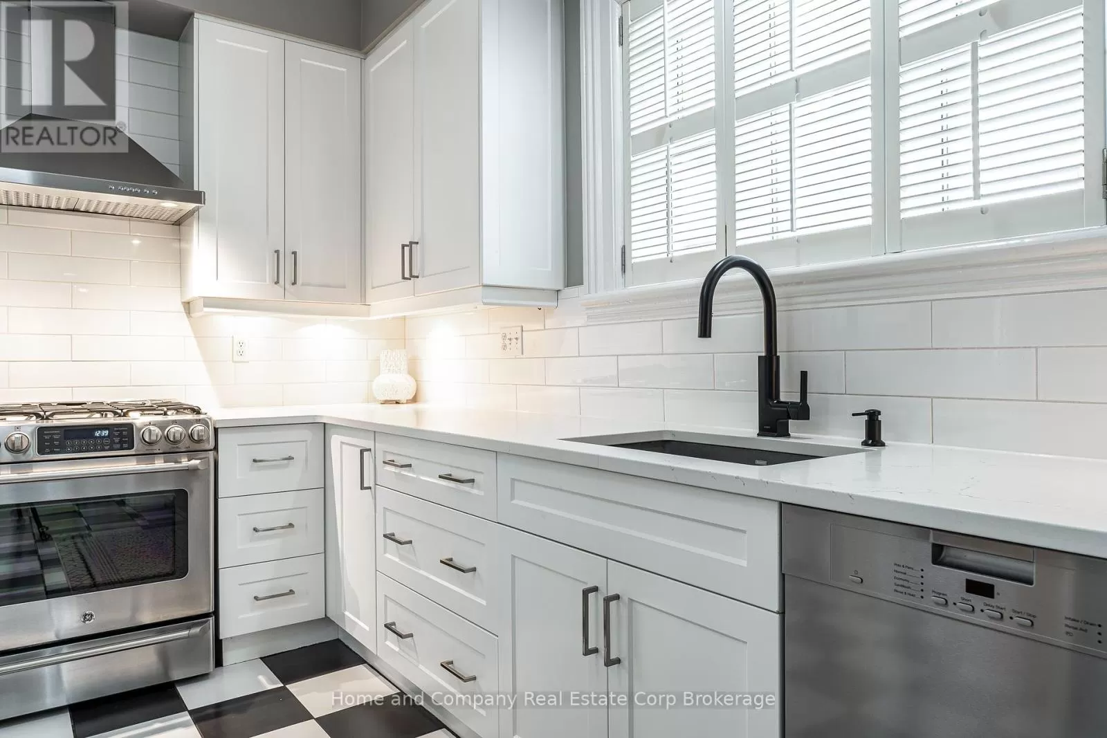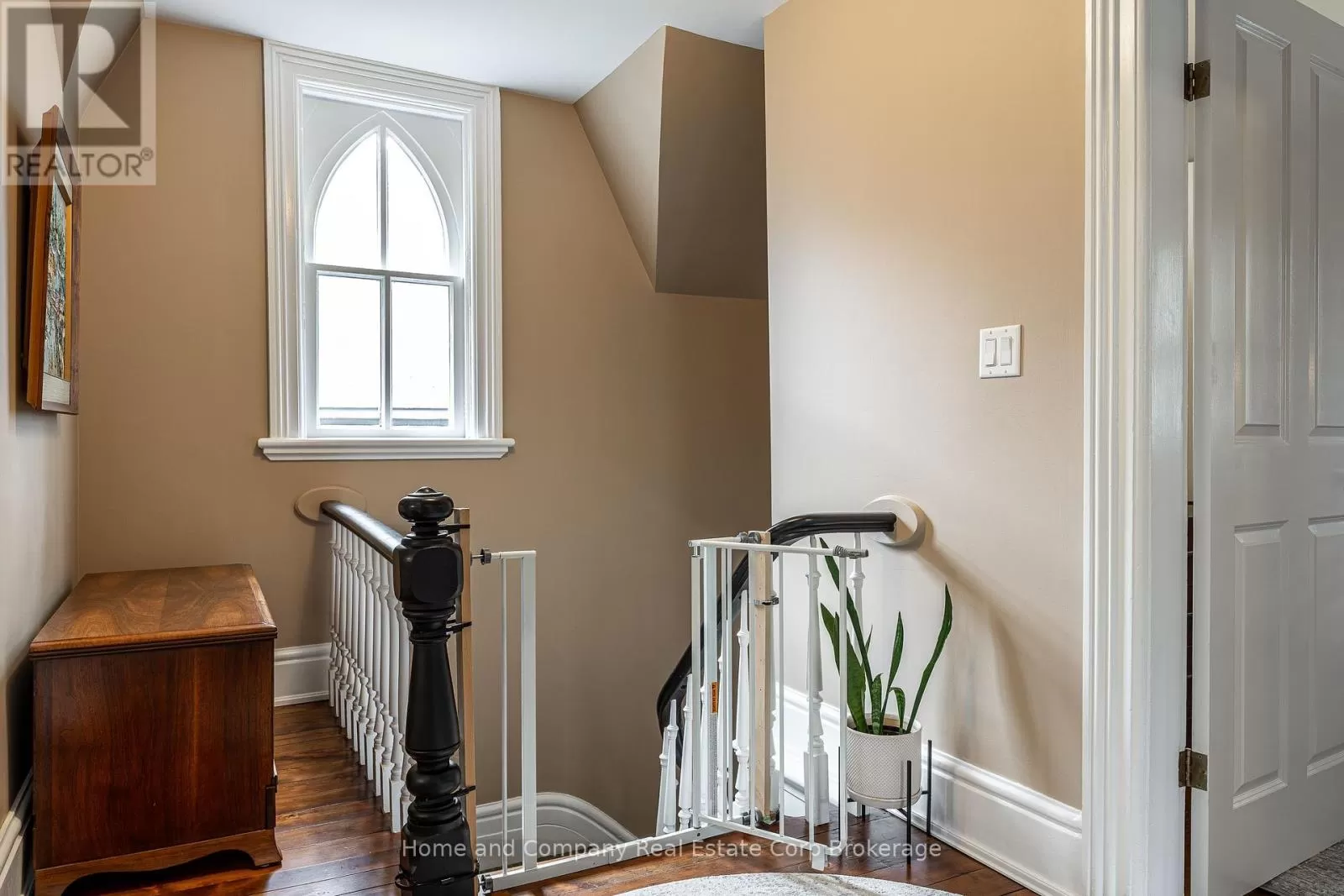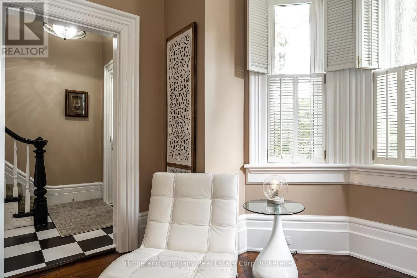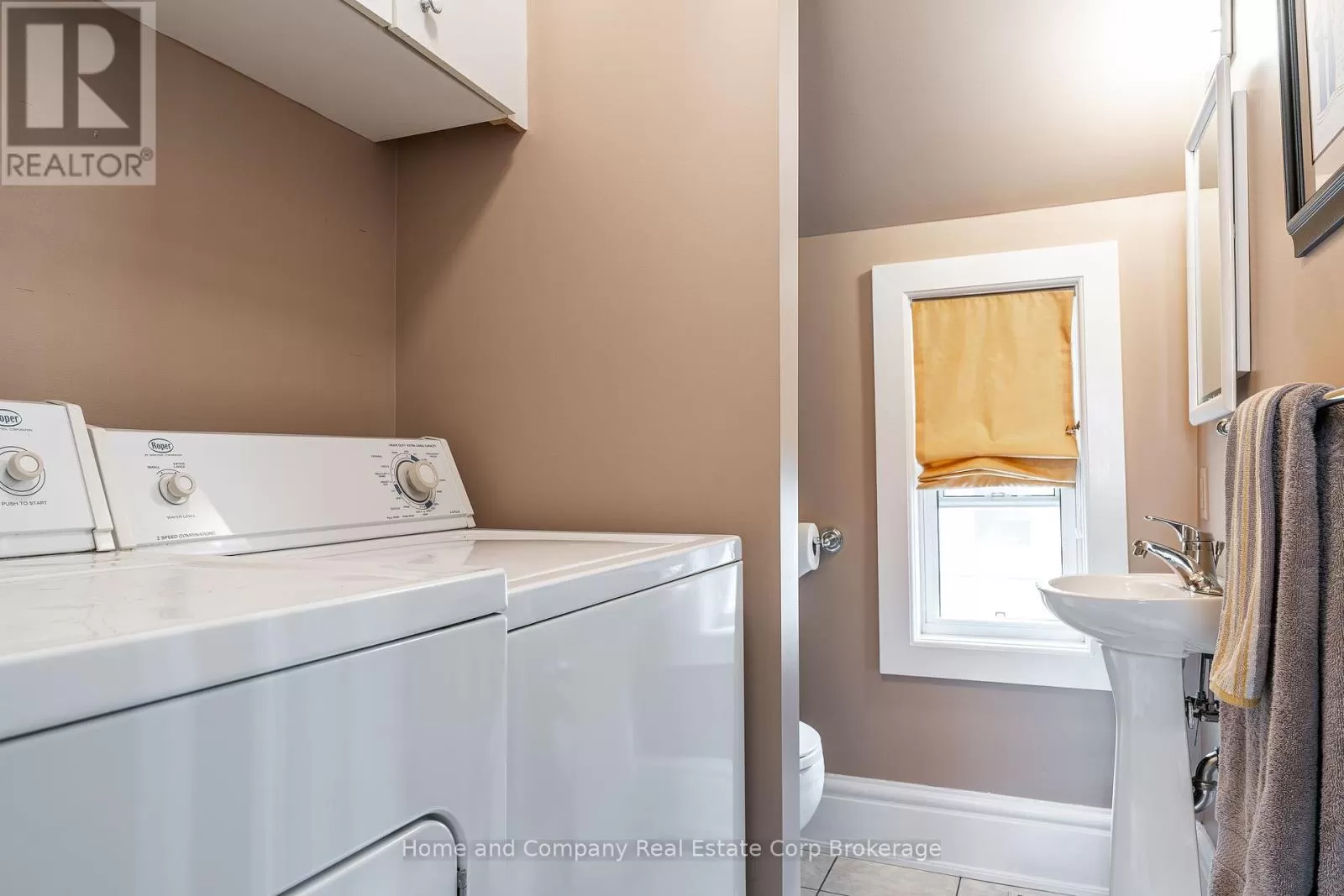 Cross Streets: St. David and Wellington street. ** Directions: South off of St. David. Welcome to this stunning yellow brick century home, perfectly blending timeless charm and modern upgrades, all just walking distance away from the vibrant Stratford downtown core. With beautiful curb appeal, original pine floors, and timeless trim throughout, this home is sure to impress. Step inside to an incredible foyer with stylish black and white tile flooring that flows seamlessly into the updated kitchen that includes a gas stove, quartz countertops, a granite sink, newer appliances, and direct access to a fully fenced backyard where you can enjoy year-round privacy on the spacious concrete patio and lots of green space for kids and pets. The incredible layout also features an inviting living room and a separate dining room perfect for family gatherings and entertaining. Upstairs, the oversized primary bedroom boasts ample closet space, complemented by a second well-sized bedroom. The home includes two updated bathrooms, including an upstairs laundry room for added convenience. Additional highlights include a large basement perfect for storage, shed in the backyard, all new eaves, and private parking. With everything updated and move-in ready, this beautifully maintained home is an exceptional opportunity to be yours! (id:27476)
