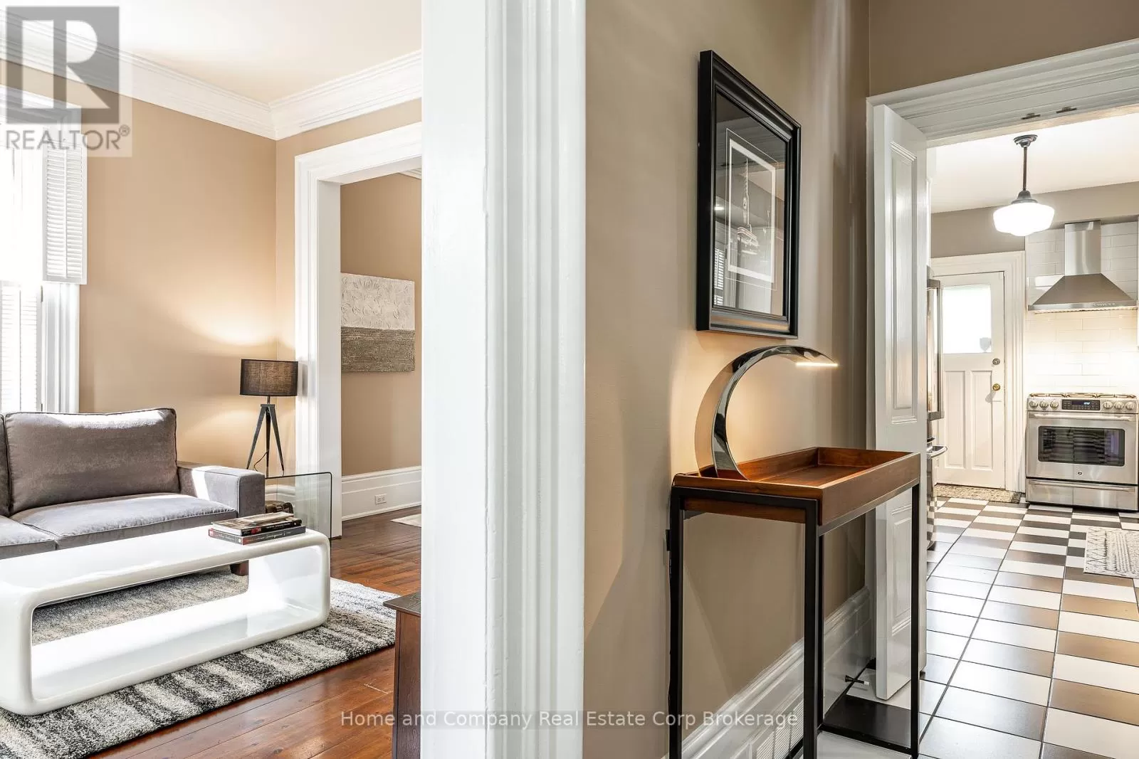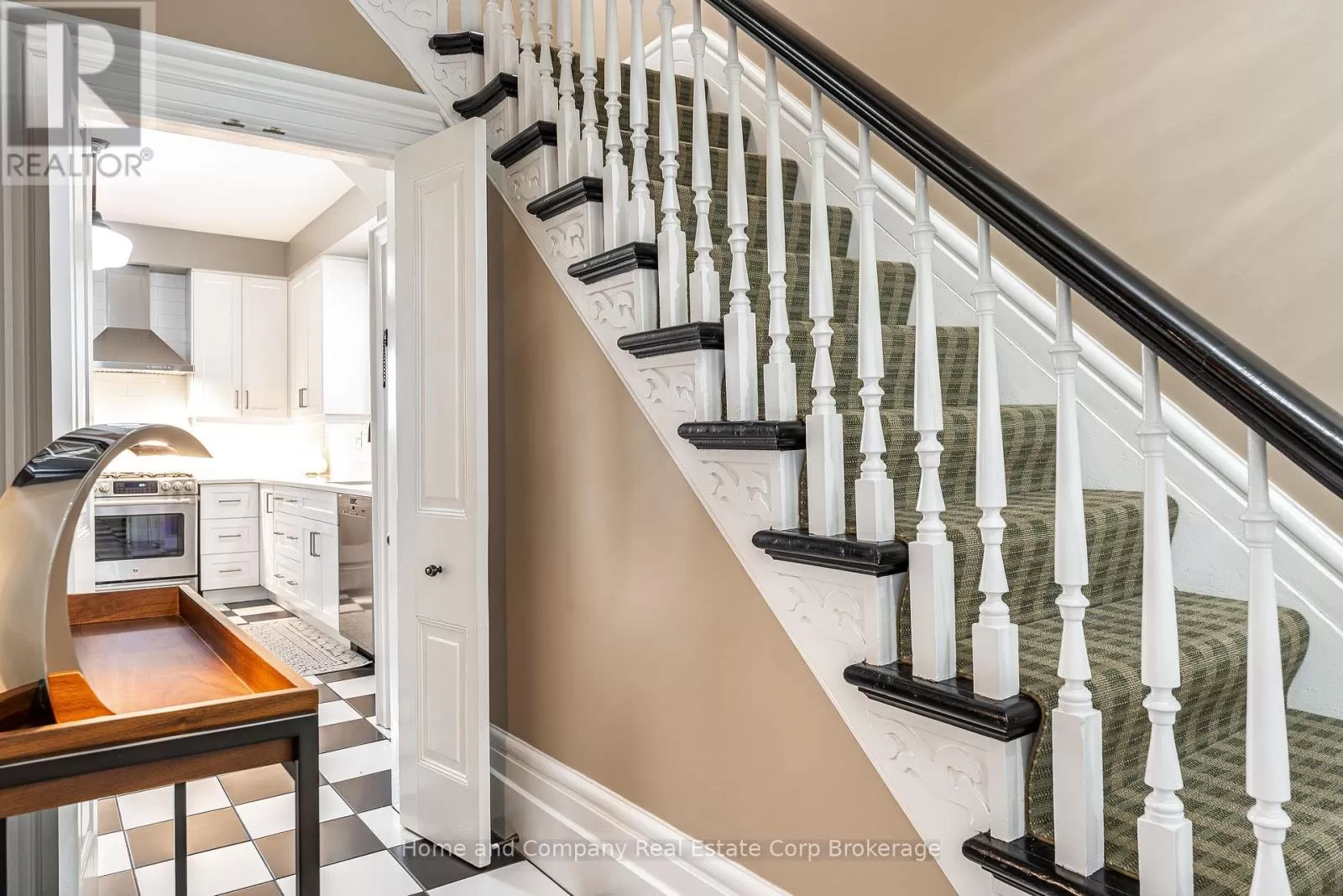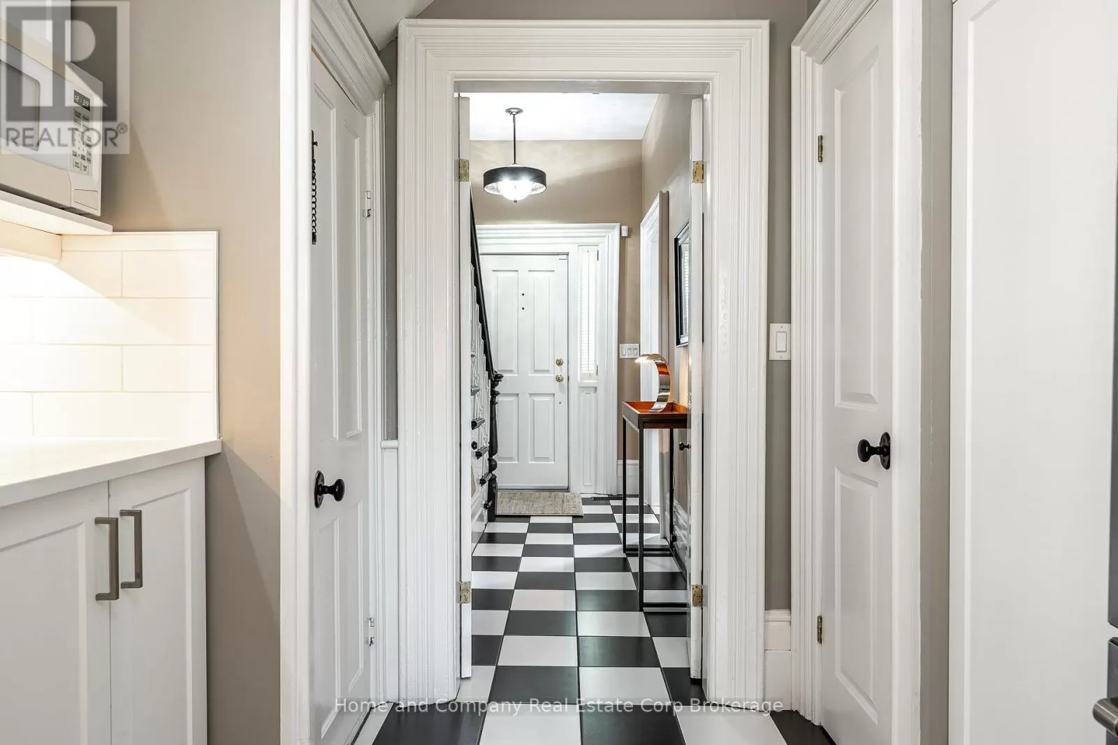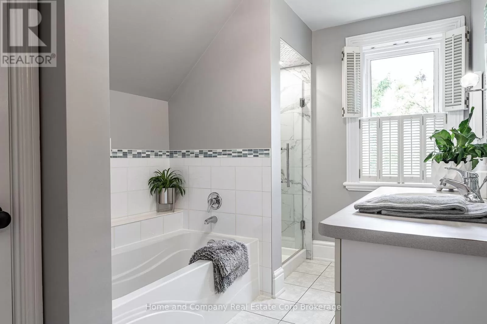 Cross Streets: St. David and Wellington street. ** Directions: South off of St. David. Welcome to this stunning yellow brick century home, perfectly blending timeless charm and modern upgrades, all just walking distance away from the vibrant Stratford downtown core. With beautiful curb appeal, original pine floors, and timeless trim throughout, this home is sure to impress. Step inside to an incredible foyer with stylish black and white tile flooring that flows seamlessly into the updated kitchen that includes a gas stove, quartz countertops, a granite sink, newer appliances, and direct access to a fully fenced backyard where you can enjoy year-round privacy on the spacious concrete patio and lots of green space for kids and pets. The incredible layout also features an inviting living room and a separate dining room perfect for family gatherings and entertaining. Upstairs, the oversized primary bedroom boasts ample closet space, complemented by a second well-sized bedroom. The home includes two updated bathrooms, including an upstairs laundry room for added convenience. Additional highlights include a large basement perfect for storage, shed in the backyard, all new eaves, and private parking. With everything updated and move-in ready, this beautifully maintained home is an exceptional opportunity to be yours! (id:27476)