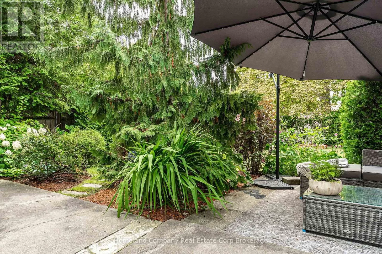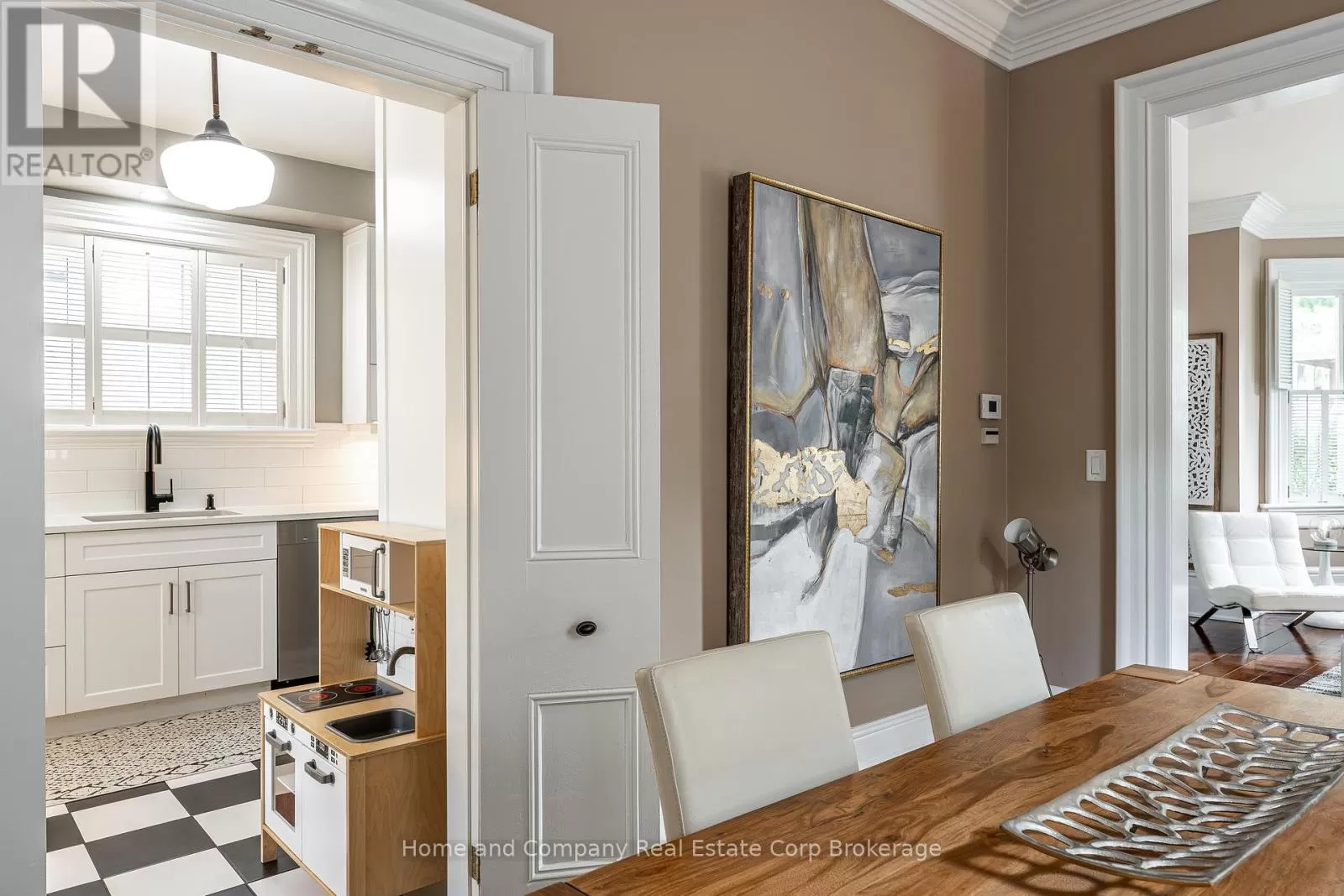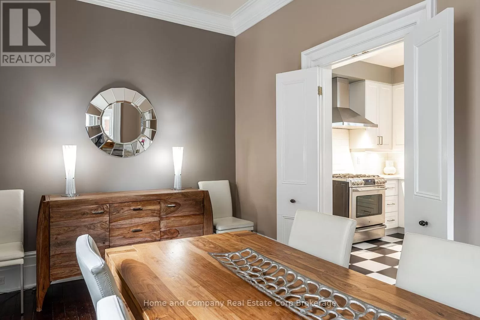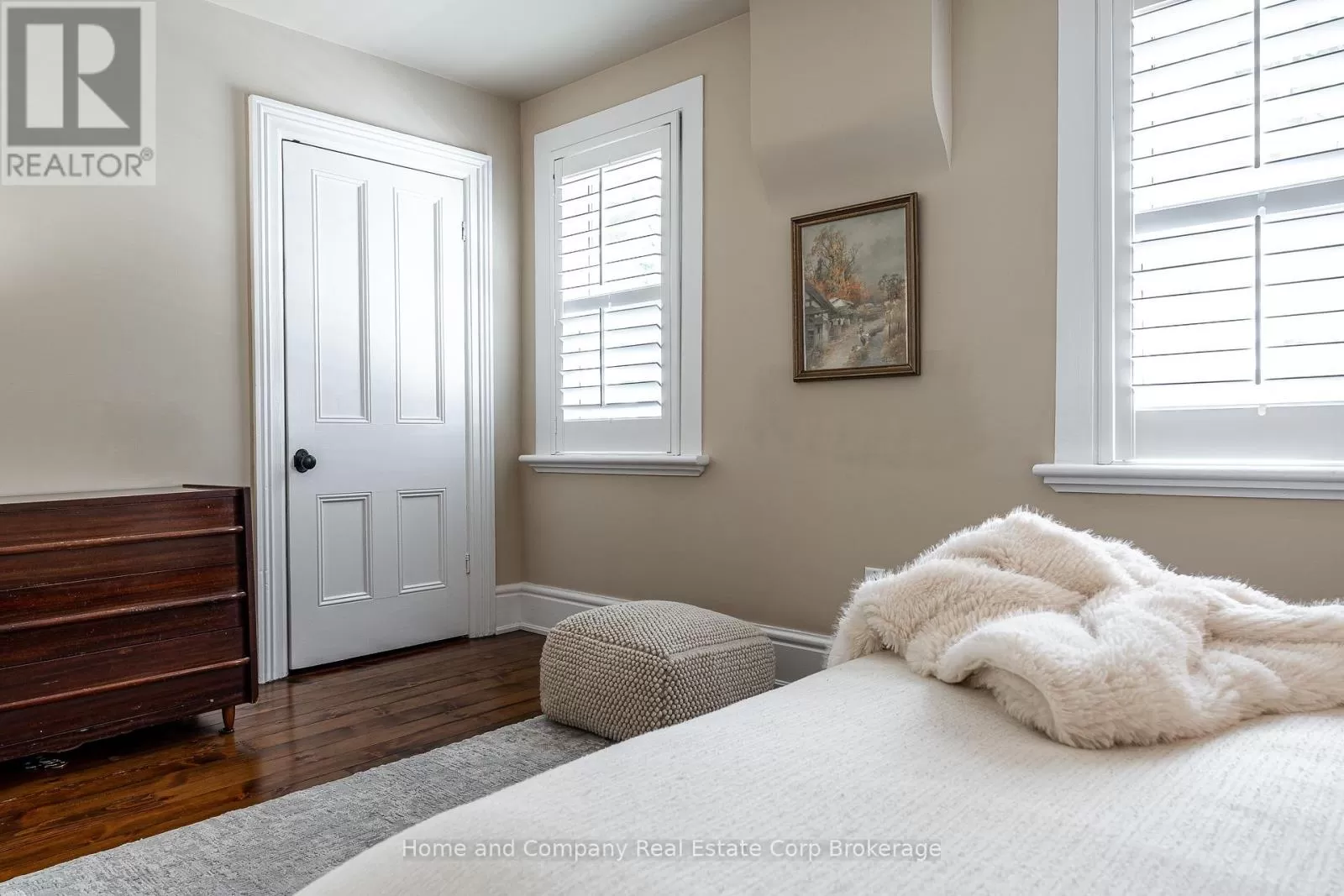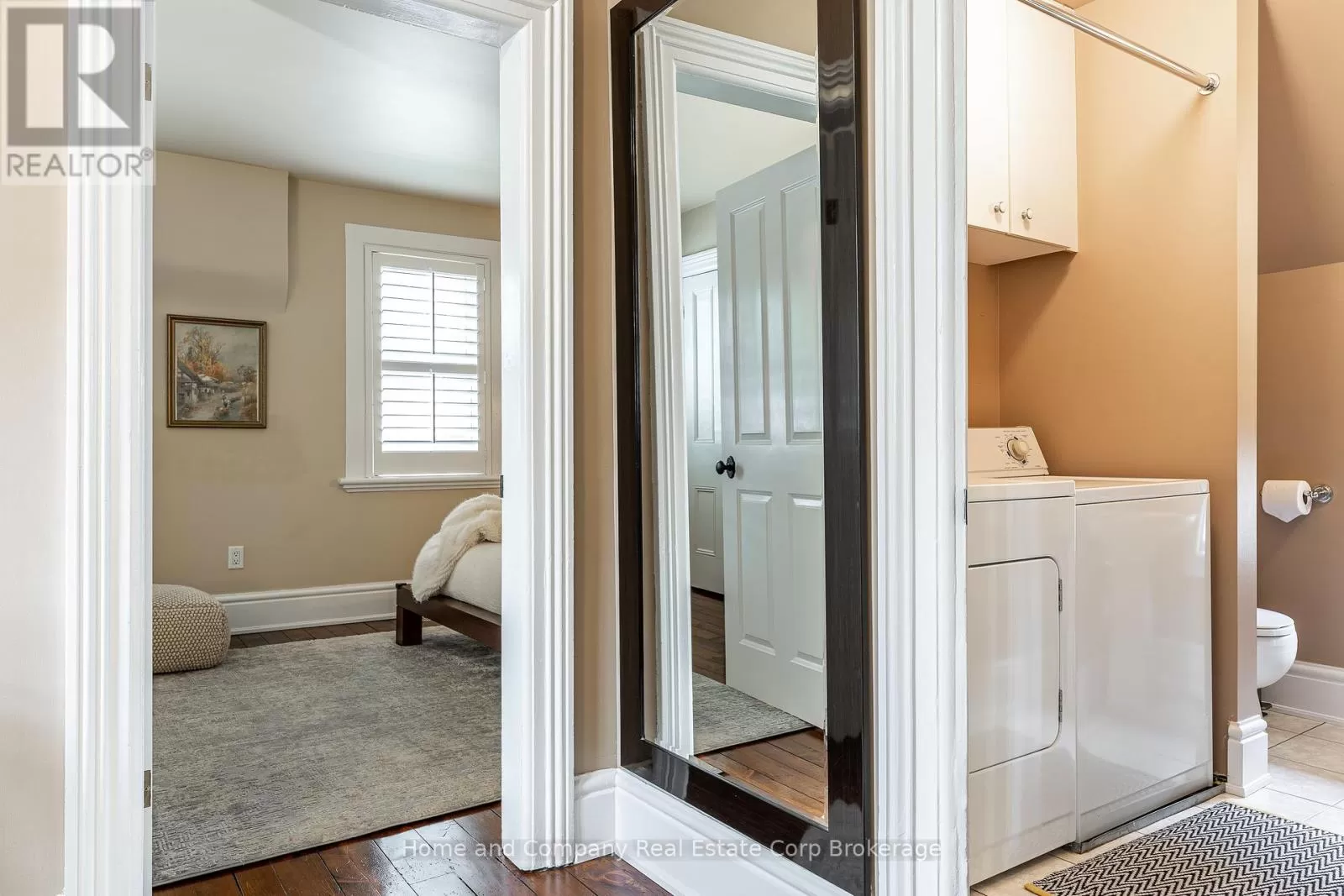 Cross Streets: St. David and Wellington street. ** Directions: South off of St. David. Welcome to this stunning yellow brick century home, perfectly blending timeless charm and modern upgrades, all just walking distance away from the vibrant Stratford downtown core. With beautiful curb appeal, original pine floors, and timeless trim throughout, this home is sure to impress. Step inside to an incredible foyer with stylish black and white tile flooring that flows seamlessly into the updated kitchen that includes a gas stove, quartz countertops, a granite sink, newer appliances, and direct access to a fully fenced backyard where you can enjoy year-round privacy on the spacious concrete patio and lots of green space for kids and pets. The incredible layout also features an inviting living room and a separate dining room perfect for family gatherings and entertaining. Upstairs, the oversized primary bedroom boasts ample closet space, complemented by a second well-sized bedroom. The home includes two updated bathrooms, including an upstairs laundry room for added convenience. Additional highlights include a large basement perfect for storage, shed in the backyard, all new eaves, and private parking. With everything updated and move-in ready, this beautifully maintained home is an exceptional opportunity to be yours! (id:27476)
