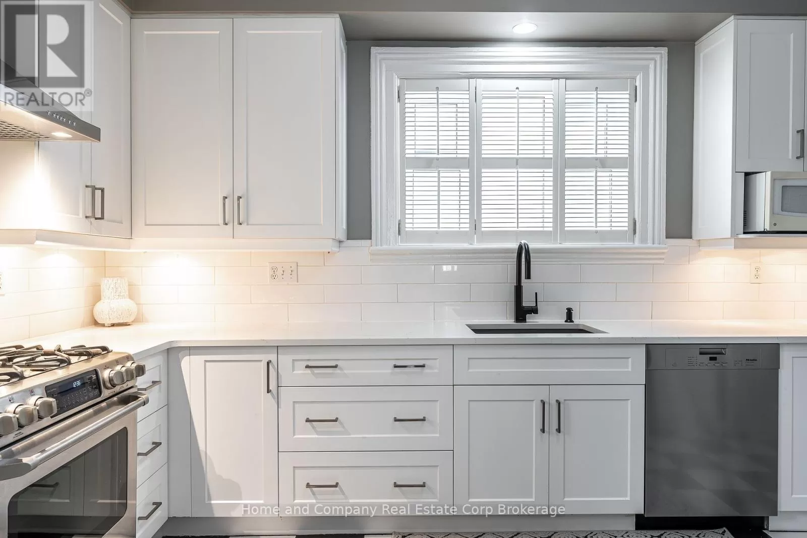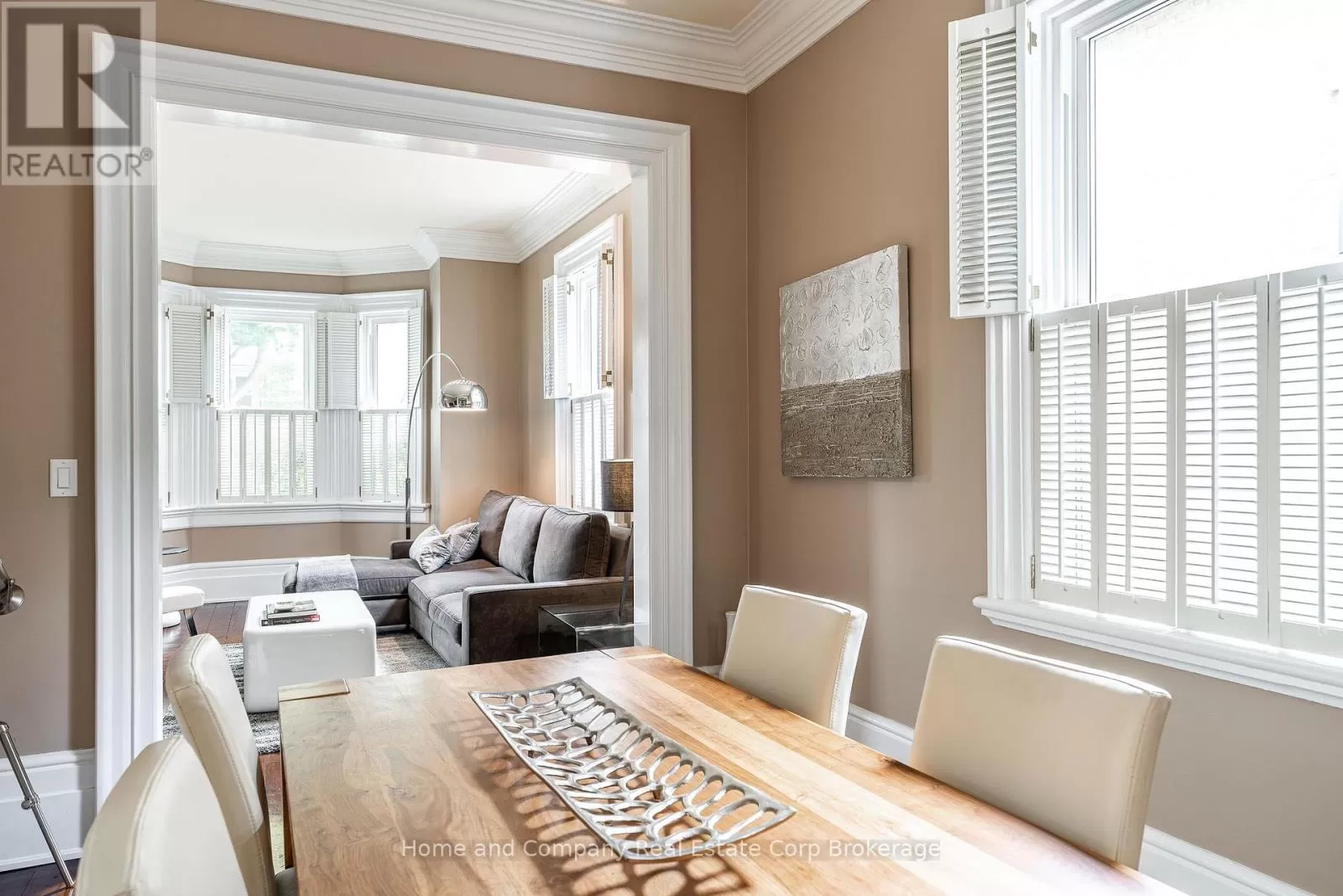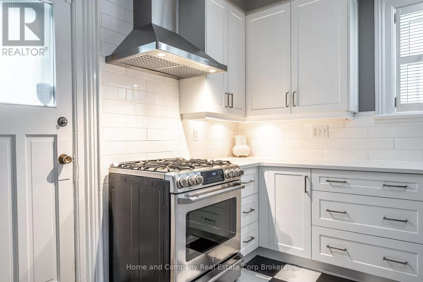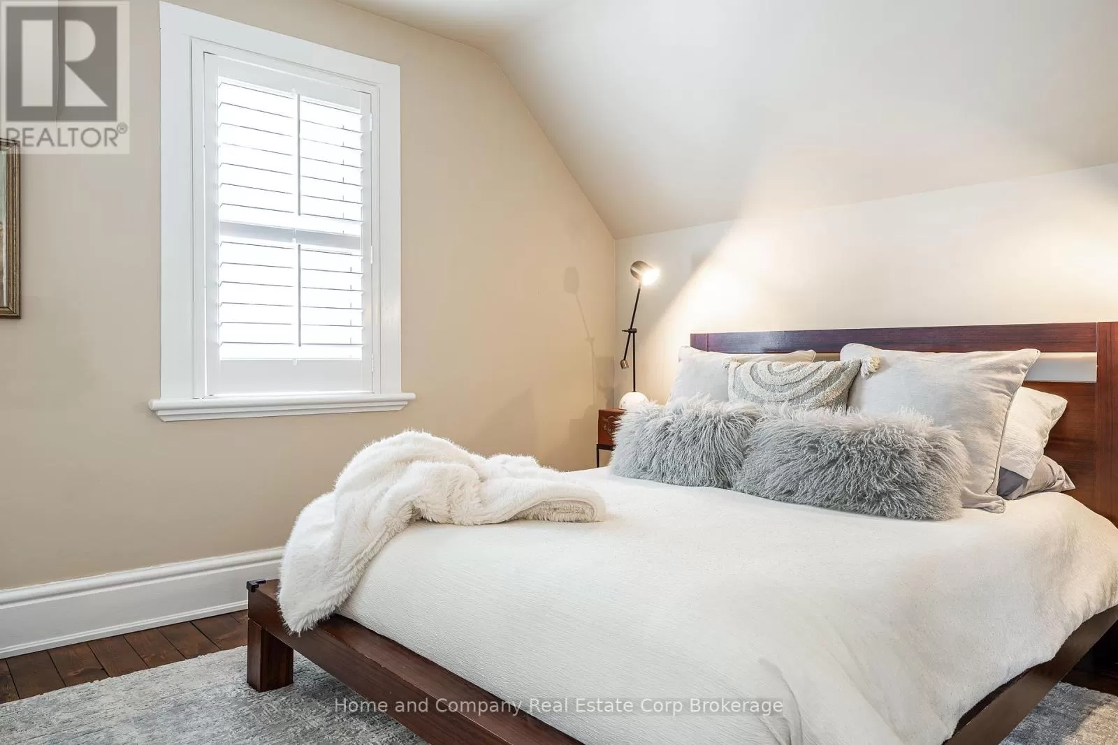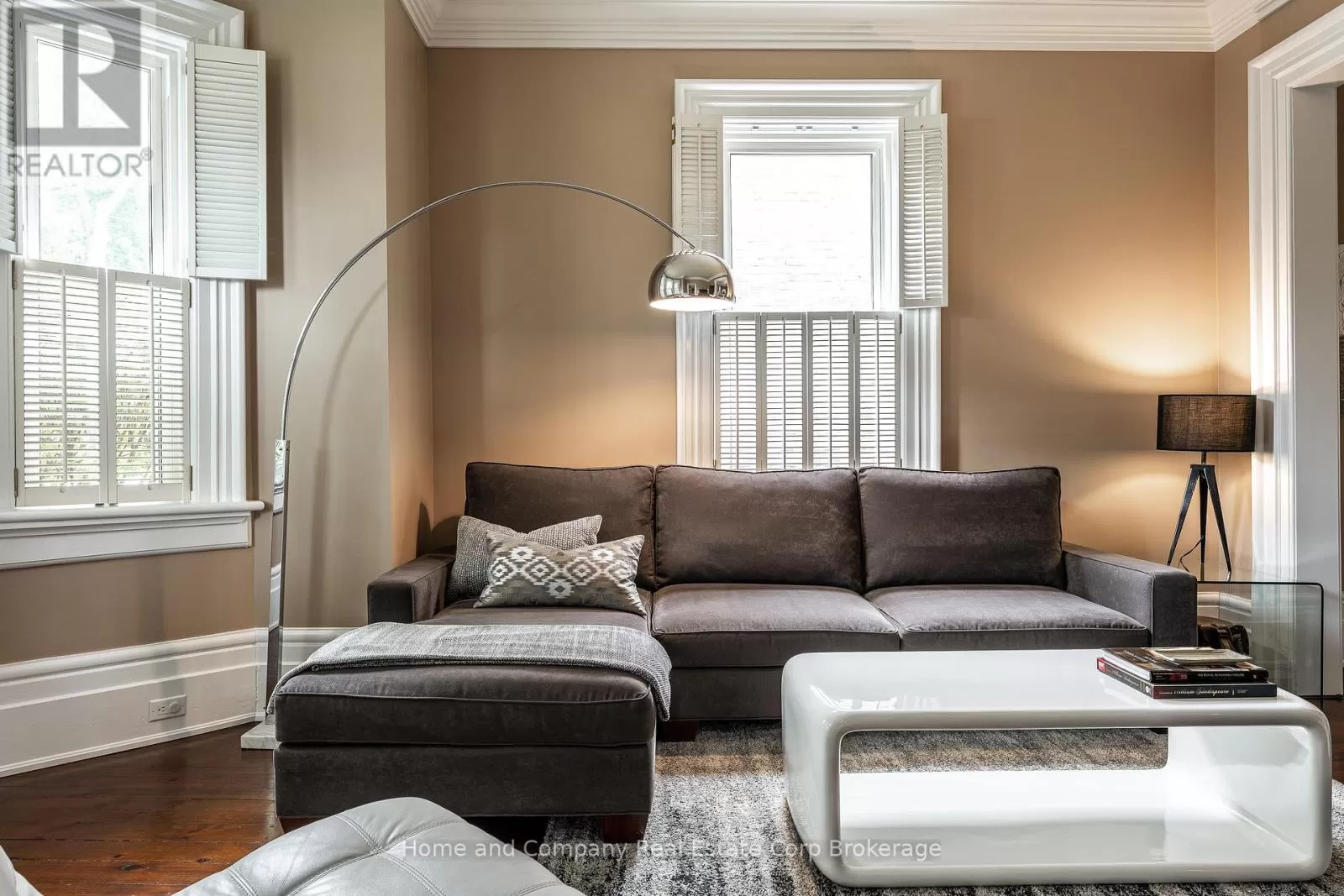 Cross Streets: St. David and Wellington street. ** Directions: South off of St. David. Welcome to this stunning yellow brick century home, perfectly blending timeless charm and modern upgrades, all just walking distance away from the vibrant Stratford downtown core. With beautiful curb appeal, original pine floors, and timeless trim throughout, this home is sure to impress. Step inside to an incredible foyer with stylish black and white tile flooring that flows seamlessly into the updated kitchen that includes a gas stove, quartz countertops, a granite sink, newer appliances, and direct access to a fully fenced backyard where you can enjoy year-round privacy on the spacious concrete patio and lots of green space for kids and pets. The incredible layout also features an inviting living room and a separate dining room perfect for family gatherings and entertaining. Upstairs, the oversized primary bedroom boasts ample closet space, complemented by a second well-sized bedroom. The home includes two updated bathrooms, including an upstairs laundry room for added convenience. Additional highlights include a large basement perfect for storage, shed in the backyard, all new eaves, and private parking. With everything updated and move-in ready, this beautifully maintained home is an exceptional opportunity to be yours! (id:27476)