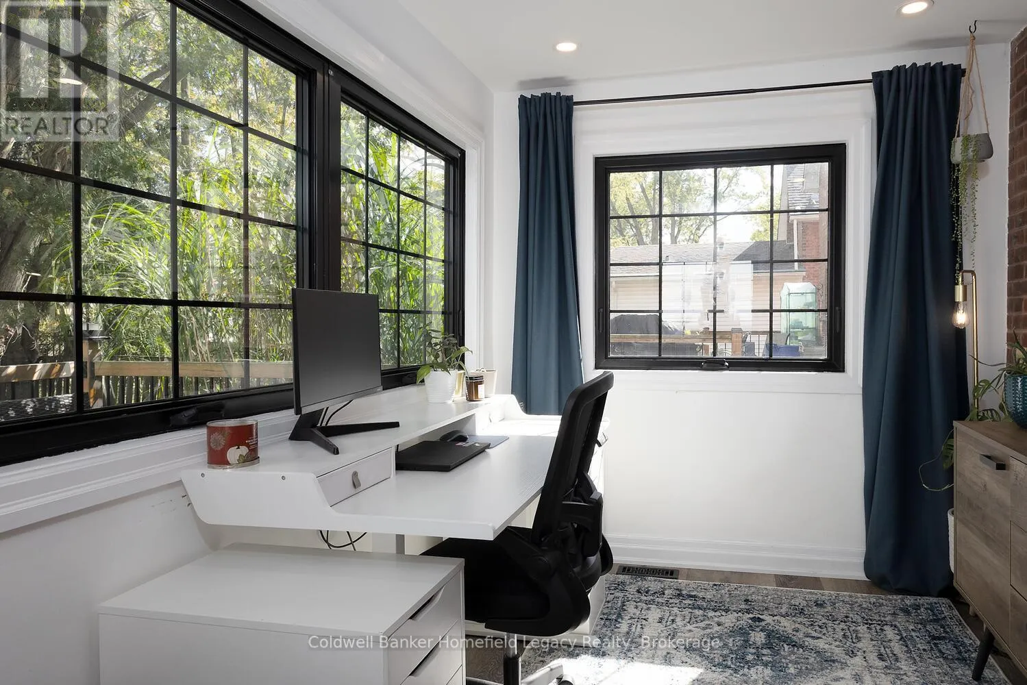 Cross Streets: Whitelock and McNab. ** Directions: Downie to Whitelock to McNab. Welcome to 95 McNab Street! This beautifully updated 2-bedroom, 1.5-bath home blends classic brick charm with modern style and thoughtful upgrades throughout. Step inside to find a bright, open-concept main floor featuring a stunning custom kitchen with two-tone cabinetry, quartz countertops, and an island with seating perfect for entertaining or casual family meals.The inviting living area offers a cozy electric fireplace and built-in shelving, while the adjoining dining nook provides additional storage and a sunny spot for morning coffee. A convenient main-floor laundry and stylish powder room complete this level.Upstairs, you'll find two spacious bedrooms with vaulted ceilings and a full bath. The layout offers comfort and functionality for couples, small families, or downsizers alike.Outside, enjoy a welcoming front porch, a detached garage, and a private backyard surrounded by mature trees. Located in a quiet, walkable neighbourhood close to downtown Stratford, schools, and parks.This home combines modern convenience with timeless character. Don't miss your chance to call 95 McNab Street home! (id:27476)
