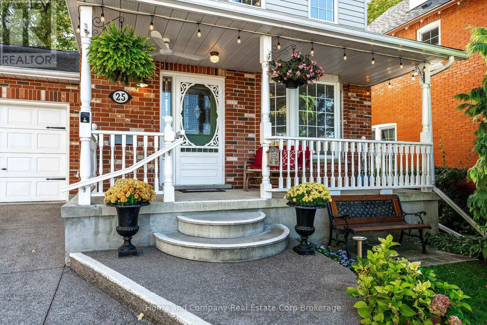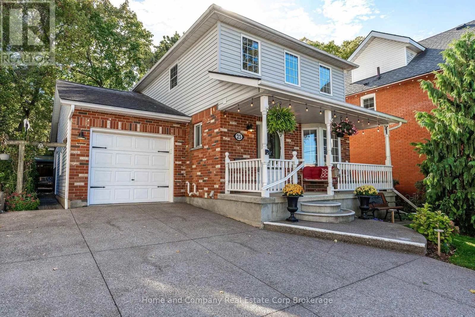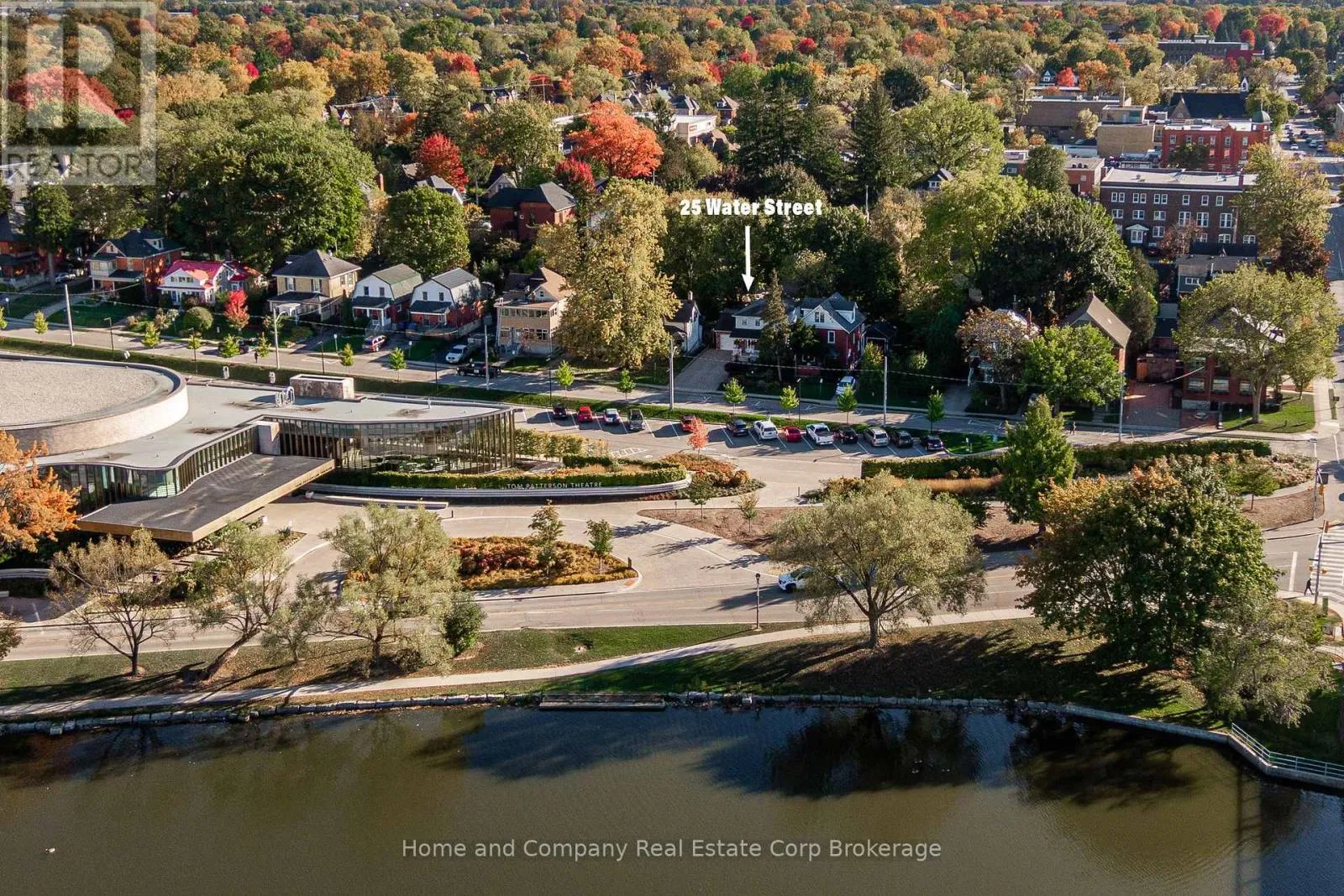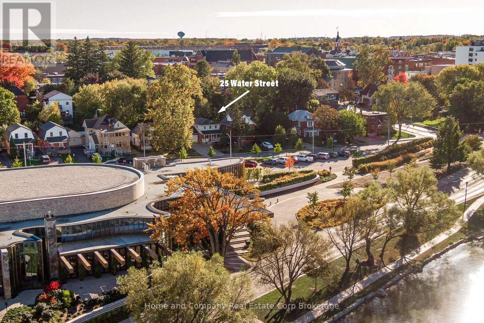 Cross Streets: Waterloo St. ** Directions: East on Water St from Waterloo St. Welcome to 25 Water Street, perfectly situated just steps from Stratford's beautiful Avon River and directly across from the world-renowned Tom Patterson Theatre. Formerly known as The Harrington House Bed and Breakfast, this well-appointed 5-bedroom, 4.5-bath home, built in 1995, now serves as a stunning residential property - ideal for families, entertainers, or those dreaming of a live/work opportunity in one of Stratford's most sought-after locations. The property features an extra deep single-car attached garage with four convenient entry points and ample space for a small workshop or storage, along with comfortable parking for up to six cars in the driveway, a rare find in this desirable downtown setting. Inside, a welcoming sitting room with serene river views offers a flexible space for an office or guest room, while across the foyer, a recently updated powder room adds a stylish touch. The open-concept kitchen and dining area form the heart of the home, perfect for gatherings and entertaining. The adjoining living room features tall ceilings, skylights, and large windows that flood the space with natural light. A versatile flex room, located beside the living area, offers even more possibilities, serving as a family room, home office, or space for a small business, with direct access to both the garage and the private backyard. Upstairs, three spacious bedrooms include two with ensuites, plus an additional full bath. The primary suite showcases peaceful river views and a beautifully updated ensuite retreat. The finished lower level offers a guest suite complete with a bedroom, 4-piece bath, walk-in closet, and rec room-ideal for extended family or host living quarters. Outside, the low-maintenance backyard has a private courtyard feel with a covered gazebo and garden shed for added workspace and storage. A rare opportunity in the heart of Stratford's downtown core, just steps from boutique shopping, fine dining, scenic river walks, and world-class theatre. (id:27476)