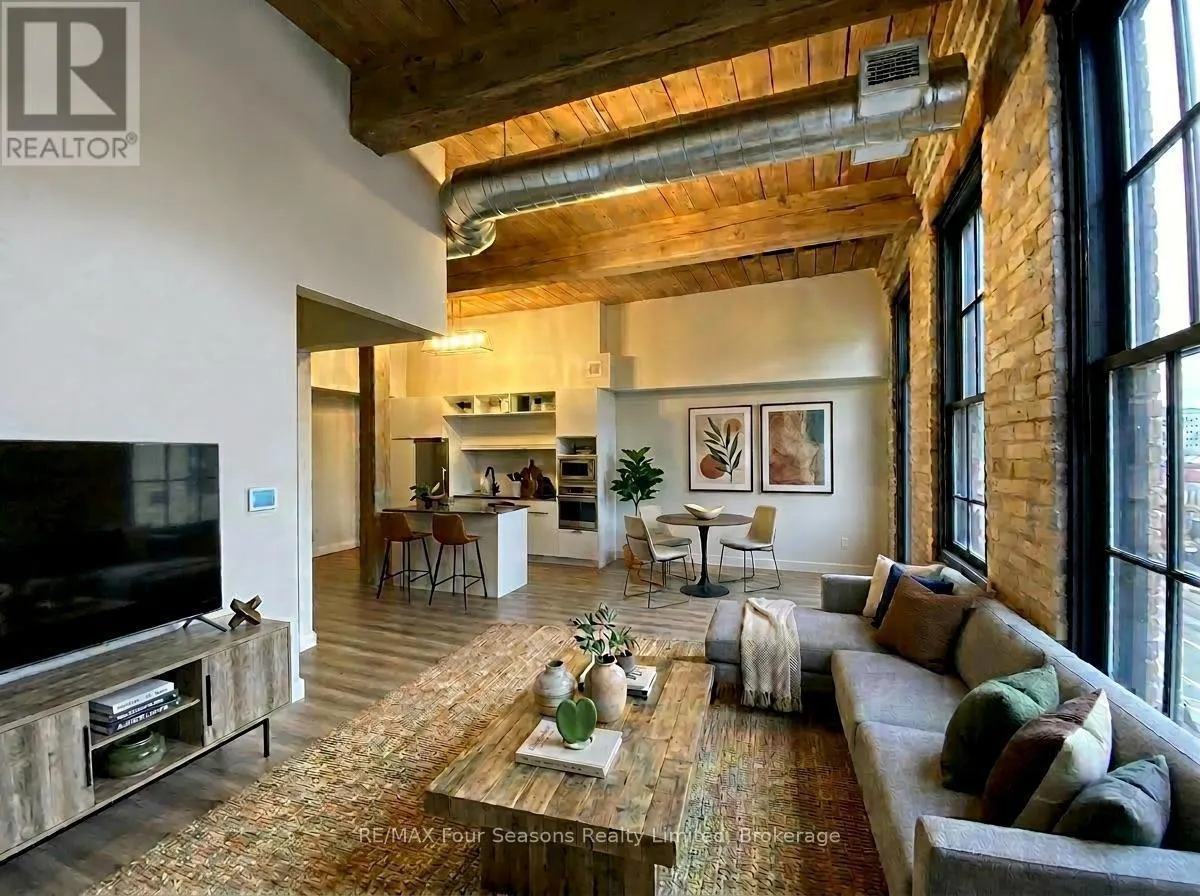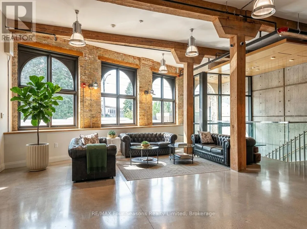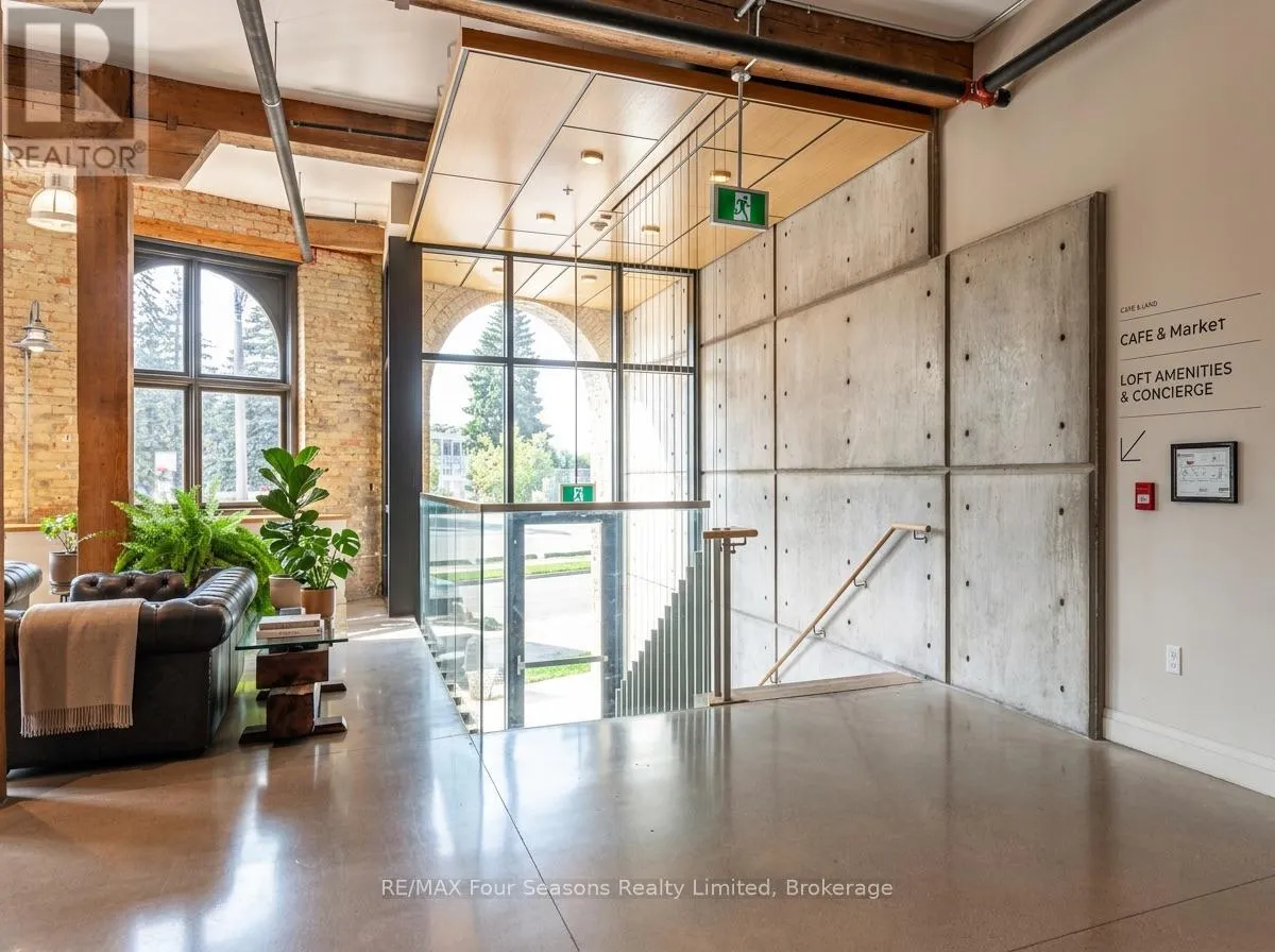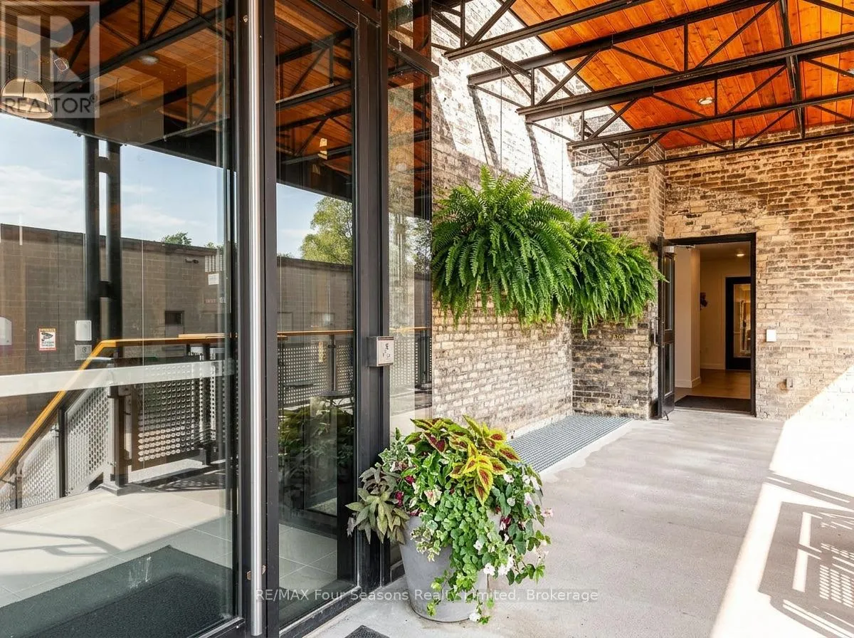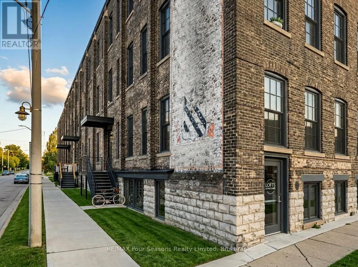 Cross Streets: Falstaff Street turn on Downie Street. ** Directions: From Ontario Street (Hwy 7/8), head south on Downie Street. Introducing a rare and storied offering in the heart of Stratford-a true loft residence within the iconic Bradshaw Lofts. Distinguished as the ONLY suite in the building with its own private entrance and exclusive terrace, this residence offers a level of privacy and individuality rarely found. Originally built in 1903 as a historic confectionery factory, the building has been thoughtfully transformed into a boutique loft conversion, seamlessly blending heritage character with modern design. Inside, the 627 sq ft interior is a striking expression of industrial elegance. Soaring 12-foot ceilings, exposed brick, and original timber beams create a dramatic architectural canvas, complemented by refined contemporary finishes including quartz countertops, hardwood flooring, in-suite laundry, and Energy Star integrated appliances. Expansive 8-foot windows flood the space with natural light, enhancing its open, gallery-like ambiance. Just steps from Brch & Wyn and a short stroll to Stratford's vibrant downtown-renowned for its world-class theatre, dining, and boutique shopping. Secure, well-managed building with video-monitored common areas. Condo fees include gas, water, and internet for added ease. Permitted short-term rental use offers exceptional lifestyle flexibility and income potential. (id:27476)