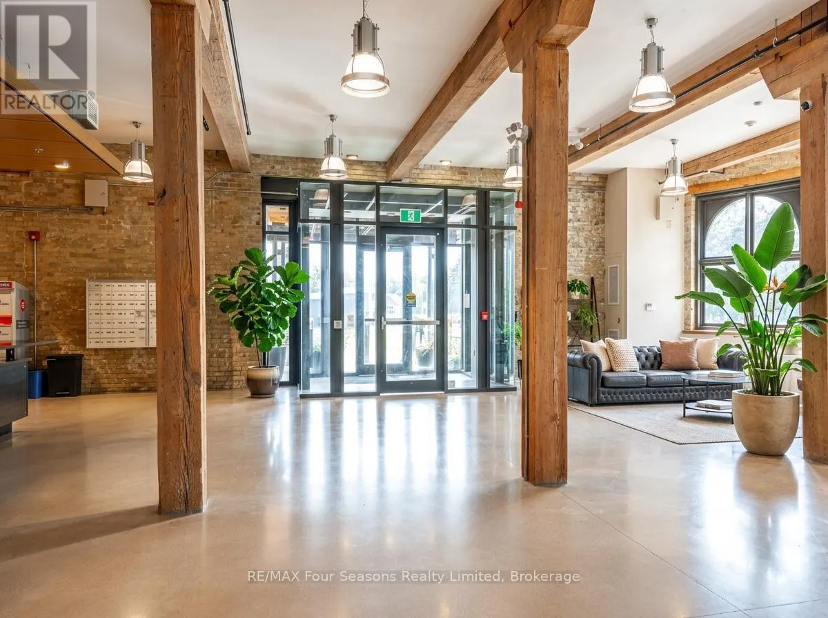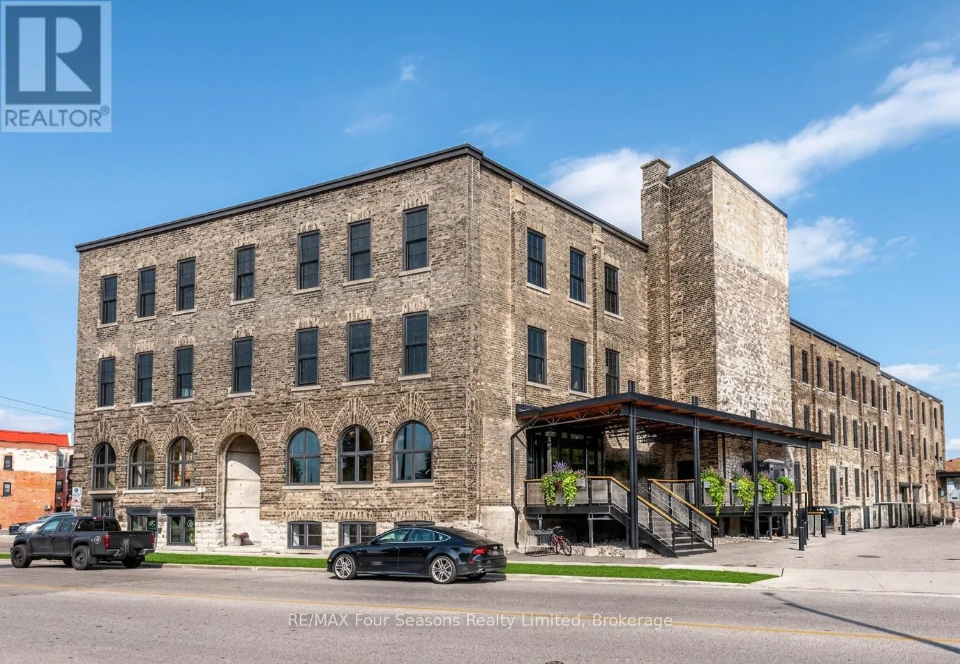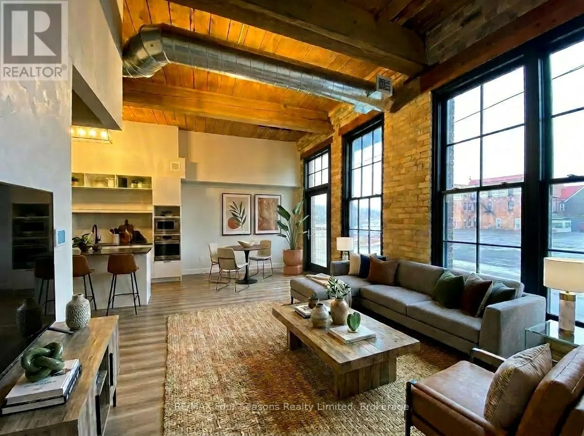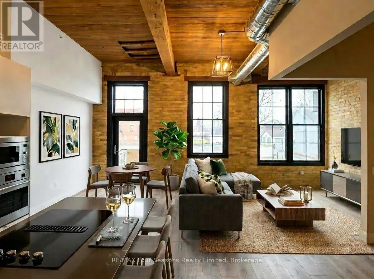 Cross Streets: Falstaff Street turn on Downie Street. ** Directions: From Ontario Street (Hwy 7/8), head south on Downie Street. Introducing a rare and storied offering in the heart of Stratford-a true loft residence within the iconic Bradshaw Lofts. Distinguished as the ONLY suite in the building with its own private entrance and exclusive terrace, this residence offers a level of privacy and individuality rarely found. Originally built in 1903 as a historic confectionery factory, the building has been thoughtfully transformed into a boutique loft conversion, seamlessly blending heritage character with modern design. Inside, the 627 sq ft interior is a striking expression of industrial elegance. Soaring 12-foot ceilings, exposed brick, and original timber beams create a dramatic architectural canvas, complemented by refined contemporary finishes including quartz countertops, hardwood flooring, in-suite laundry, and Energy Star integrated appliances. Expansive 8-foot windows flood the space with natural light, enhancing its open, gallery-like ambiance. Just steps from Brch & Wyn and a short stroll to Stratford's vibrant downtown-renowned for its world-class theatre, dining, and boutique shopping. Secure, well-managed building with video-monitored common areas. Condo fees include gas, water, and internet for added ease. Permitted short-term rental use offers exceptional lifestyle flexibility and income potential. (id:27476)