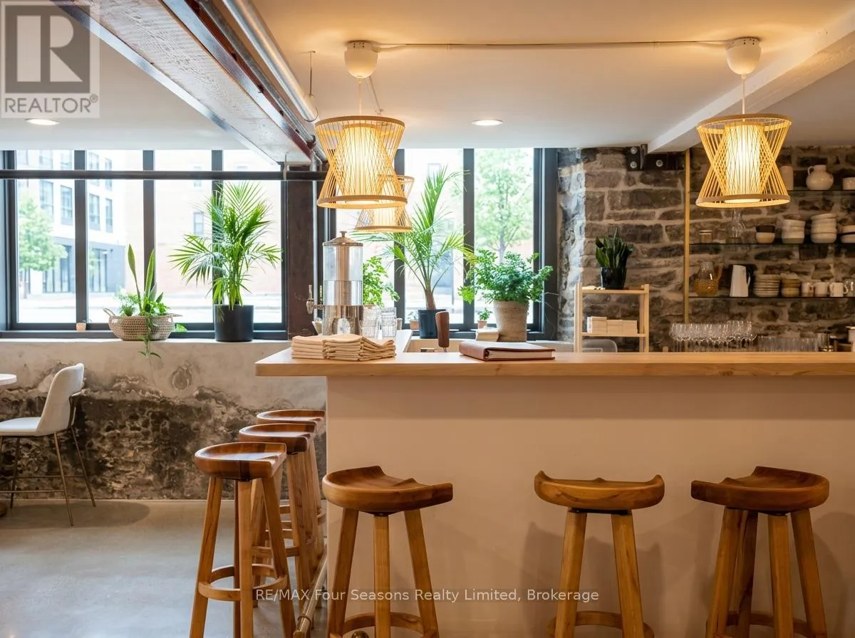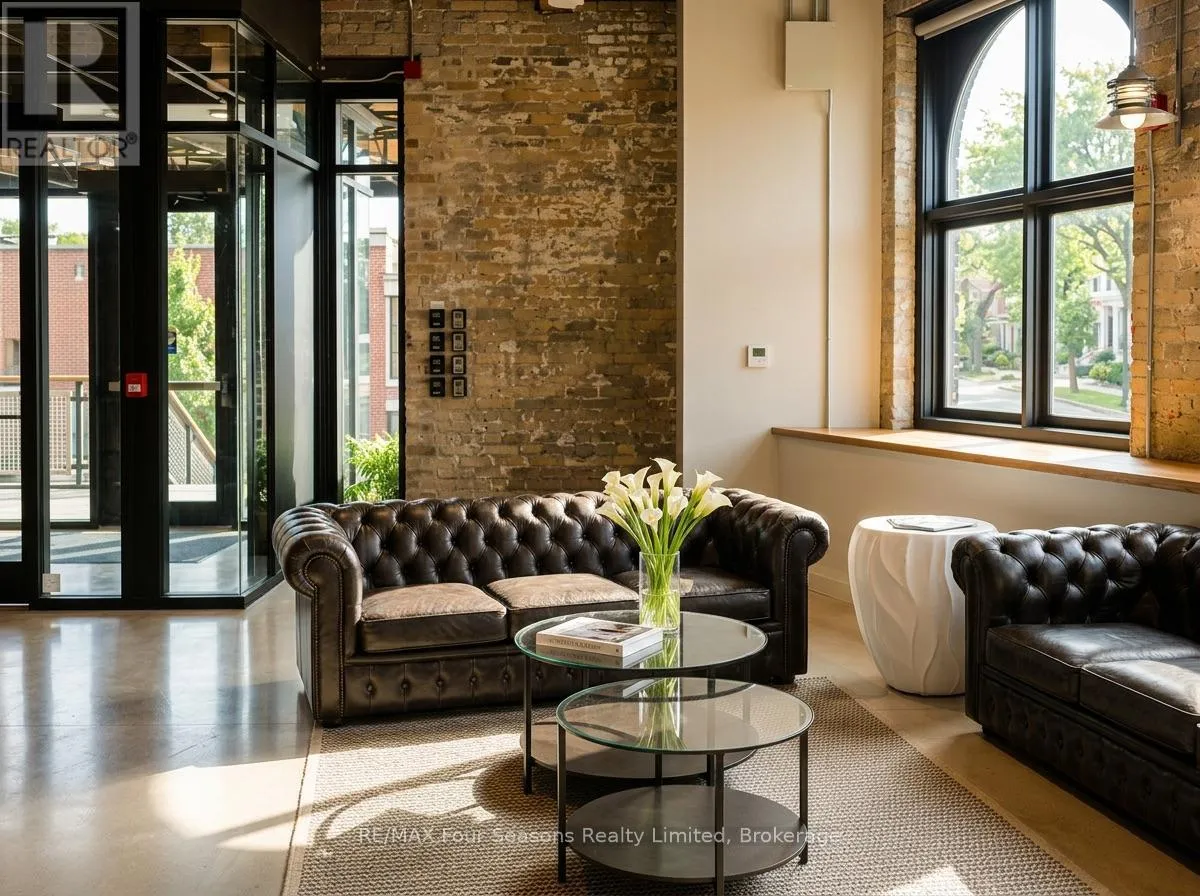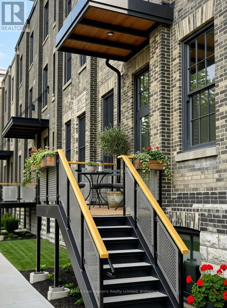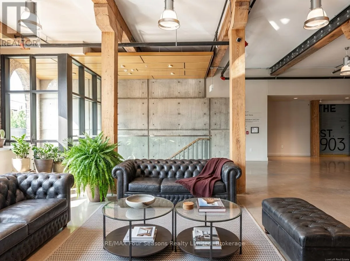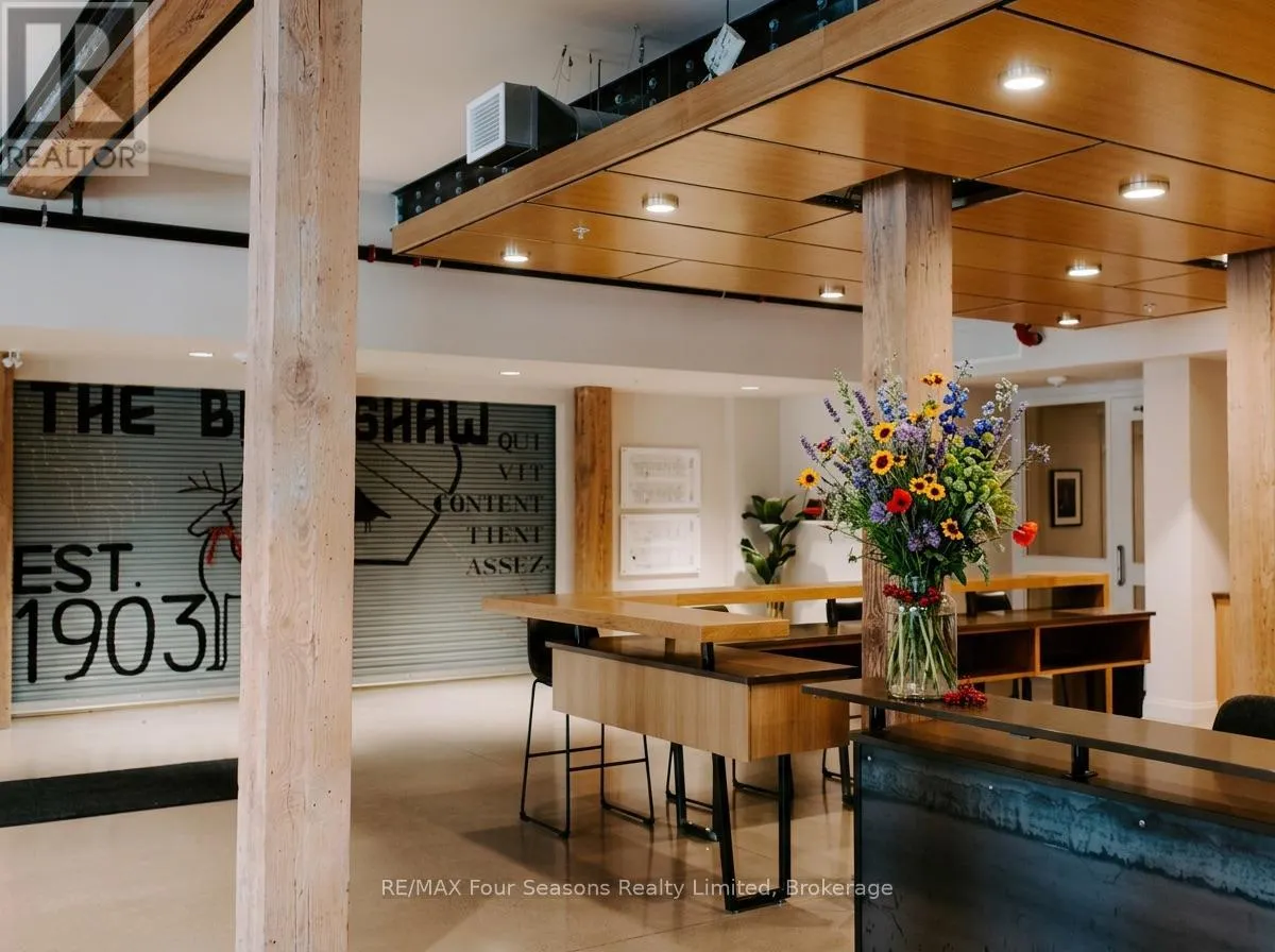 Cross Streets: Falstaff Street turn on Downie Street. ** Directions: From Ontario Street (Hwy 7/8), head south on Downie Street. Introducing a rare and storied offering in the heart of Stratford-a true loft residence within the iconic Bradshaw Lofts. Distinguished as the ONLY suite in the building with its own private entrance and exclusive terrace, this residence offers a level of privacy and individuality rarely found. Originally built in 1903 as a historic confectionery factory, the building has been thoughtfully transformed into a boutique loft conversion, seamlessly blending heritage character with modern design. Inside, the 627 sq ft interior is a striking expression of industrial elegance. Soaring 12-foot ceilings, exposed brick, and original timber beams create a dramatic architectural canvas, complemented by refined contemporary finishes including quartz countertops, hardwood flooring, in-suite laundry, and Energy Star integrated appliances. Expansive 8-foot windows flood the space with natural light, enhancing its open, gallery-like ambiance. Just steps from Brch & Wyn and a short stroll to Stratford's vibrant downtown-renowned for its world-class theatre, dining, and boutique shopping. Secure, well-managed building with video-monitored common areas. Condo fees include gas, water, and internet for added ease. Permitted short-term rental use offers exceptional lifestyle flexibility and income potential. (id:27476)