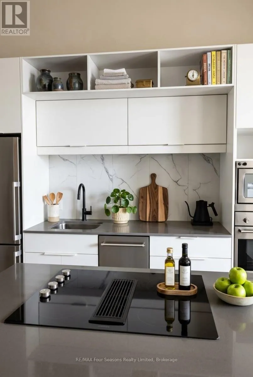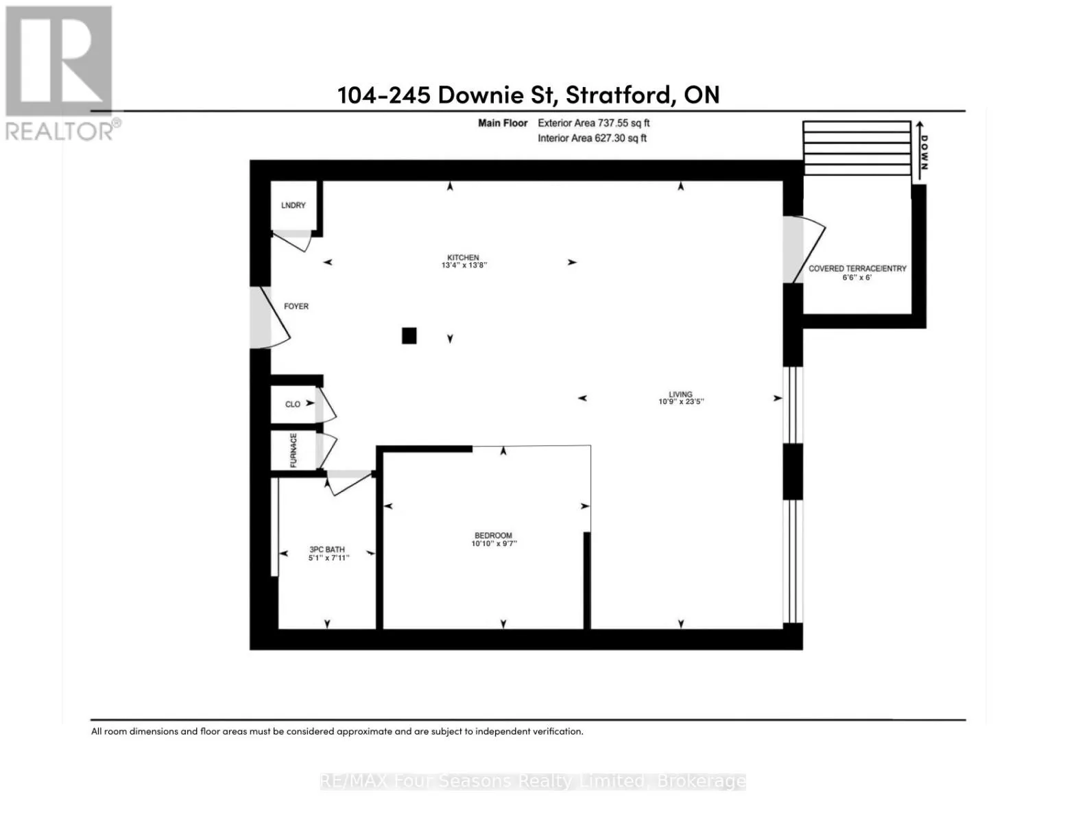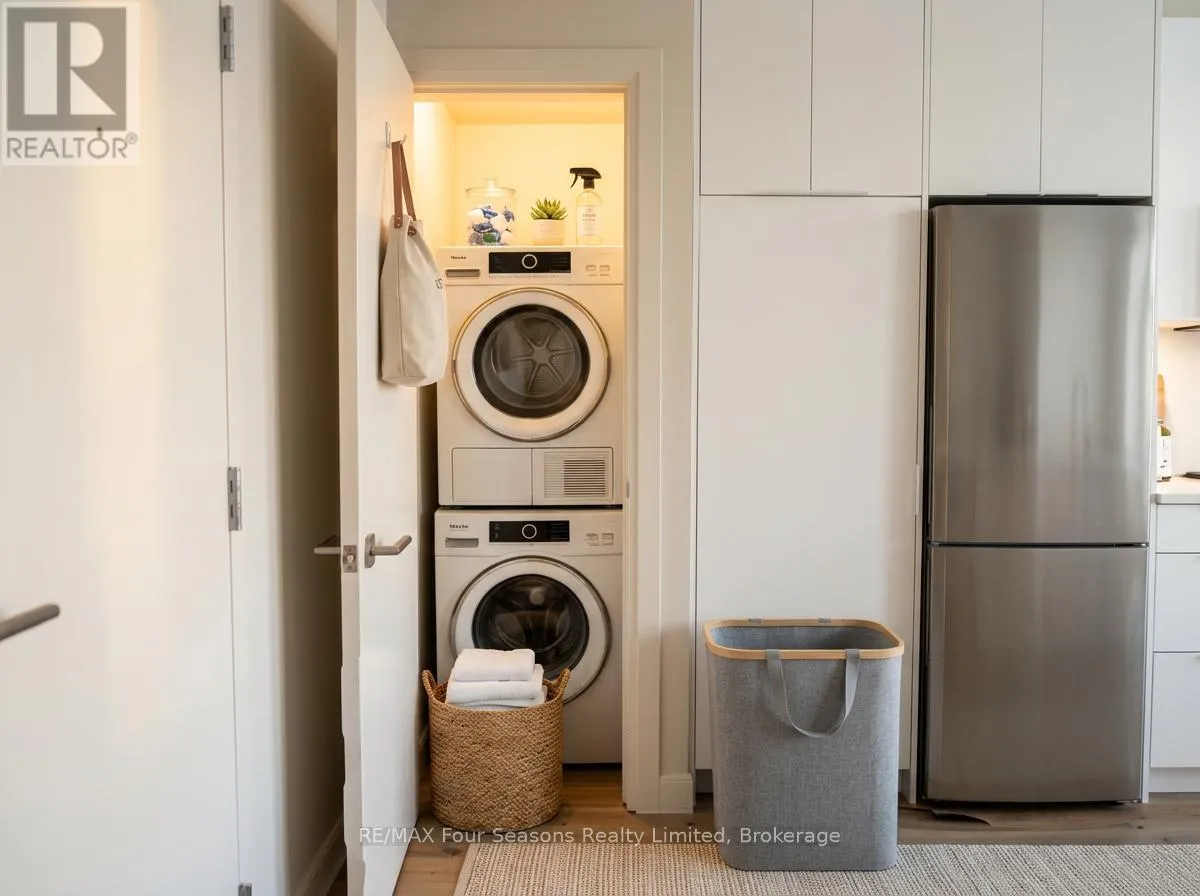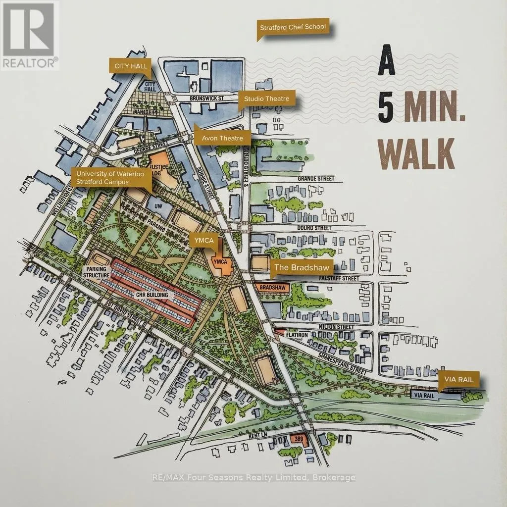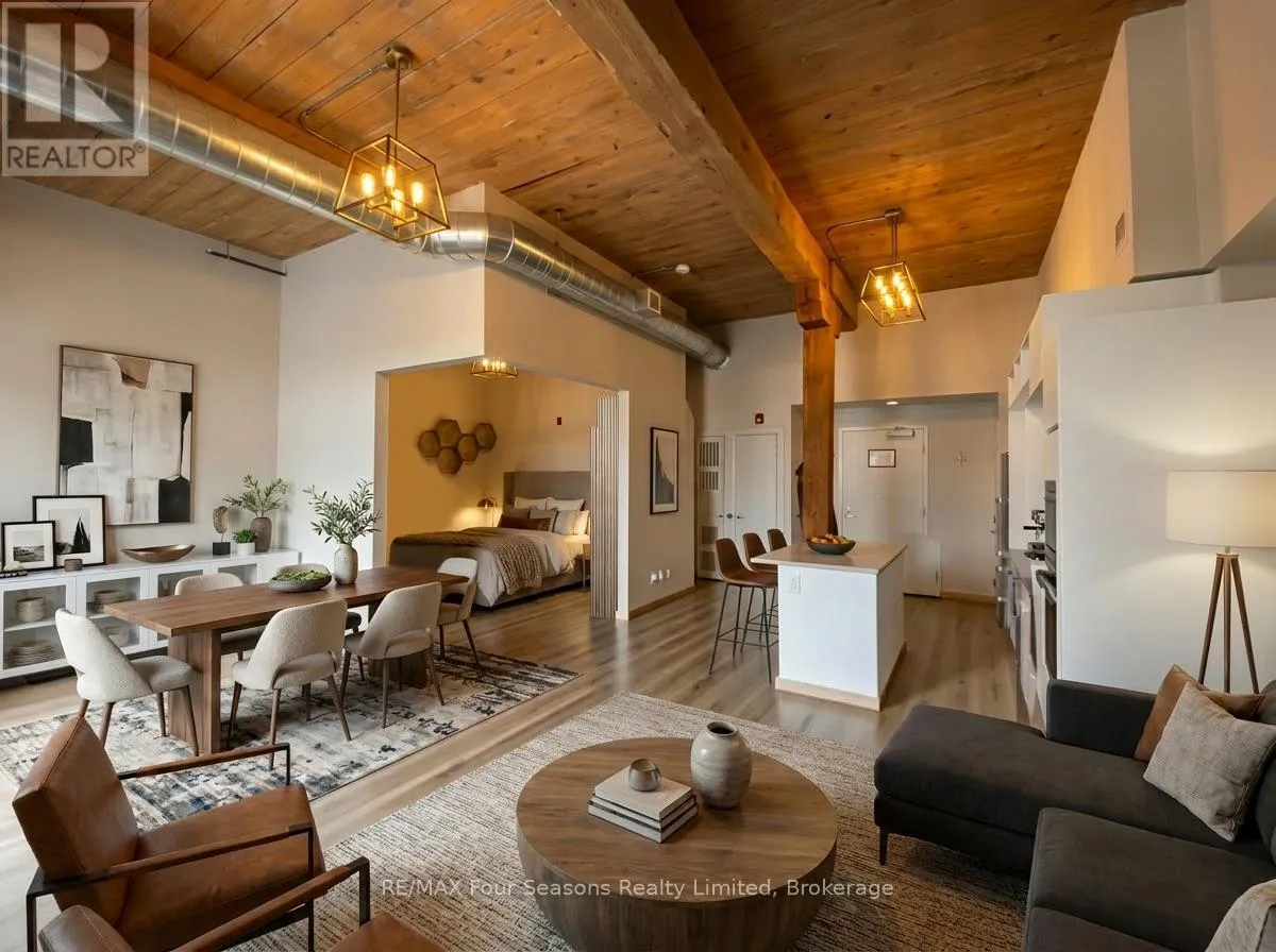 Cross Streets: Falstaff Street turn on Downie Street. ** Directions: From Ontario Street (Hwy 7/8), head south on Downie Street. Introducing a rare and storied offering in the heart of Stratford-a true loft residence within the iconic Bradshaw Lofts. Distinguished as the ONLY suite in the building with its own private entrance and exclusive terrace, this residence offers a level of privacy and individuality rarely found. Originally built in 1903 as a historic confectionery factory, the building has been thoughtfully transformed into a boutique loft conversion, seamlessly blending heritage character with modern design. Inside, the 627 sq ft interior is a striking expression of industrial elegance. Soaring 12-foot ceilings, exposed brick, and original timber beams create a dramatic architectural canvas, complemented by refined contemporary finishes including quartz countertops, hardwood flooring, in-suite laundry, and Energy Star integrated appliances. Expansive 8-foot windows flood the space with natural light, enhancing its open, gallery-like ambiance. Just steps from Brch & Wyn and a short stroll to Stratford's vibrant downtown-renowned for its world-class theatre, dining, and boutique shopping. Secure, well-managed building with video-monitored common areas. Condo fees include gas, water, and internet for added ease. Permitted short-term rental use offers exceptional lifestyle flexibility and income potential. (id:27476)