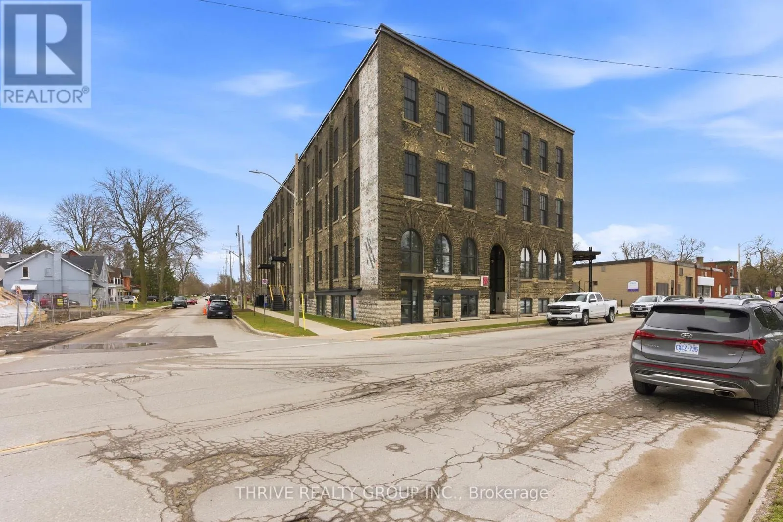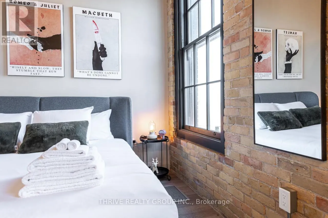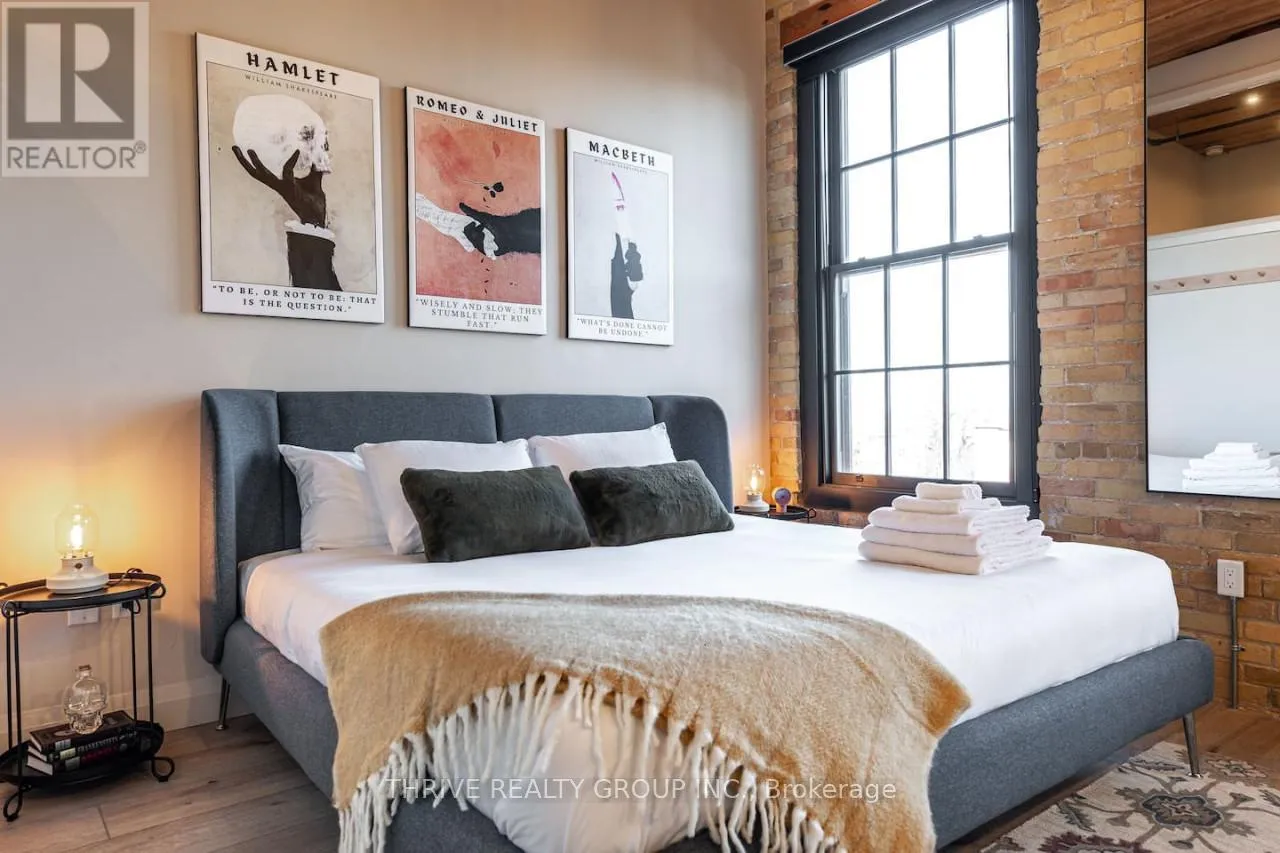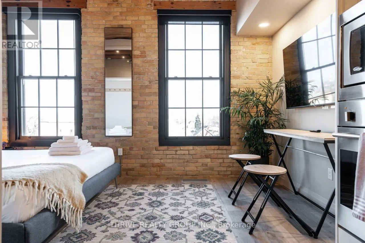 Cross Streets: Downie & Falstaff. ** Directions: On Downie south of 8 and north of Lorne. Welcome to Stratford and the Bradshaw Lofts! This incredibly historic building offers a unique experience in boutique condo ownership. The Clairemont, a stunning third/top floor unit is completely move-in ready, and if turn-key is what you are after, this is an excellent option. The thoughtfully laid out floor plan encompasses all your needs with beautiful finishes including vinyl plank flooring, high ceilings, and a stunning interior exposed brick wall, and original wood ceiling. Feel the vibe of the art and culture of this fantastic city from the moment you enter the building. It boasts a chic open concept lobby, and shares its space with a trendy wine bar/coffee shop - Brch & Wyn; and also a campus for the University of Waterloo. Perfect for students, educators, Stratford fans, professionals, or the investor who would like to broaden their portfolio with AirBnB income. Management with an experienced company for the rental option can be set up. Located close to the heart of everything that makes Stratford such a memorable spot to live and visit. (id:27476)