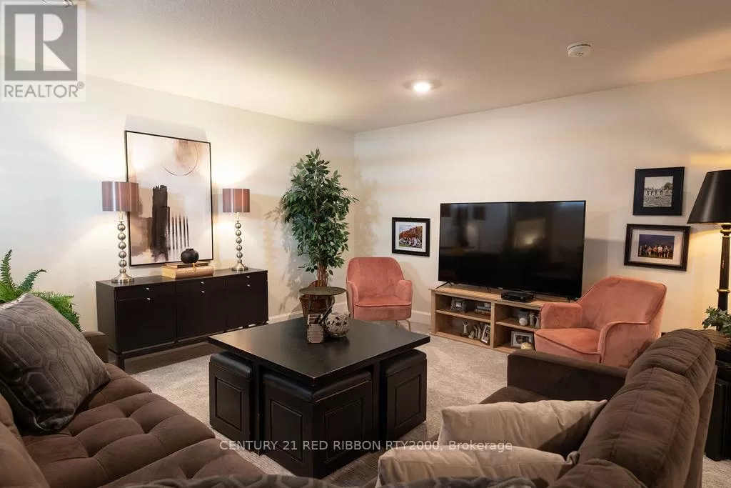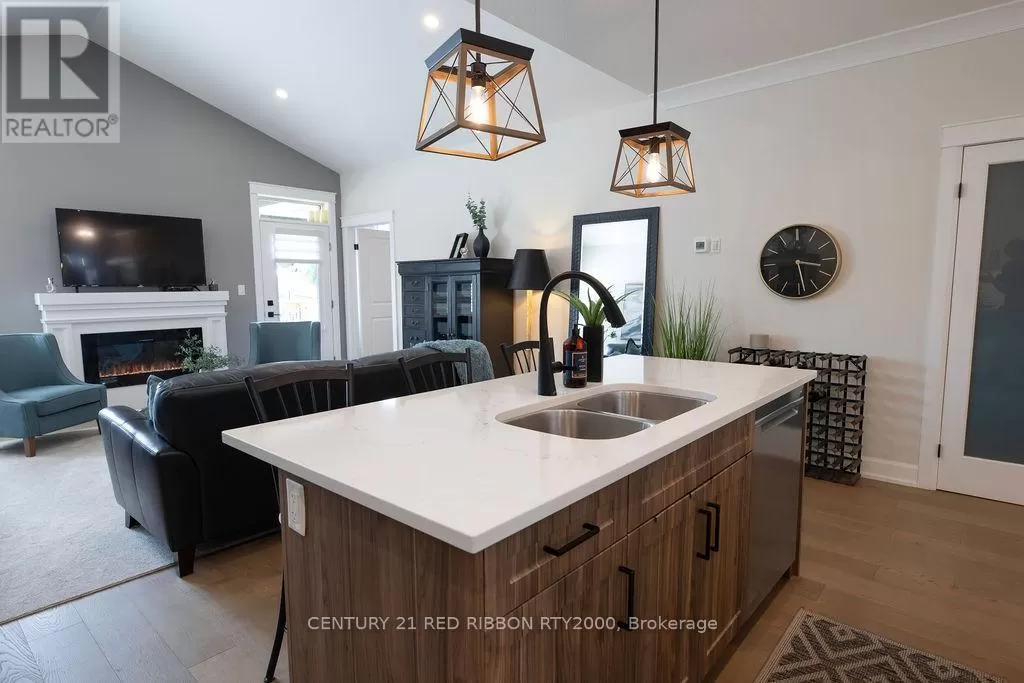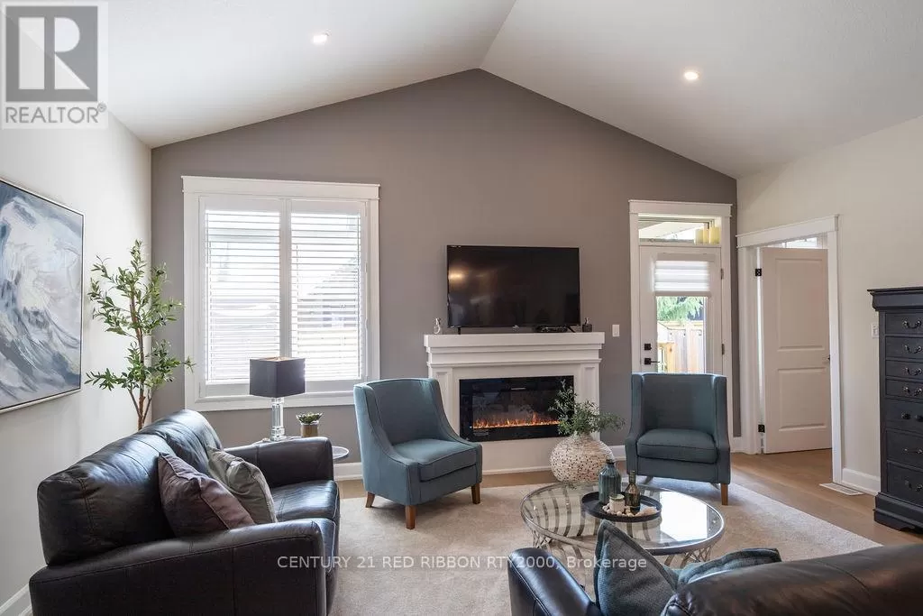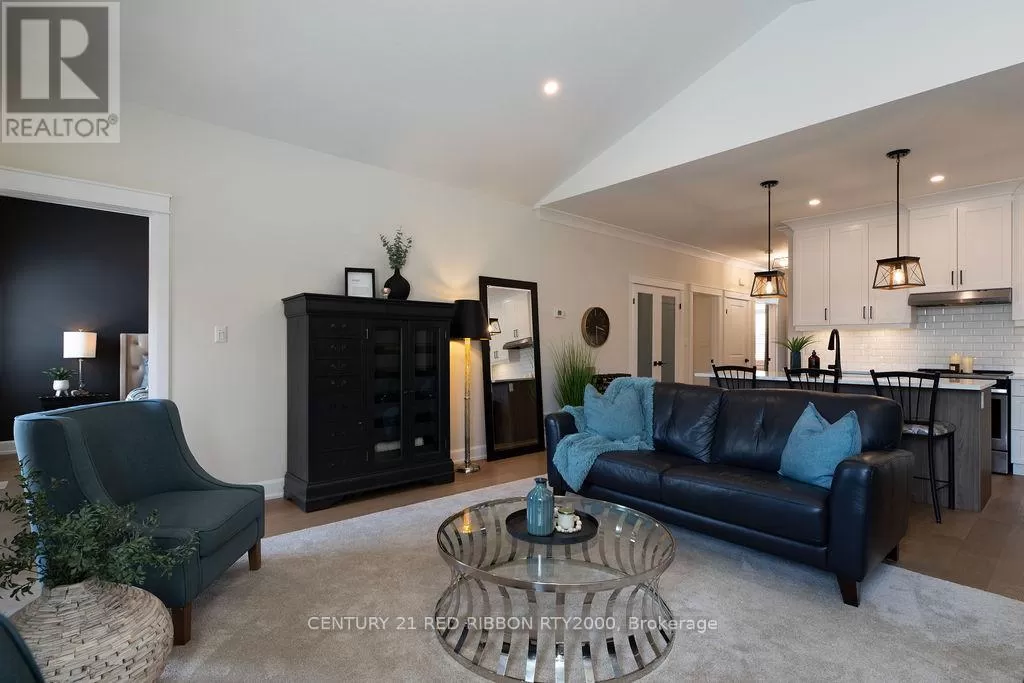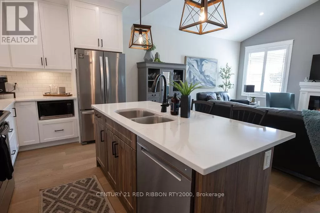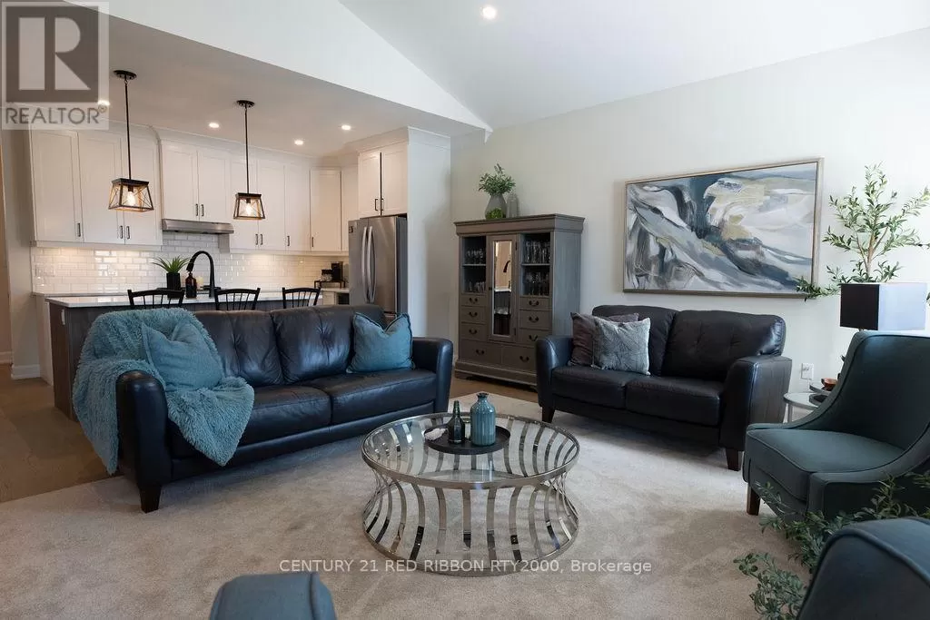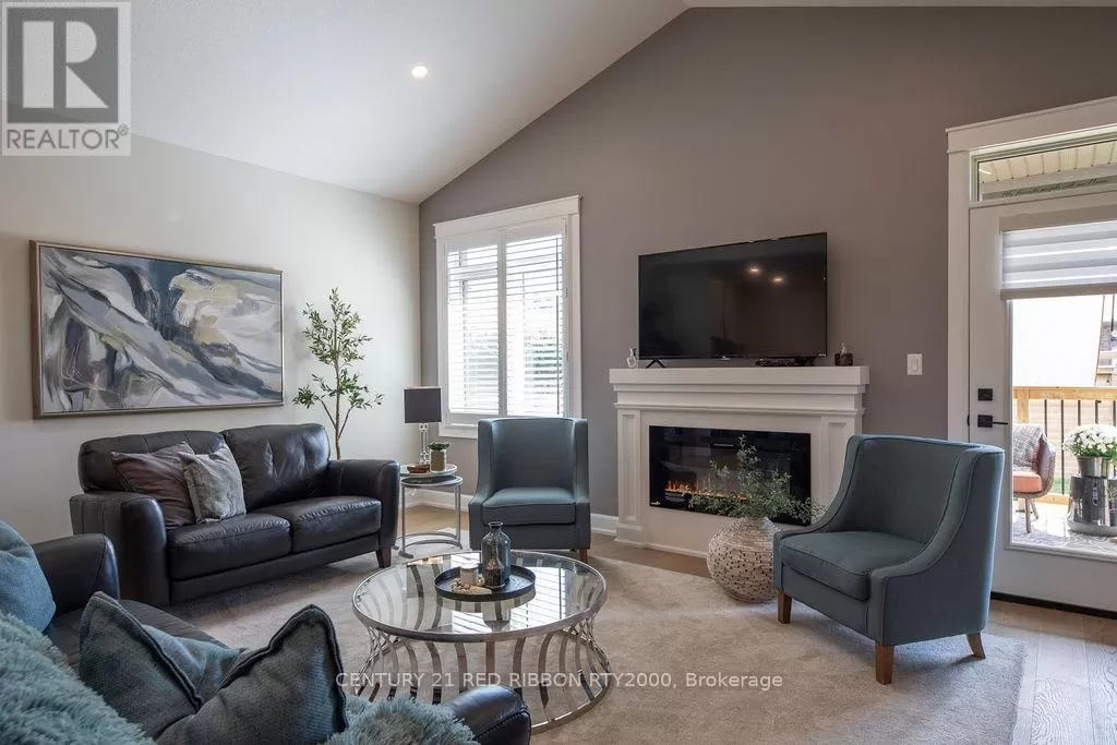 Cross Streets: Saxton Rd. ** Directions: Turn on to Collins Way from Saxton. LOOK NO FURTHER...THIS IS THE ONE! Located in charming South Grove Meadows next to the Caradoc Sands golf course, this exquisite 2+1 bedroom condo might be just what you've been looking for. Quality constructed by Dwyer Homes, this residence exudes elegance, showcasing stunning curb appeal, high-end finishes, and meticulous attention to detail. The main level features an open-concept design that includes a spacious great room with vaulted ceilings and a modern electric fireplace, offering easy access through the patio door to the inviting back deck and fully fenced backyard. The fabulous kitchen is designed for both beauty and functionality, complete with a stylish subway tile backsplash, luxurious quartz countertops, and an island, accompanied by high quality appliances to enhance your cooking experience. The tranquil primary bedroom serves as a perfect retreat, featuring a generous walk-in closet and a stunning four-piece en suite with double sinks and a beautifully tiled walk-in glass door shower. A versatile second bedroom, currently used as a dining room, can easily transition into an office or sitting area. Completing the main level are a four-piece bathroom and laundry area, making everyday living convenient all on one level. The fully finished lower level adds spaciousness with a sizable family room, an additional well-proportioned third bedroom, and another full four-piece bath, alongside ample storage in the utility room. Step outside to the backyard, featuring a 9' x 12' covered deck, a fully fenced yard, a storage shed and a Sandpoint system for watering the lawn or washing the cars. Complete with a single-car garage, beautifully landscaped surroundings, and a prime location near the dog park, the York Street sports fields/ playground and all of the many amenities that Strathroy has to offer, this fabulous home is a must-see for anyone seeking comfort, style, and community. Don't miss the opportunity to experience this blend of luxury and convenience! (id:27476)