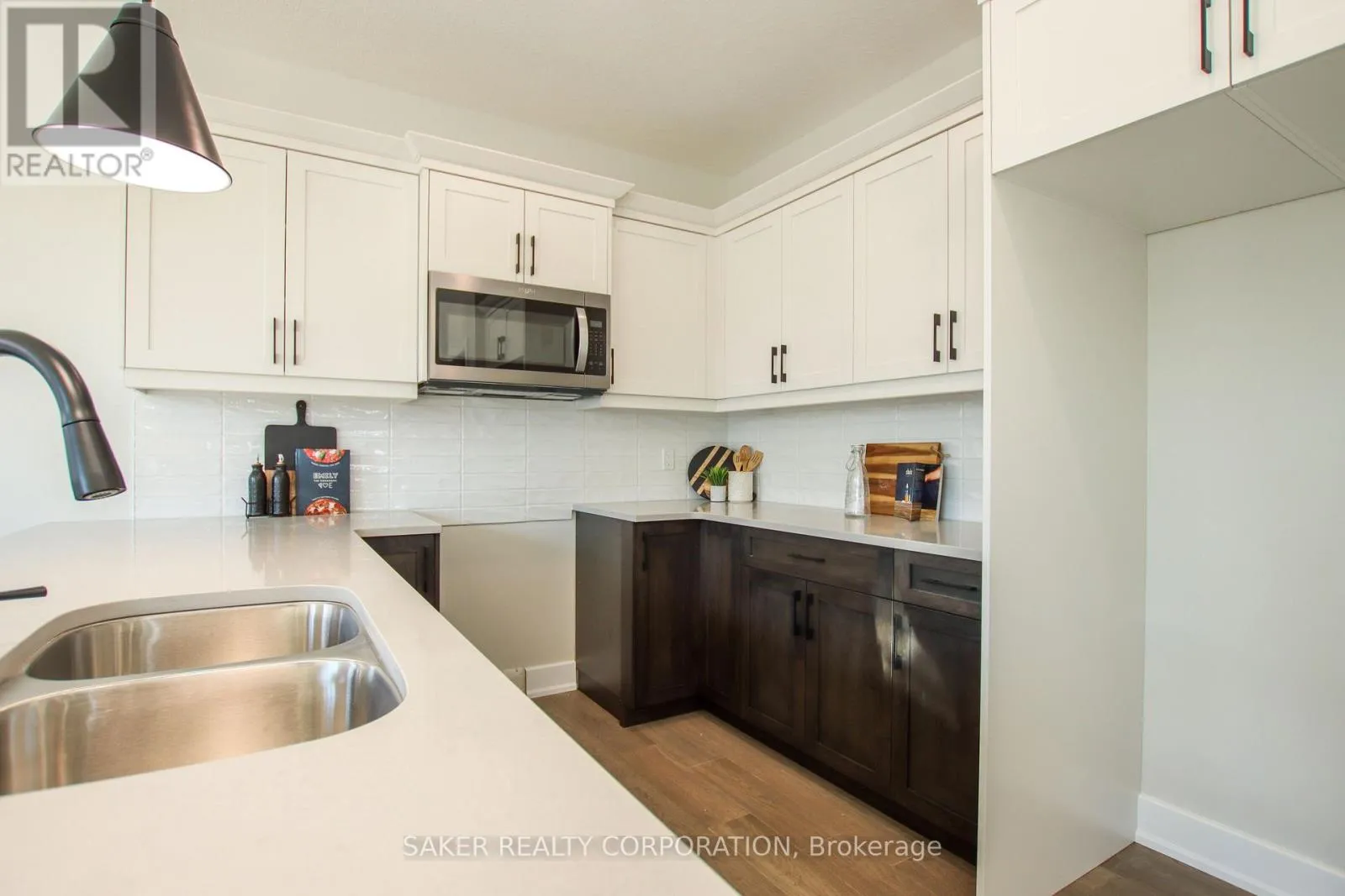 Cross Streets: From Glendon turn NW on Queen St. Left on Regent and follow around the bend. The second townhouse on the the left. ** Directions: 10 Min West of london. FREEHOLD NO CONDO FEES! This stunning end-unit split-level townhome by Banman Development backs onto mature trees and offers even more square footage and windows than the interior models, with nearly 2,000 sq. ft. of premium above-ground living space (plus an unfinished basement). Featuring 3 spacious bedrooms and 3 bathrooms, this home includes a master retreat on its own level with a luxurious ensuite and massive walk-in closet. The modern kitchen showcases an island with quartz countertops and matching backsplash, while the open layout is elevated with hardwood on the main floor, porcelain tile in all wet areas, 9' ceilings, and elegant glass/tile showers. A rear deck comes standard, along with a convenient second-level laundry room, a 2-car driveway, and a 1.5-car garage. Perfectly located near the community center, parks, arena, wooded trails, and downtown, this home is appointed far beyond its price point. (Photos are of model home; two color schemes available.) (id:27476)