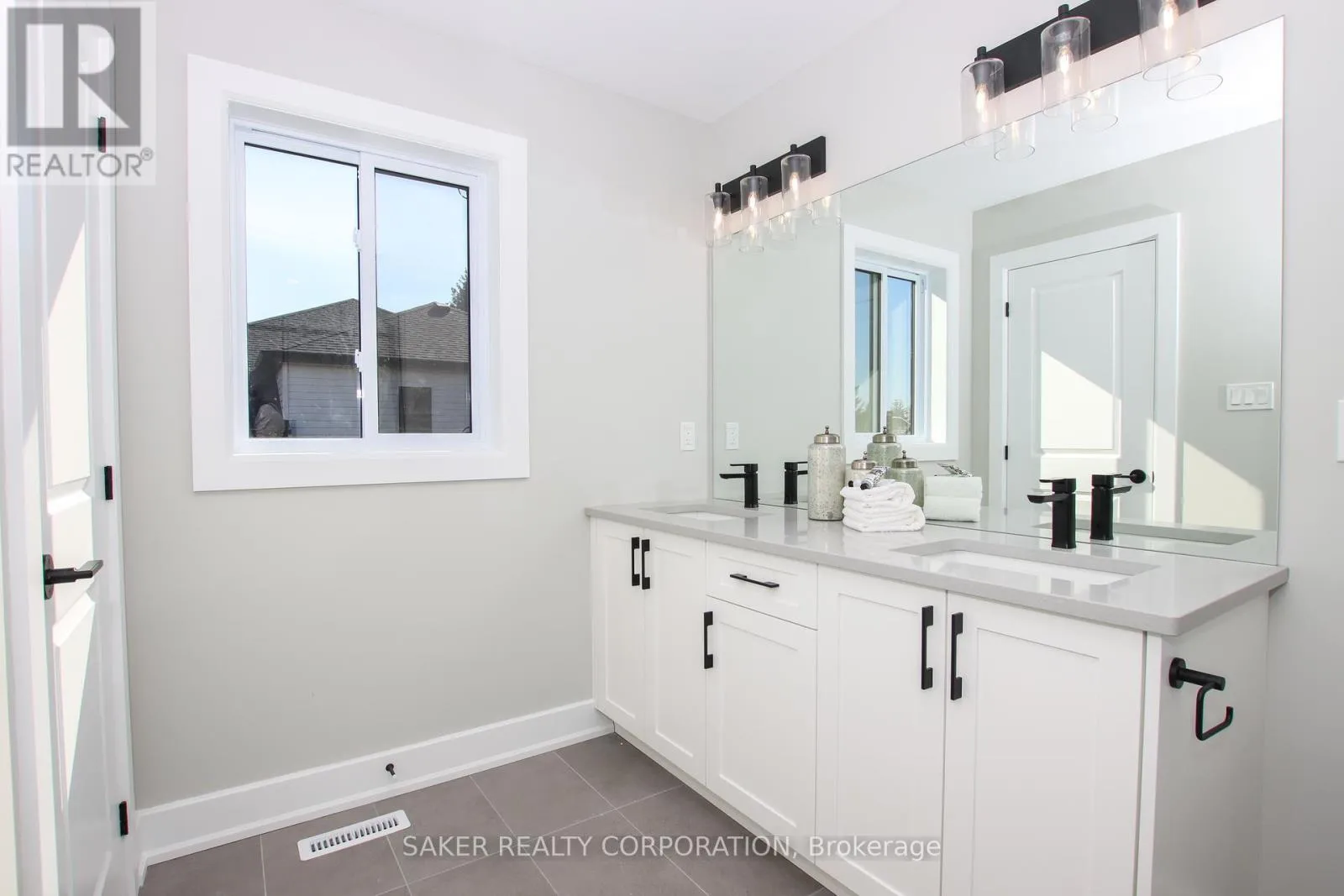 Cross Streets: From Glendon turn NW on Queen St. Left on Regent and follow around the bend. The second townhouse on the the left. ** Directions: 10 Min west of London. FREEHOLD NO CONDO FEES! This stunning end-unit split-level townhome by Banman Development backs onto mature trees and offers even more square footage and windows than the interior models, with nearly 1800 sq. ft. of premium above-ground living space (plus an unfinished basement). Featuring 3 spacious bedrooms and 3 bathrooms, this home includes a master retreat on its own level with a luxurious ensuite and massive walk-in closet. The modern kitchen showcases an island with quartz countertops and matching backsplash, while the open layout is elevated with hardwood on the main floor, porcelain tile in all wet areas, 9' ceilings, and elegant glass/tile showers. A rear deck comes standard, along with a convenient second-level laundry room, a 2-car driveway, and a 1.5-car garage. Perfectly located near the community center, parks, arena, wooded trails, and downtown, this home is appointed far beyond its price point. (Photos are of model home; two color schemes available.) (id:27476)