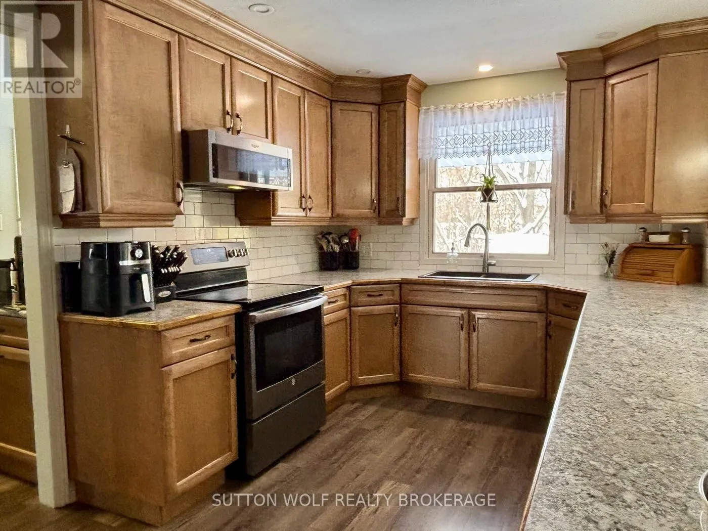Cross Streets: Caradoc St/Kittridge St. ** Directions: Heading North on Caradoc St, house is on right hand side. Welcome home! This 1971 quality Baker Construction built home offers the perfect mix of character, comfort, and convenience. A charming and unique two-storey family home that has had numerous upgrades in the last several years. Conveniently located within walking distance of downtown, shopping, and trails. The spectacular backyard flows down into an accessible greenbelt that is home to deer and other wildlife and offers a stunning view no matter what time of year it is. The high quality turf through the whole property means your lawn is always green, and you never have to mow! The main floor is designed for everyday living, featuring a bright family room, a cozy living room, and a high-quality custom kitchen with a breakfast-bar, upgraded lighting, and plenty of storage. Off the living space is a charming three season sunroom - the perfect spot to relax and enjoy coffee, reading, and the great backyard view. Upstairs, you'll find three generous-sized and bright bedrooms as well as a beautiful 5-piece bathroom. The primary bedroom includes a large walk-in closet and the other two bedrooms include plenty of storage, including double closets and built-in dressers. The large basement has been refreshed with new drywall, lighting, and is partially carpeted, creating a perfect spot for a games room, home office, and play area The basement also includes a slate pool table, plenty of storage, and a large walk in cool room. Full list of recent upgrades include:(2018) new 50-year roof with transferable warranty; new electric garage door; full custom kitchen remodel; complete bathroom remodel in both bathrooms; main floor lighting and electrical upgraded; new vinyl plank flooring; upgraded panel box and new lighting throughout basement (2019) walk-in closet in primary bedroom; basement insulation and drywall(2020) new tankless/on-demand water heater and boiler; upgraded attic insulation2021)new heat pump system/air conditioning. (id:27476)