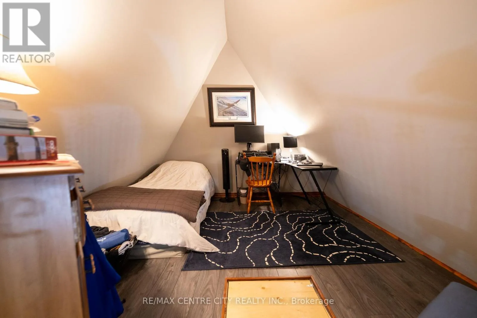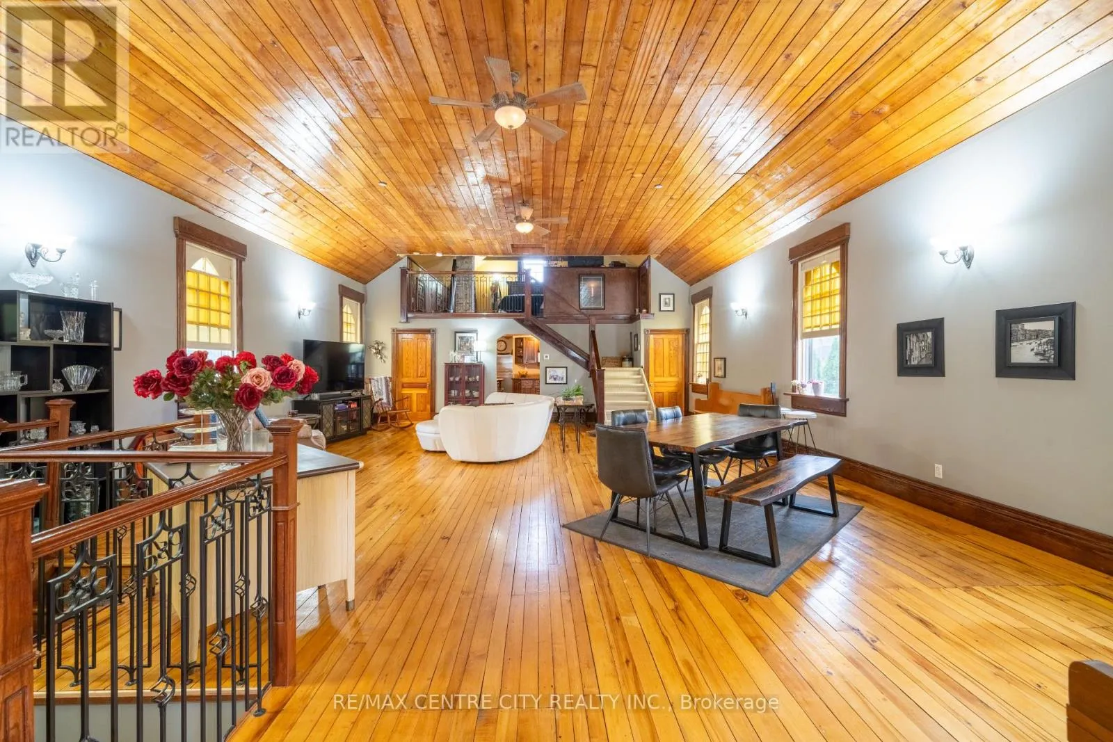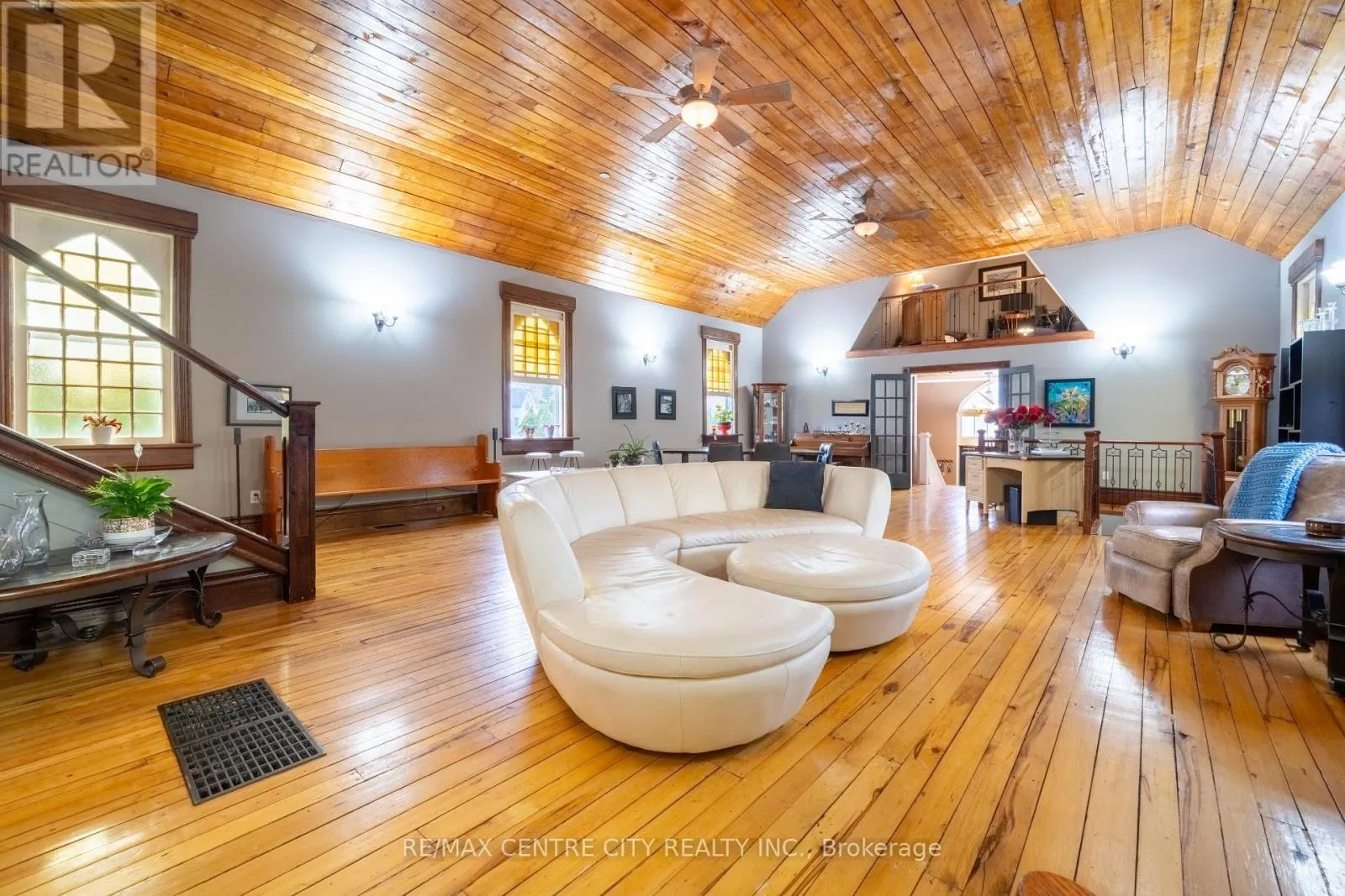 Cross Streets: Princess St and High. ** Directions: Located on the South East corner of Princess St. & High St West, just West of Caradoc Street South. Truly one-of-a-kind! This former Salvation Army/church has been beautifully reimagined into a unique residence brimming with original character and modern comfort. A formal foyer/vestibule welcomes you into the expansive great room, perfect for entertaining or relaxing, with soaring vaulted ceilings finished in tongue-and-groove and stained-glass windows .The main floor offers a kitchen with plenty of counter space, convenient laundry with back yard access, and a full 4-piece bathroom. Two lofts add versatility that overlooks the great room. The larger one serves as the primary bedroom, complete with abundant built-in storage .The lower level expands the living options with three additional bedrooms plus an office area, a second kitchen conveniently located adjacent to the living room, and a roughed-in second bathroom ready for completion. Lower lover also has direct access to the rear yard. Beautifully finished stamped concrete parking area, double-wide in design, offering ample space for four cars.Corner lot on a quiet street, this home is just a short walk to nearby parks and restaurants. The private yard with a large deck , bordered by mature trees, offers a peaceful retreat in the heart of the community.This remarkable property blends historic craftsmanship with modern functionality-an inspiring space for living, gathering, and creating. (id:27476)