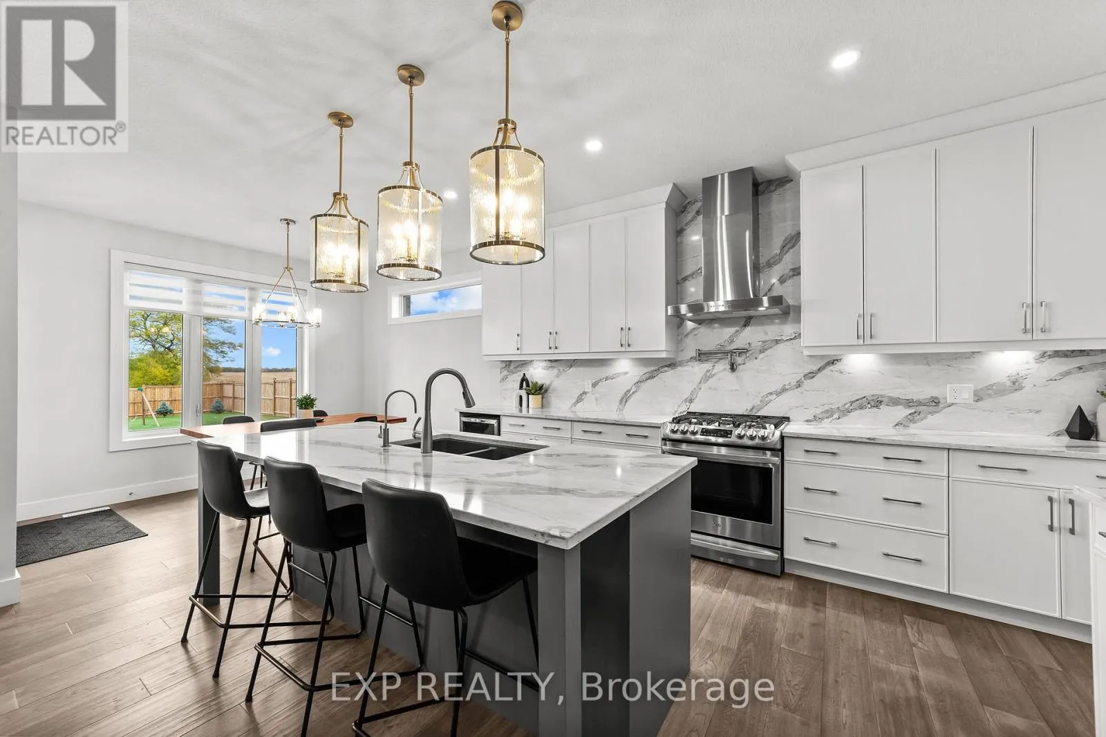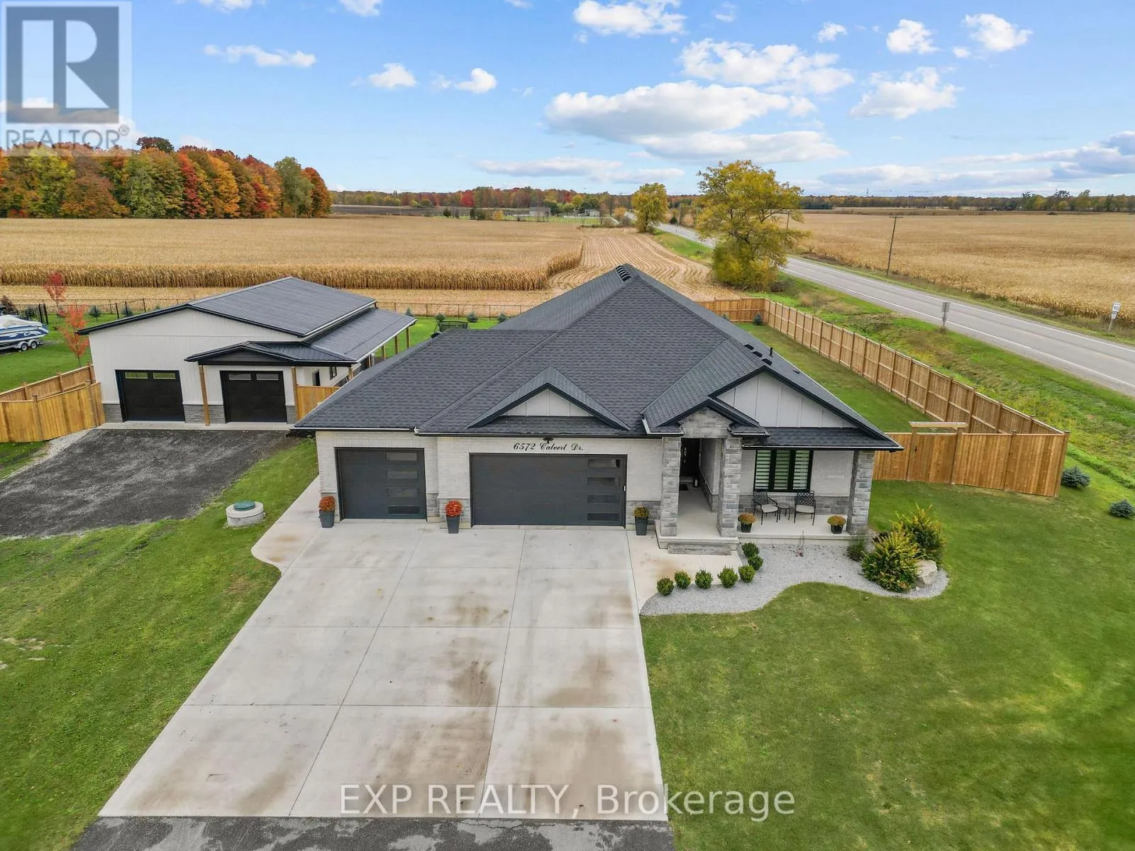 Melbourne Rd/Calvert Dr Set on an almost three-quarter acre lot just minutes from Strathroy, this remarkable property showcases a brand new 30x40 ft heated and air-conditioned shop with 13-foot ceilings, a large covered patio, matching house siding, and a steel roof designed for lasting durability. Built beside the home to connect seamlessly with the massive concrete patio, it creates a functional outdoor living space perfect for entertaining, relaxing, or watching sunsets over the open fields that provide full privacy through the summer and fall. The property is fully fenced with privacy trees already planted, features a gas line for the barbecue, and offers both a covered front and back porch for year-round enjoyment. Inside, the home combines craftsmanship and comfort with 10-foot ceilings in the entry, a vaulted living room anchored by a stone gas fireplace, and engineered hardwood throughout. The kitchen includes a quartz backsplash, pot filler, extra large island, and wine fridge, while transom windows, 9-foot bedroom ceilings, and a tray ceiling in the primary suite add architectural character. The primary wing features a luxurious ensuite with a soaker tub and a spacious walk-in closet, privately tucked away from the main living areas. The oversized three-car heated garage is equipped with a gas heater, and the basement offers exceptional versatility with two large bedrooms, a full bath, rough-in for a bar or second kitchen, and a conduit for a projector. Additional details include a generator hook-up, exterior security camera system, soffit outlets for Christmas lights, and a large mudroom with custom built-ins, quartz bench top, and kick-close drawers. The home runs on natural gas and well water with a reverse osmosis system, and Bell Fibe Internet and TV provide modern connectivity. Located on a country road with a dead-end street nearby for walking and biking, this home is only five minutes to Strathroy and thirty minutes to London. (id:27476)
