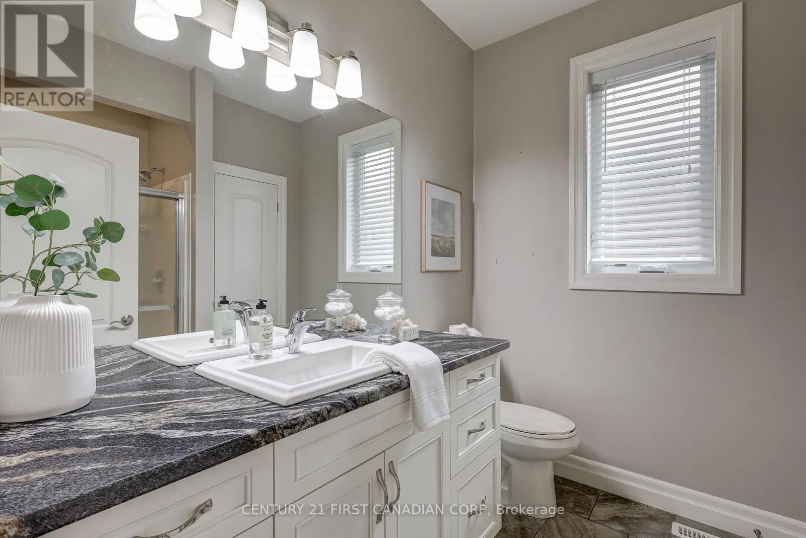 Cross Streets: ADELAIDE & BENNETT. ** Directions: OFF ADELAIDE ROAD. Incredible Value!!! This Former Model ideal Ranch style residence is just 10-15 minutes between London and Strathroy. Impeccably maintained all-brick offers over 1,670 sq ft of luxury living on the main floor. The home features a spacious, open-concept layout with 10-ft tray ceilings, an inviting gas fireplace, and oversized windows that flood the space with natural light. The custom kitchen is a chefs dream - complete with granite countertops, stylish backsplash, under-cabinet lighting, and a large walk-in pantry. The well-appointed 2+1 bedrooms and 3 full bathrooms include a spacious primary suite with a walk-in closet and private ensuite. The professionally finished lower level adds (1135 sq ft) incredible living space with a full bedroom, full bathroom, large windows, and excellent lighting perfect for guests or extended family. Enjoy fully landscaped grounds, a fully fenced backyard, and fantastic outdoor living space including a covered front porch, a large deck, and a custom-built shed. Located in a quiet, family-friendly neighbourhood just minutes from the 402, schools, parks, and local amenities. This move-in-ready home offers exceptional value - don't miss this opportunity! One call and you're in! ** Note: Low property taxes ** (id:27476)