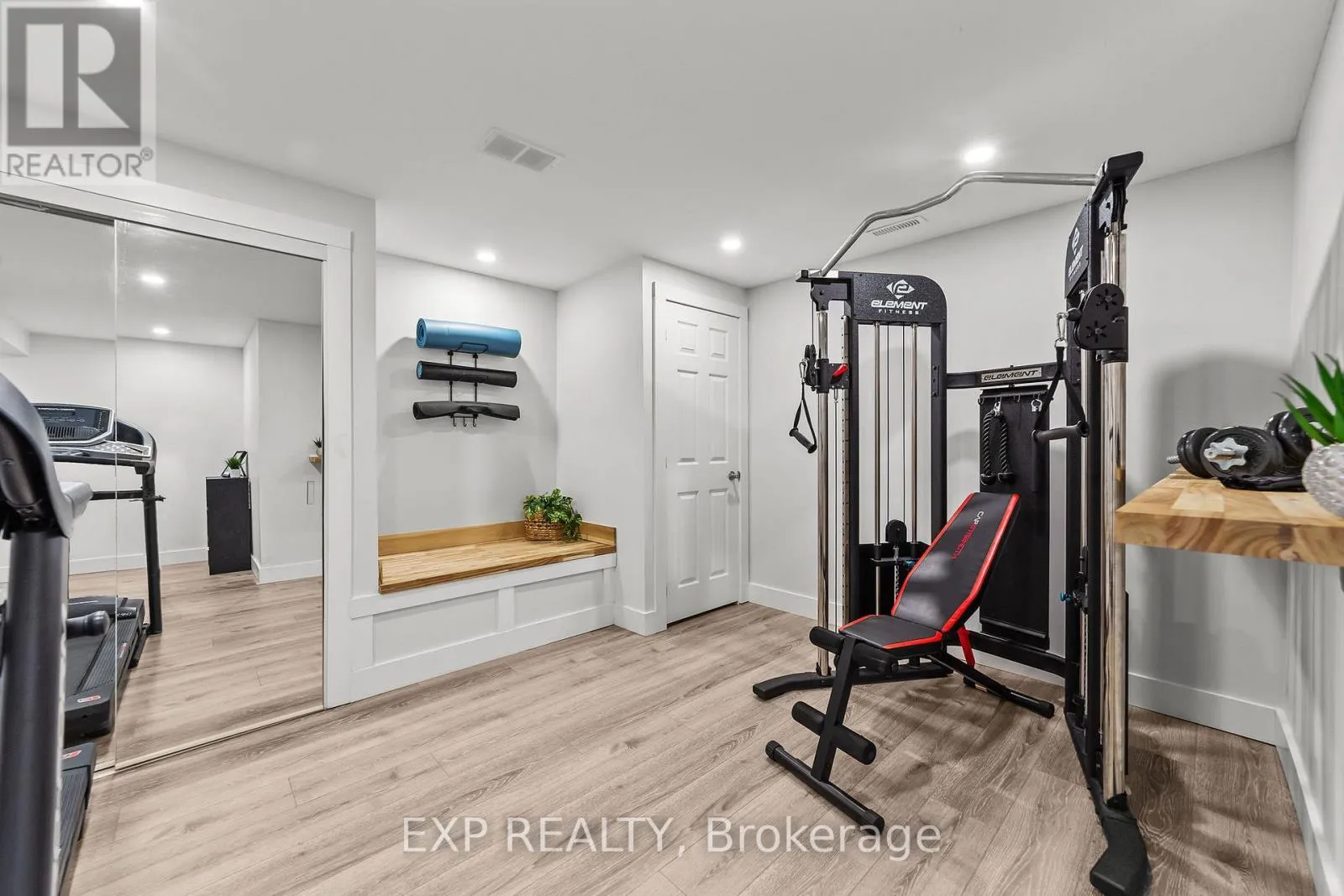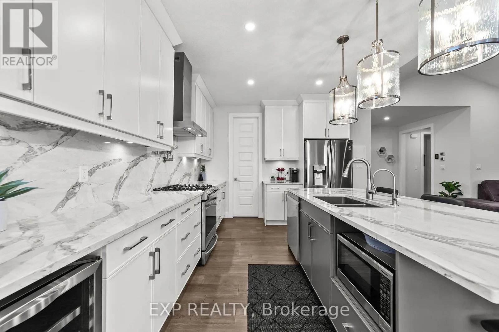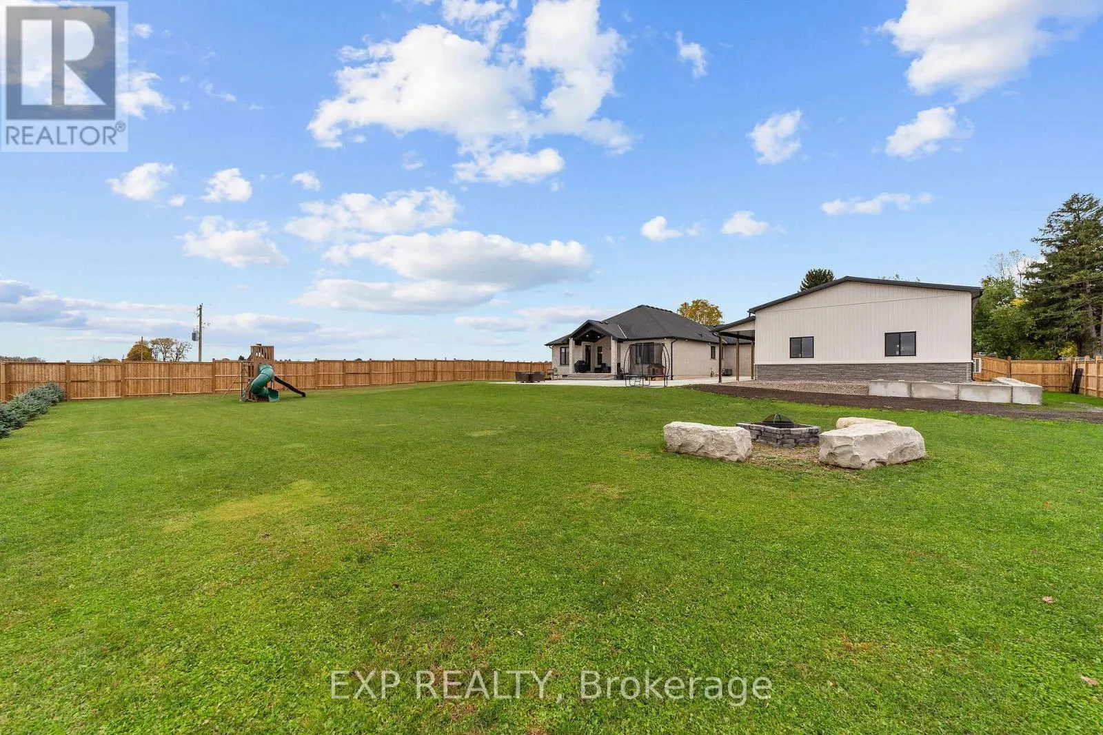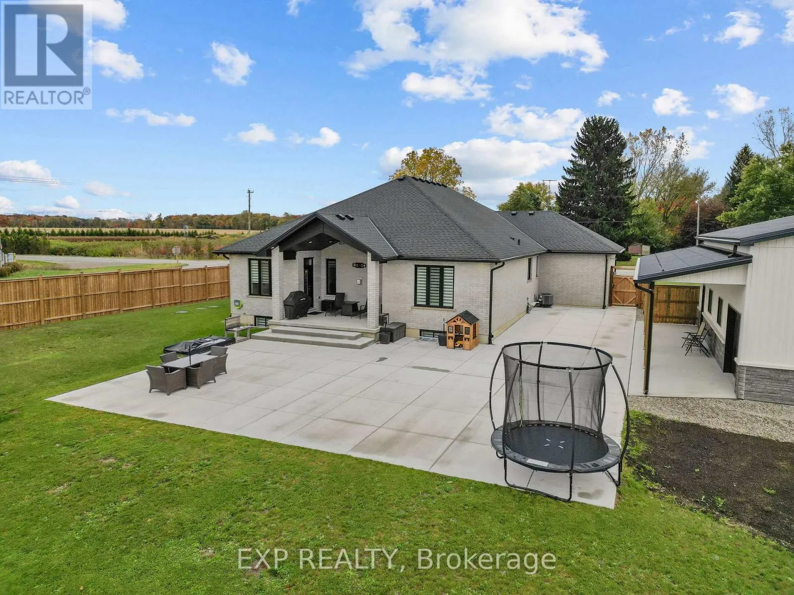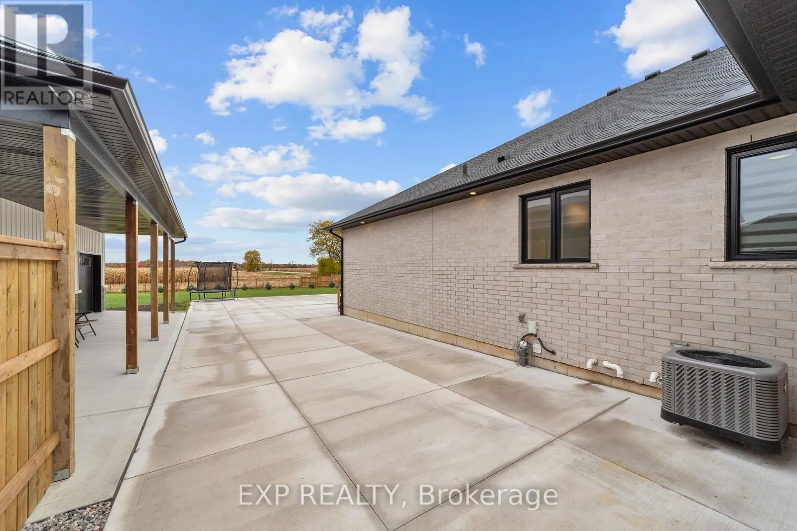 Melbourne Rd/Calvert Dr Set on an almost three-quarter acre lot just minutes from Strathroy, this remarkable property showcases a brand new 30x40 ft heated and air-conditioned shop with 13-foot ceilings, a large covered patio, matching house siding, and a steel roof designed for lasting durability. Built beside the home to connect seamlessly with the massive concrete patio, it creates a functional outdoor living space perfect for entertaining, relaxing, or watching sunsets over the open fields that provide full privacy through the summer and fall. The property is fully fenced with privacy trees already planted, features a gas line for the barbecue, and offers both a covered front and back porch for year-round enjoyment. Inside, the home combines craftsmanship and comfort with 10-foot ceilings in the entry, a vaulted living room anchored by a stone gas fireplace, and engineered hardwood throughout. The kitchen includes a quartz backsplash, pot filler, extra large island, and wine fridge, while transom windows, 9-foot bedroom ceilings, and a tray ceiling in the primary suite add architectural character. The primary wing features a luxurious ensuite with a soaker tub and a spacious walk-in closet, privately tucked away from the main living areas. The oversized three-car heated garage is equipped with a gas heater, and the basement offers exceptional versatility with two large bedrooms, a full bath, rough-in for a bar or second kitchen, and a conduit for a projector. Additional details include a generator hook-up, exterior security camera system, soffit outlets for Christmas lights, and a large mudroom with custom built-ins, quartz bench top, and kick-close drawers. The home runs on natural gas and well water with a reverse osmosis system, and Bell Fibe Internet and TV provide modern connectivity. Located on a country road with a dead-end street nearby for walking and biking, this home is only five minutes to Strathroy and thirty minutes to London. (id:27476)