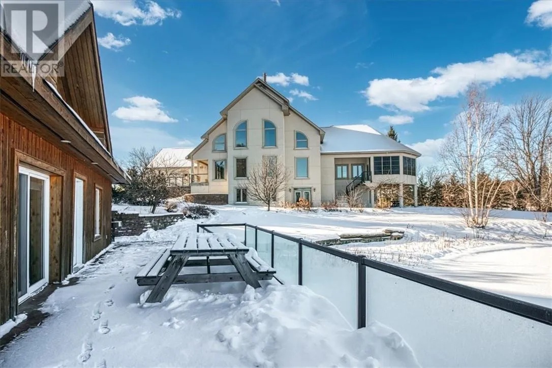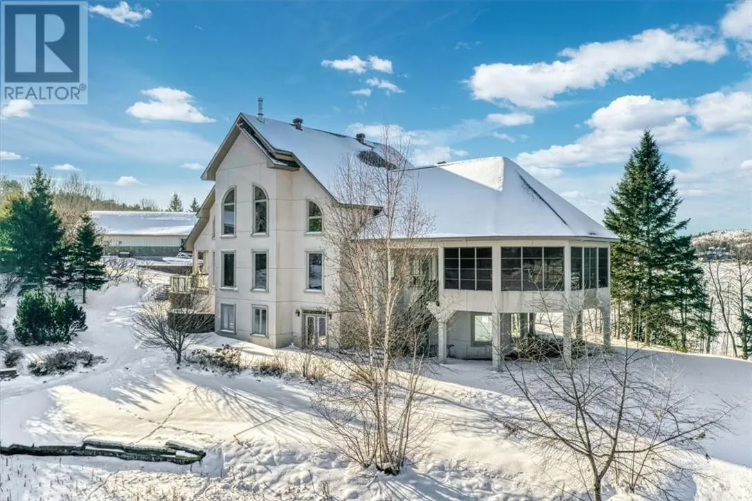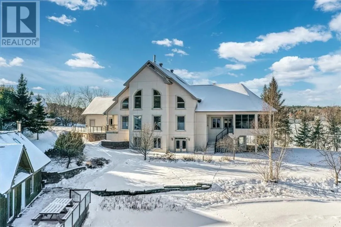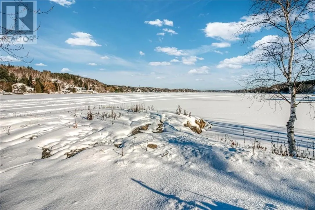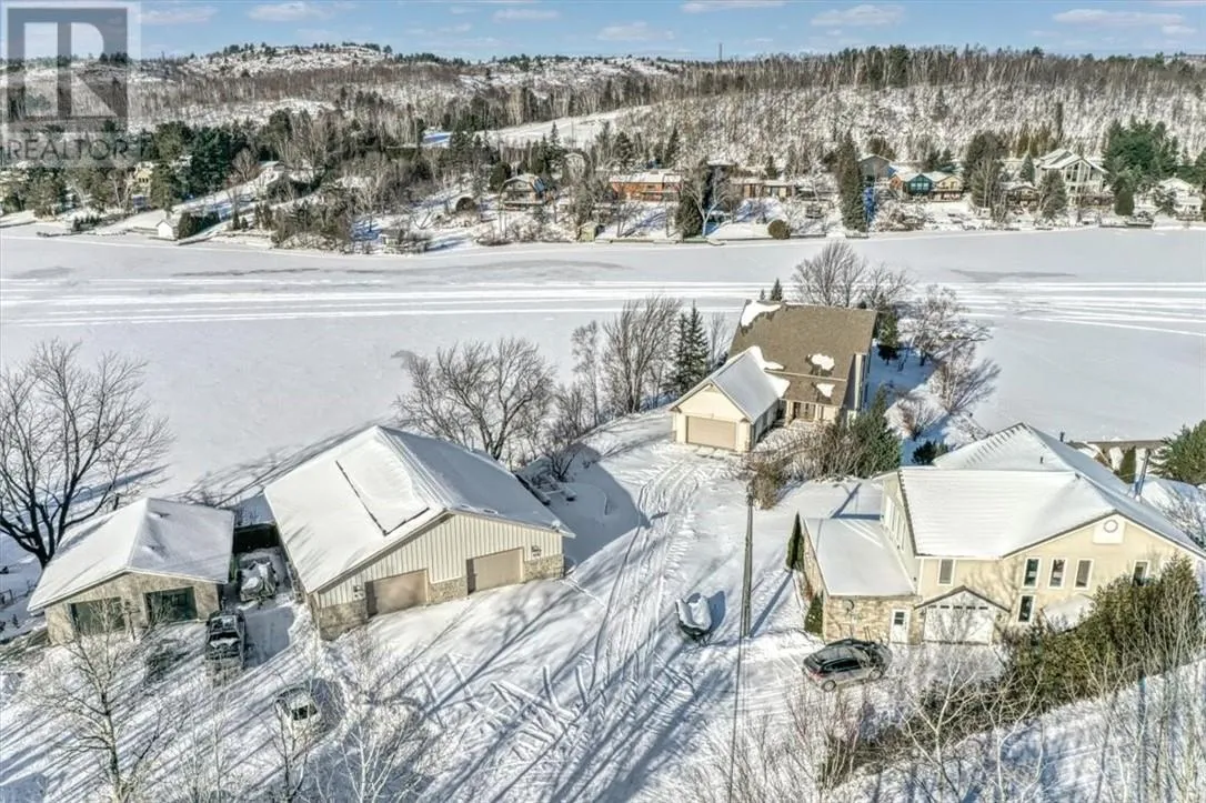 This is truly a unique property. Over 700 feet of water frontage on Sudbury's beautiful sought after Long Lake with views both east and west. From the wrap around deck off the kitchen you can watch the sun come up in the morning and watch it set at night. This 3 bedroom family home is quite spectacular with 24 foot vaulted ceilings in the great room and it showcases a fireplace stretching floor to ceiling. On the east side of the home, at the water's edge, is a sauna party zone that comes complete with a loft bedroom, heated floors, and a 2 pc washroom. In front of the sauna building there is a spacious stamped concrete patio area to sit and watch the lake go by. On the west side of the point, there is a 50 x 50' aircraft hangar built into solid rock with 19' ceilings. This is currently used as a hangar but can be used for an amazing basketball court or any other game where an unobstructed high ceiling 2500 sq. ft. area can be played. On top of the hangar there is a 50 x 50 garage that faces the road. Both floors of this building have 3 pc washrooms. All of the buildings are built with ICF foam blocks filled with rebar and concrete. The concrete extends all the way to the roof deck. All floors in the 3 buildings are heated and of course the main house and sauna party zone has central A/C. The lower walk out level of the home is an empty canvas. This lower area (approximately 1800 sq. ft.) would make a perfect in-law suite for generational living. There are large windows looking east and west down the lake and the drywall is done and primed. There are 2 bathrooms roughed in on this level, the floor and ceiling finishes would be up to you. Call now to arrange your private viewing of this incredible package. (id:27476)