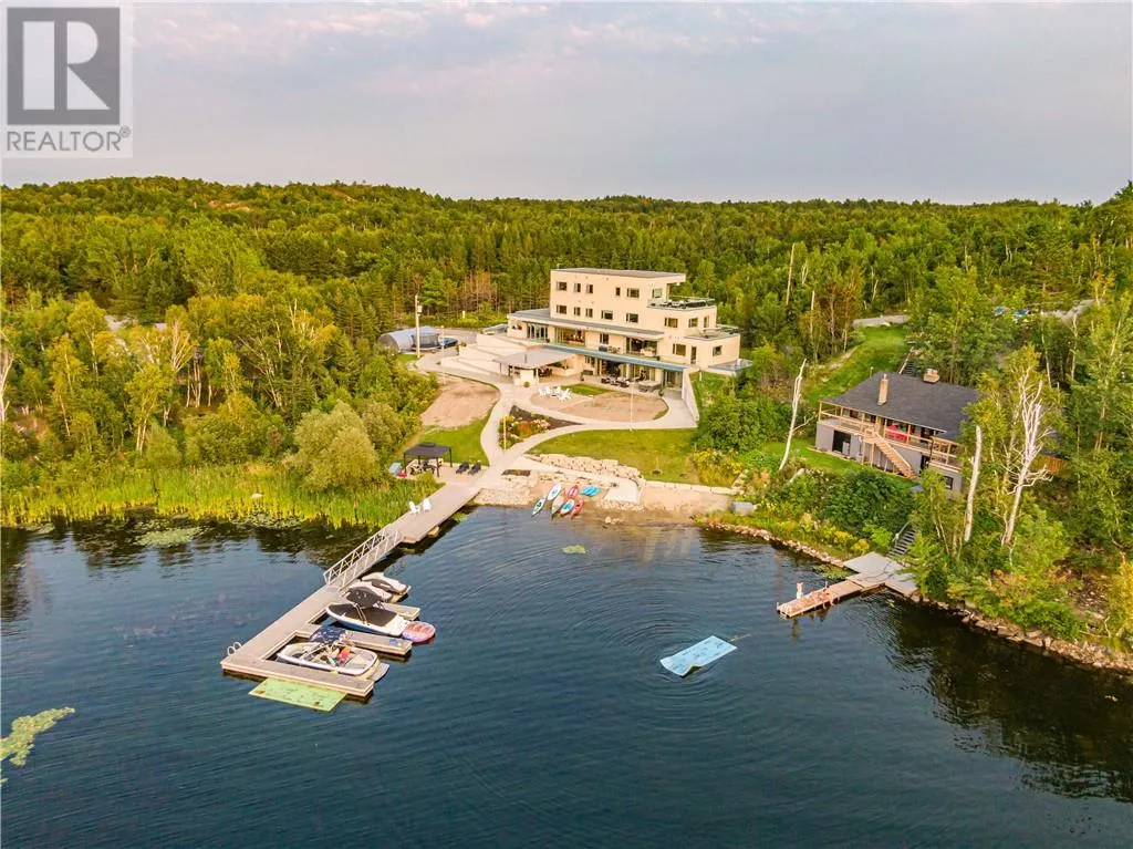 In a league of its own & located on the sought-after Ramsey Lake. In the heart of Sudbury next to HSN, biking/hiking & ski trails, Sudbury's Northern Watersports Centre and so much more. This 6,000 sq.ft.+ waterfront home incl's a beautiful mix of granite & maple hardwood floors without w stunning detail. 18' waterfall feature as you enter the home. Four levels (wheelchair accessible complete with an elevator & outdoor ramps). Glass curtain walls that let in all the gorgeous sunlight and California sliding doors that open all the way up lakeside bringing the outdoors in. Two temperature-controlled wine cellars (500 & 1500 bottle), family theatre room, vitality bar for smoothies and drinks, gym with changeroom and indoor heated pool all of which opens lakeside and leads to the outdoor shower, hot tub, relaxing sitting area, and stone fire pit which is next to a mind blowing out-door kitchen. Details to mention here are wood-burning pizza oven, grill, beverage fridge, full sink, icebox, prepping station and so so much more, plus enclosure for cool or winter months. Take the elevator or the outside ramps up to the 2nd level where you will find the heart of the home. This kitchen is incredible, with multiple islands & gorgeous granite countertops, chef-inspired built-in appliances etc. It is an open concept design on this flr. Details include a gas fireplace, custom built-in cabinets, shelves, walk-in pantry & captains dining table where you will catch the most incredible sunsets. Just off the dining area is the sunroom that opens up to the waterfront and to the 2nd outdoor kitchen. The primary suite is located on its own floor offering a private interlock terrace (sunsets), Office (incredible lake views), walk-in closet and ensuite. The home offers 6 bedrooms 6 baths. Sandy beaches, docking systems for multiple water toys & boats, a triple car garage, and a secret passageway. This is a must-see as there is so much more to experience. (id:27476)