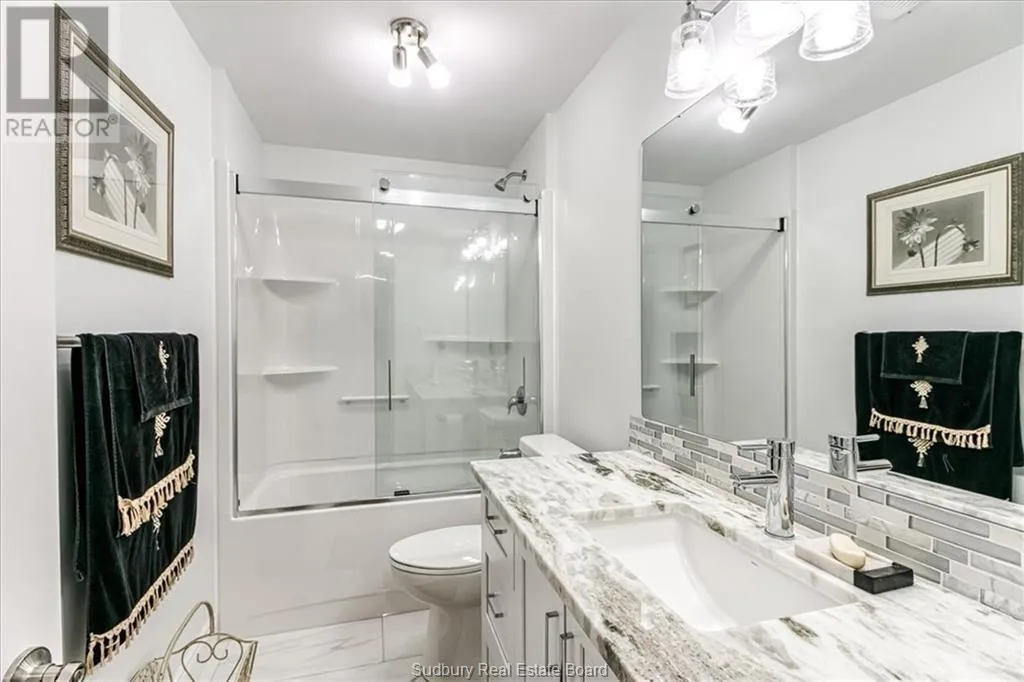 Looking for a new build that is both modern and sophisticated? This 1,651 square foot Dalron constructed home in the desirable upcoming Minnow Lake area is move in ready. Upon arrival, you'll be greeted with stunning curb appeal with a double wide interlocking driveway, landscaping with rocks, mulch and lighting and single car garage. Enter into the home to find a spacious foyer with porcelain tile flooring, large closet and access to the garage. Minimal stairs take you to the second level to the large open concept living/dining, kitchen combo, featuring gorgeous matching modern yet warm light fixtures and plenty of entertainment space. Kitchen highlights 3 Fantasy Grey granite counter tops, updated & expanded custom cabinets, gloss reflecting backsplash, ""Blanco"" double sink with touchless faucet and soap dispenser. Exceptional kitchen appliances included feature Samsung smart fridge, Samsung smart stove, Sharp built in drawer microwave, Samsung dishwasher and Frigidaire cooling fridge. Off the kitchen to the large deck featuring a gas BBQ hook-up and plenty of space for summer entertaining. Backyard offers a large shed, full patio stone coverage and flower garden. Off the kitchen, you'll find a 4 piece bathroom featuring beautiful tile flooring, updated vanity with granite countertops, stone backsplash, glass siding doors in the tub surround and plenty of storage. Primary bedroom offers 2 closets and lush carpeting. Another bedroom with closet completes the main level. Head down to the basement where you'll find a large rec room, 4 piece bathroom with updated vanity with granite countertops, stone backsplash and siding glass doors in the tub surround. Another large bedroom with a closet. Laundry room with a LG smart washer & dryer, with quartz countertops, tons of cabinet space and laundry tub. Updates valued at over $80k. This property also offers transferable Tarion warranty! Come see for yourself the quality and style this home has to offer. (id:27476)