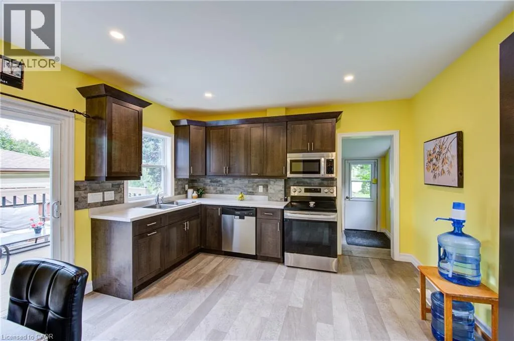 TURN EAST OFF OF WOODSTOCK ST. S. ONTO DECEW ST. W. HOUSE IS ON THE SOUTH SIDE OF STREET Discover an exceptional family home in a prime location! This charming 1.5-story residence boasts 3 bedrooms, 1.5 baths, and close to 2000 sq. ft. of comfortable living space. Its sought-after setting places you within walking distance of downtown Tavistock, local schools, parks, and all the amenities this family-friendly community offers. Commuting is a breeze, with quick access to Kitchener-Waterloo and Stratford. Step inside to a spacious main floor that includes a welcoming living room, leading into a large, bright, and recently renovated kitchen. From here, a convenient walk-out leads to a deck overlooking your private, deep, and fenced mature yardâperfect for outdoor entertaining or family fun with above ground pool. The main level also features a newly renovated bathroom complete with a stunning walk-in shower. One of this home's most exciting features is the converted garage, now a flexible additional living space. Currently used as a rec room, it also offers a walk-out to the rear yard, making it ideal for a granny flat, a home-based business (like a hair salon), or a dedicated home office. Upstairs, you'll find four generously sized bedrooms, including a massive master bedroom with stylish laminate flooring. Recent updates include fresh paint throughout the bedrooms, living room, and kitchen. Rest easy knowing the mechanicals are in excellent working order, including a furnace new in 2015/2016 with heat pump. This home truly offers a fantastic opportunity for comfortable family living and versatile space! (id:27476)