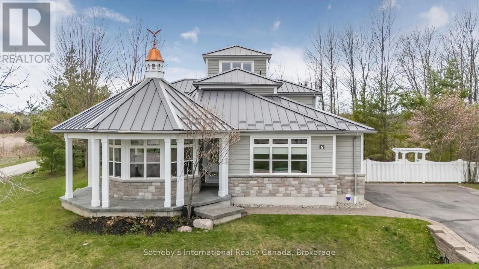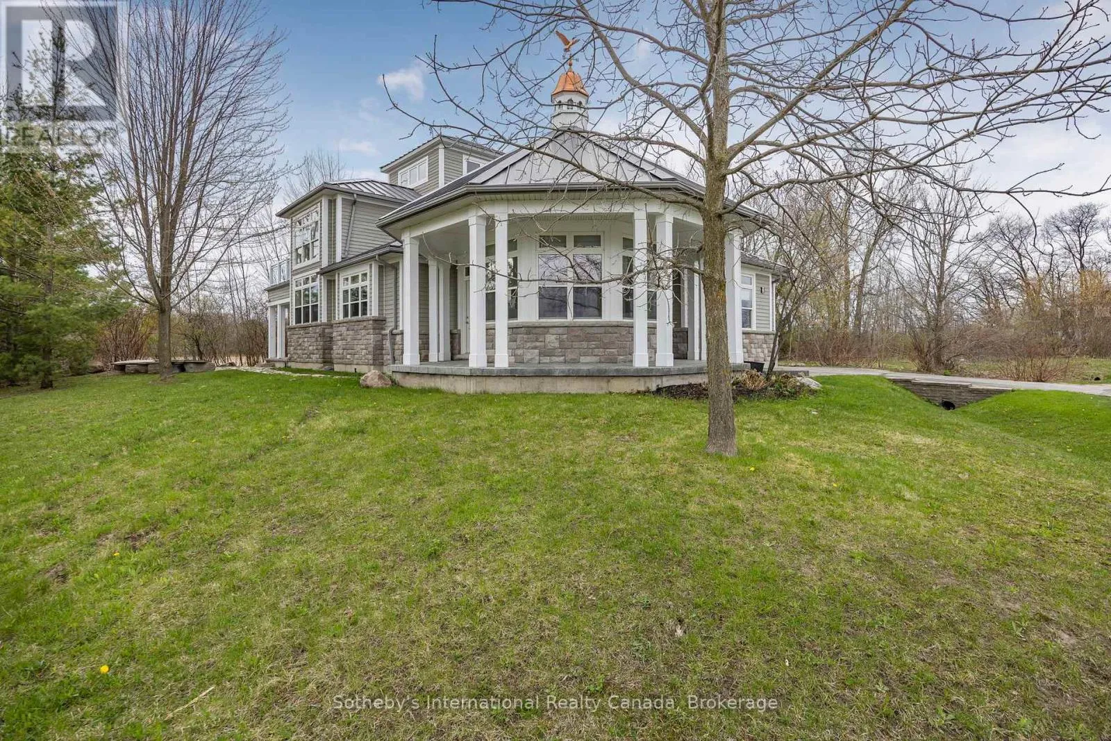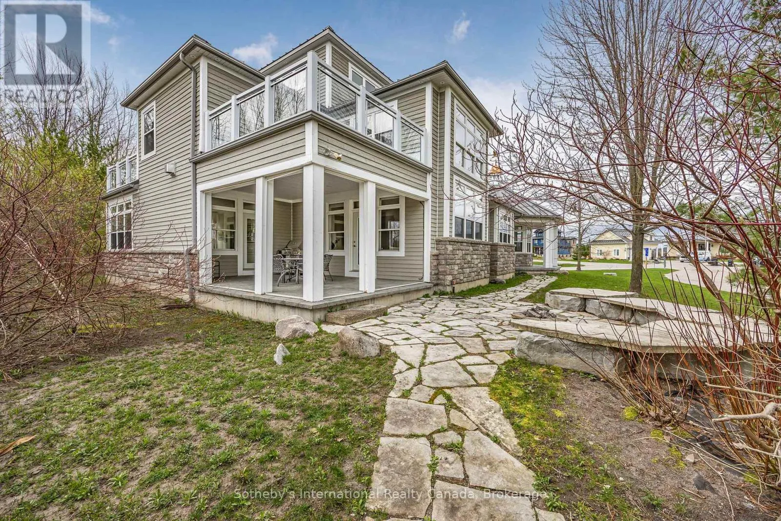 Cross Streets: Dock Lane & Swan Lane. ** Directions: Dock Lane to Swan Lane. With its cupola, refined rooflines, and inviting front porch, the home makes a striking first impression.. Tucked at the end of a quiet cul-de-sac in a gated waterfront community in Port McNicoll, this Cape Cod-inspired home offers over 3,000 sq ft of light-filled living space. Inside, the layout flows beautifully from the welcoming foyer to a bright, hexagon-shaped dining room overlooking the porch, an ideal space to host dinners or sip your morning coffee. Vaulted ceilings and oversized windows create a sense of openness in the main living area, where a gas fireplace and walkout to the screened-in porch set the tone for relaxed comfort. The main-floor primary suite includes a walk-in closet and 4-piece ensuite, while a nearby home office offers a quiet and inspiring place to work from home. The centrally located kitchen is designed for ease and connection, opening into the heart of the house. Upstairs, two bedrooms share a full bath. One of the bedrooms connects to a balcony, while the second enjoys its own private balcony, perfect for morning sun or quiet moments with a book. Built-in floor-to-ceiling shelving in the hallway offers the ideal space for a personal library or curated display. A loft overlooks the living room and opens to a shared balcony, blending style with function. At the top, a lookout sitting room with transom windows offers treetop views and a peaceful space for reading, reflection, or stargazing. The basement provides ample storage, while the large double garage adds practical convenience. Outdoors, enjoy evenings around the stone fire pit or listen to birdsong from the comfort of your screened-in porch. A public walking trail runs along the northern side of the property. With multiple marinas just minutes away, this property is perfectly situated for boaters seeking quick access to launch points on Georgian Bay. Just a short drive to Midland for shopping, dining, and essential amenities, this home offers a refined four-season lifestyle. (id:27476)