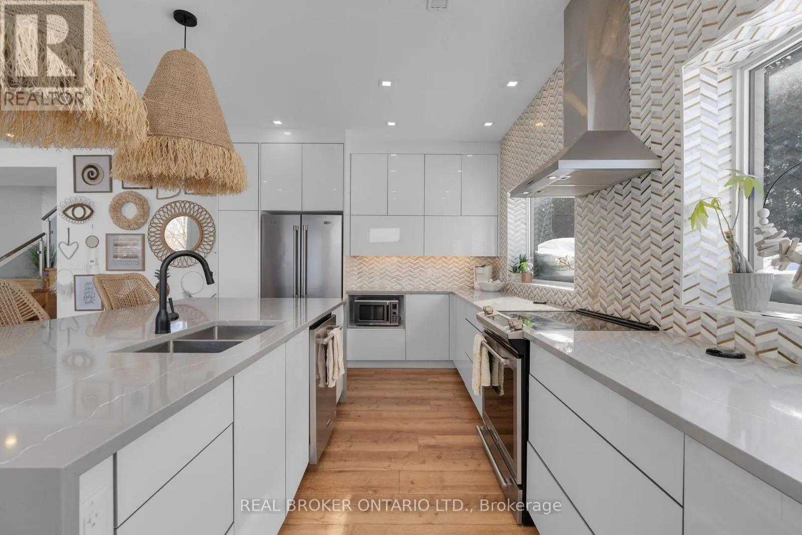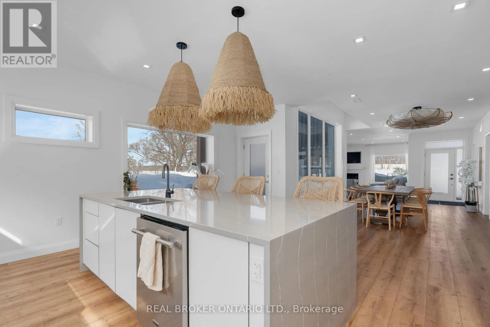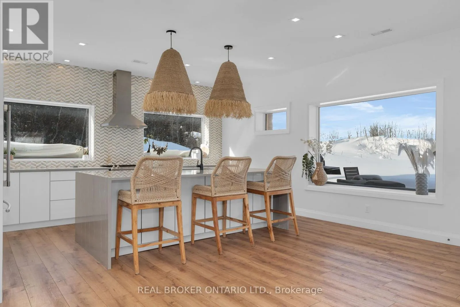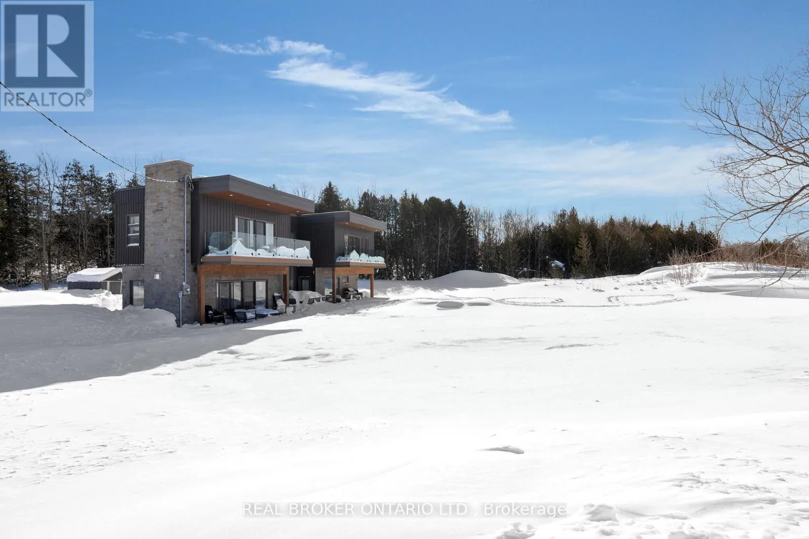Cross Streets: Balsam Street. ** Directions: COLDWATER TO BALSAM TO HEMLOCK. Stunning custom home with views of Georgian Bay at the end of dead-end street on 294-foot-wide lot! This modern cross bohemian home is straight out of a magazine on over 0.5 of an acre. The main level is vast and open with 9-foot ceilings, a great room with plenty of windows and patio doors out to the wraparound interlocked patio and of course a cozy fireplace. The dining room has main to 2nd floor windows and will suit all of your family gatherings (as will the driveway for parking). Onto the oversized custom kitchen with tons of cabinet space, Cambrian quartz waterfall island and countertops and sleek herringbone mosaic backsplash. There is also access to the yard from the kitchen which is perfect for barbequing or just hanging outside with loved ones. This floor finishes up with the main floor laundry and large storage area, powder room and walk-in closet. Up the open staircase and glass railing you reach the 2nd floor where the 9-foot ceilings continue (the home is ICF). A flex space is perfect for the kids to get away from the parents or could be used as an office space with Juliette down to below and a massive window facingthe vast waterfront. An ideal spot to watch all of the windsurfers and boats go by. Four large bedrooms on this level with vinyl and heated floors all with at least a double closet, if not two doubles. Two full bathrooms, each with 5-pieces (dual vanities) and two covered balconies (with composite decking) facing the water perfect for the pink and purple regular sunsets. Enjoy nature at your doorstep with tons of trees, the Tay Trail with over 18 kilometer's to explore or Waubaushene Beach and Pier just a short walk away. 5 minutes to 400 HWY, LCBO and Tim Hortons, 30 minutes to Barrie, 80 minutes to Pearson Airport. Waubaushene's quiet loving town will win you over. Painted with Benjamin Moore March 2025. Driveway 2025 (crusher run) (id:27476)