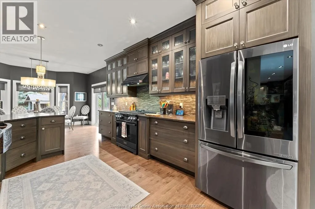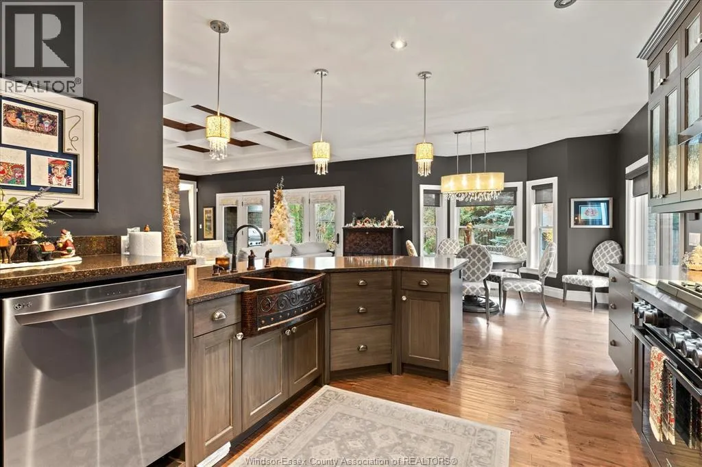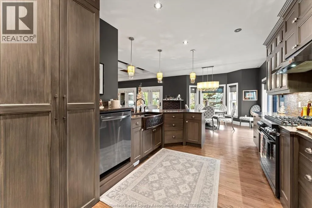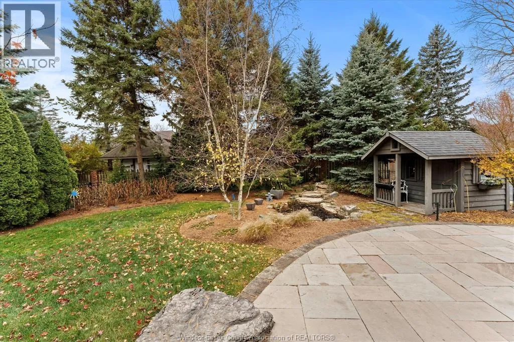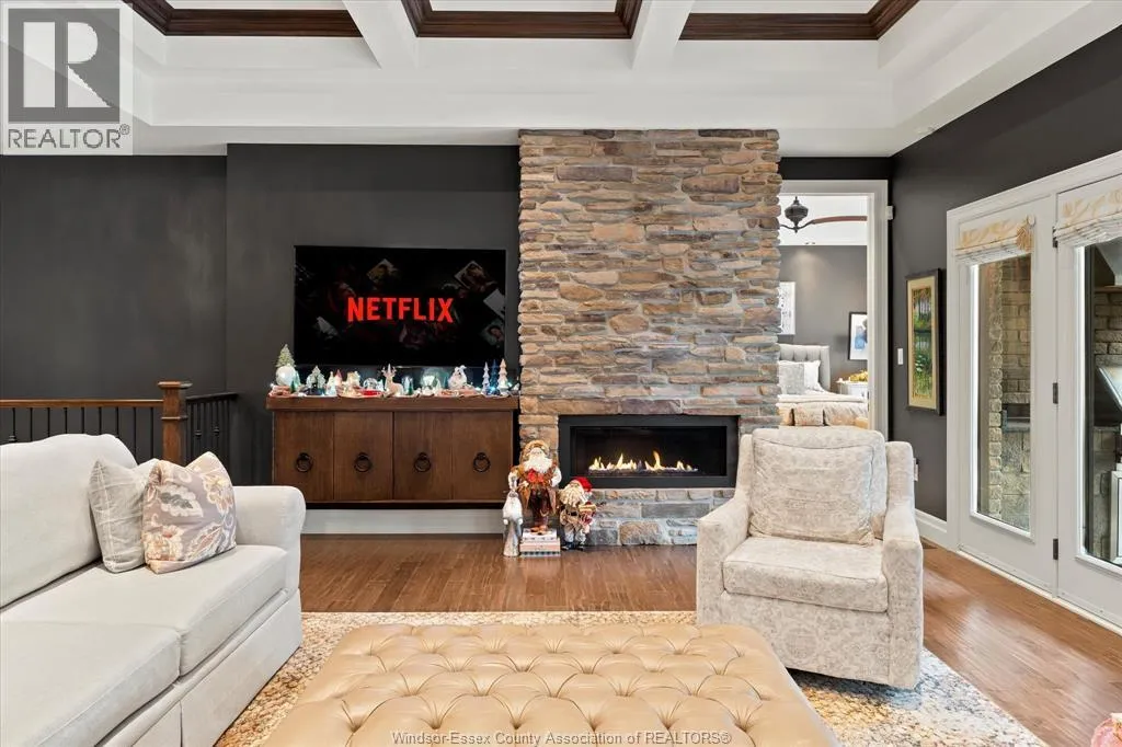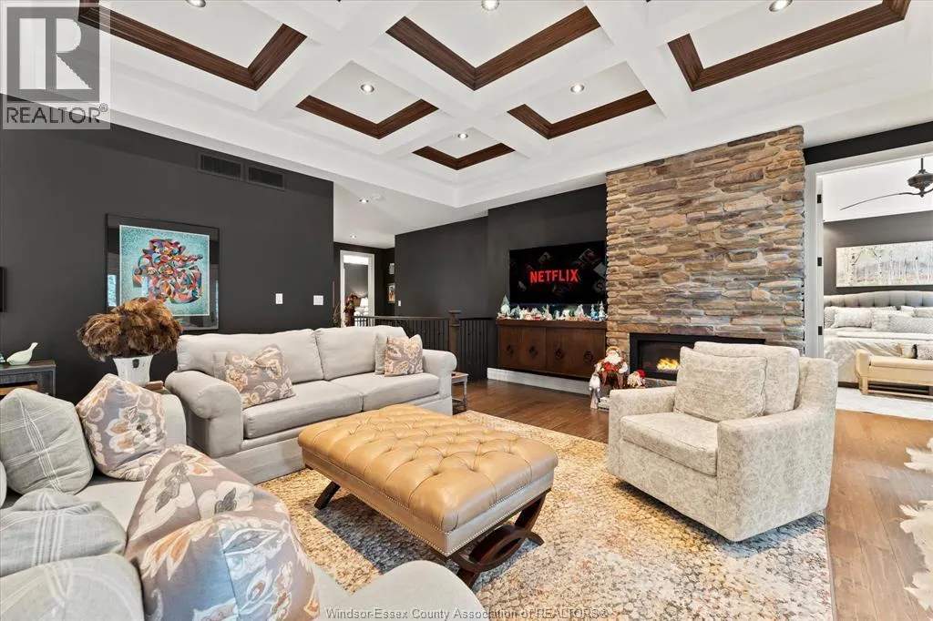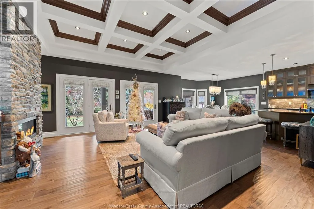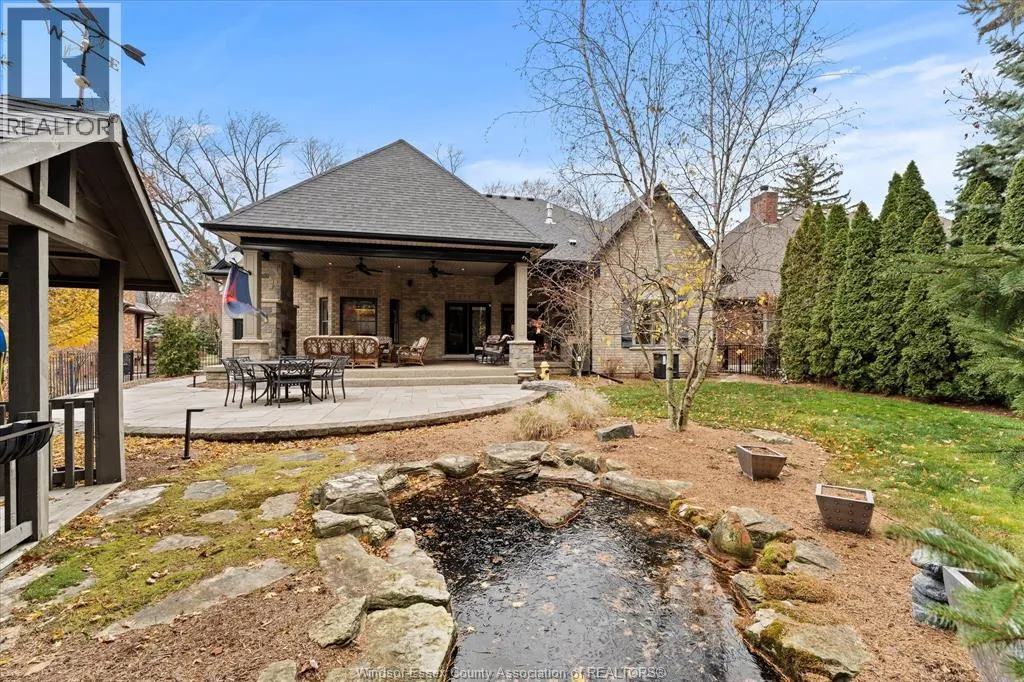 Nestled in the highly sought-after Town of Tecumseh, known for its waterfront trails, top-tier schools, vibrant dining, and premier golf, this exceptional residence showcases the signature craftsmanship of Timberland Homesâan award-winning custom builder celebrated for timeless design and flawless execution. From the moment you enter, the illuminated foyer with architectural accents sets an elegant tone. The great room features a striking floor-to-ceiling stone fireplace, custom entertainment cabinetry, coffered ceilings, and rich maple hardwood throughout. The chefâs kitchen impresses with Cremasco custom cabinetry, Europa quartz counters, premium LG appliances, a 36â Dacor commercial gas range, imported copper sink, and hidden walk-in pantry. The private primary suite offers a spa-inspired ensuite with heated porcelain floors, crystal-lit barrel ceiling, and custom walk-in closet. Outdoors, enjoy a covered patio with Napoleon fireplace, built-in BBQ, cascading waterfall pond, backup gas generator, and professionally designed porchesâcreating a refined private retreat. Oversized exposed aggregate stone driveway flows to a three car tandem garage. (id:27476)