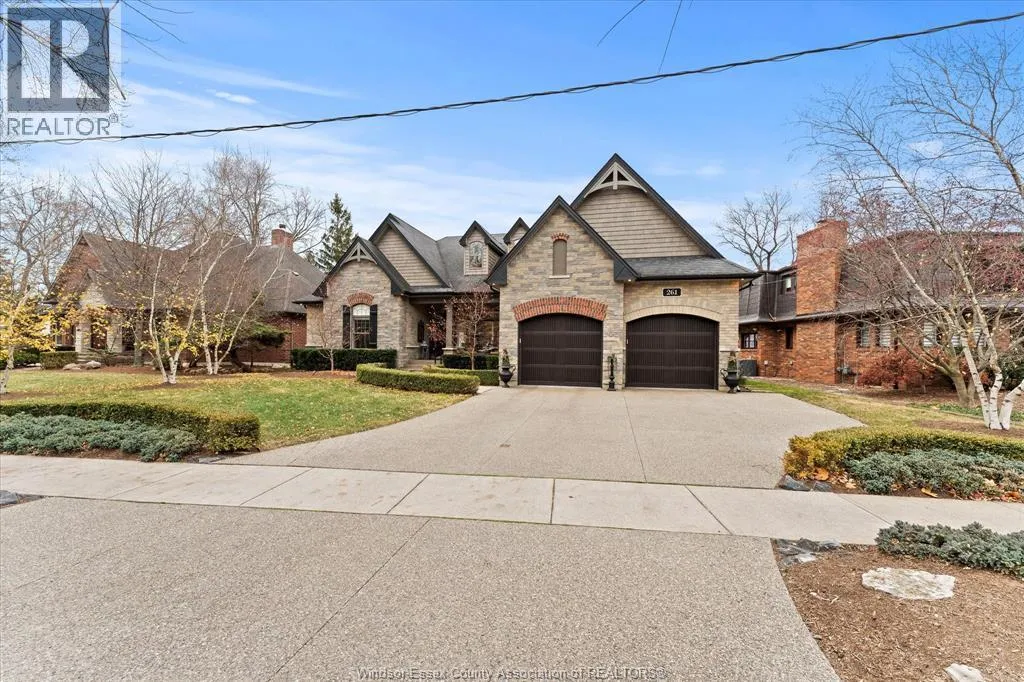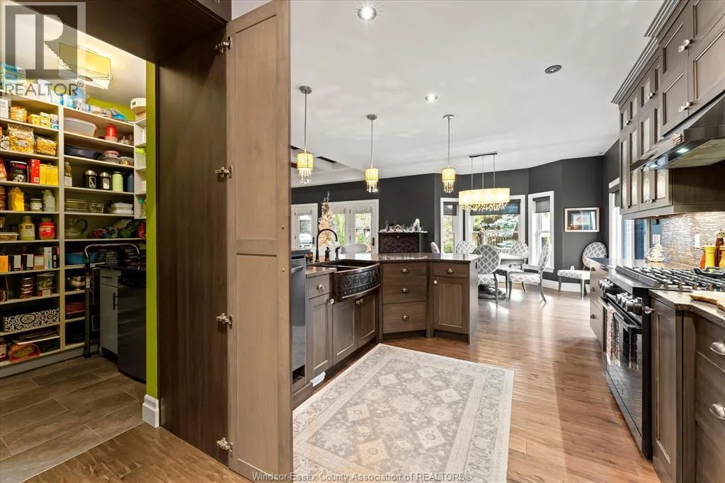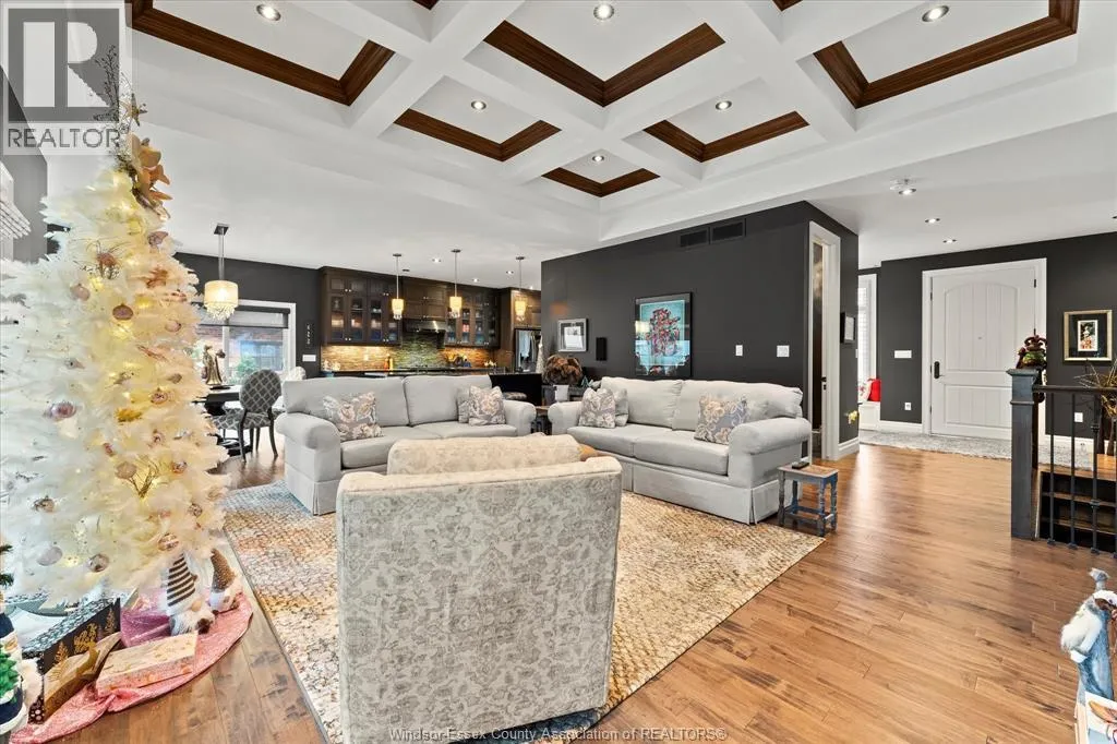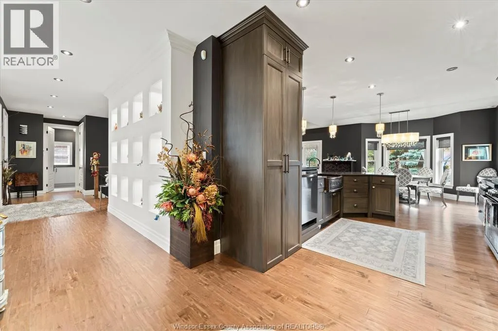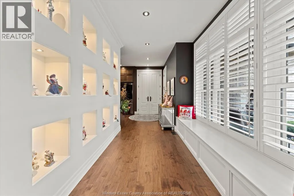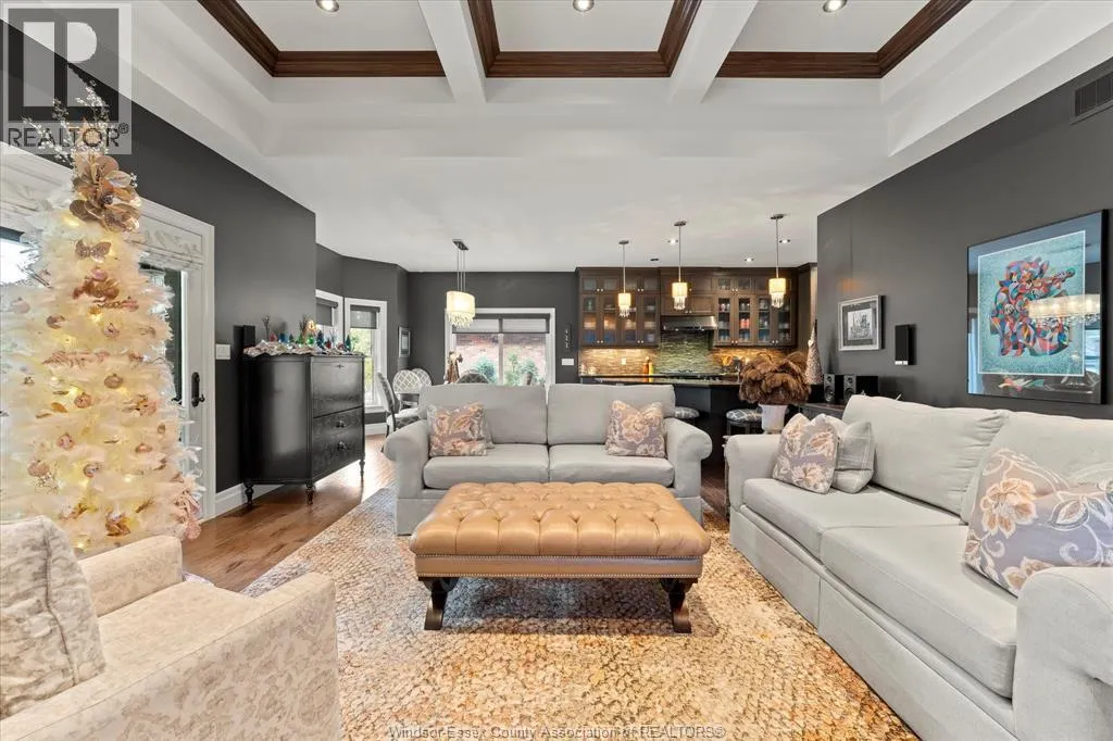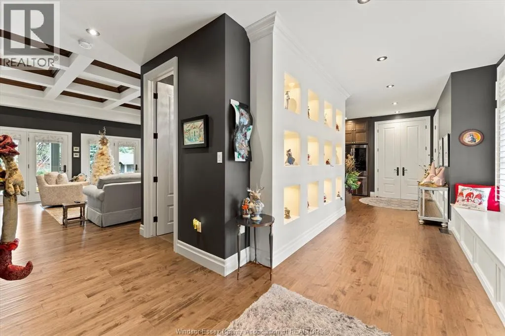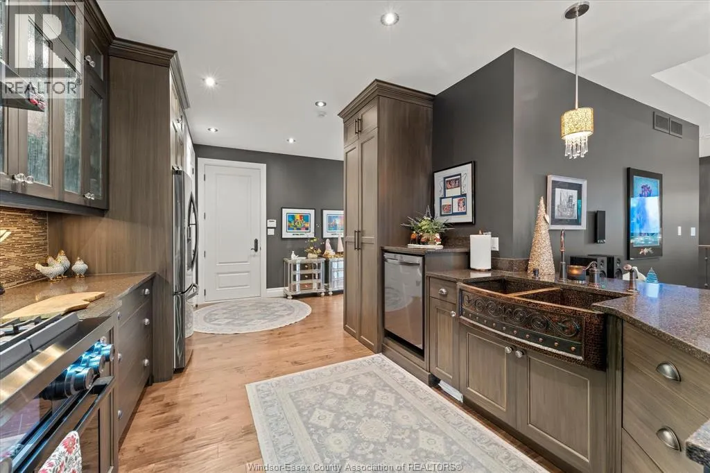 Nestled in the highly sought-after Town of Tecumseh, known for its waterfront trails, top-tier schools, vibrant dining, and premier golf, this exceptional residence showcases the signature craftsmanship of Timberland Homesâan award-winning custom builder celebrated for timeless design and flawless execution. From the moment you enter, the illuminated foyer with architectural accents sets an elegant tone. The great room features a striking floor-to-ceiling stone fireplace, custom entertainment cabinetry, coffered ceilings, and rich maple hardwood throughout. The chefâs kitchen impresses with Cremasco custom cabinetry, Europa quartz counters, premium LG appliances, a 36â Dacor commercial gas range, imported copper sink, and hidden walk-in pantry. The private primary suite offers a spa-inspired ensuite with heated porcelain floors, crystal-lit barrel ceiling, and custom walk-in closet. Outdoors, enjoy a covered patio with Napoleon fireplace, built-in BBQ, cascading waterfall pond, backup gas generator, and professionally designed porchesâcreating a refined private retreat. Oversized exposed aggregate stone driveway flows to a three car tandem garage. (id:27476)