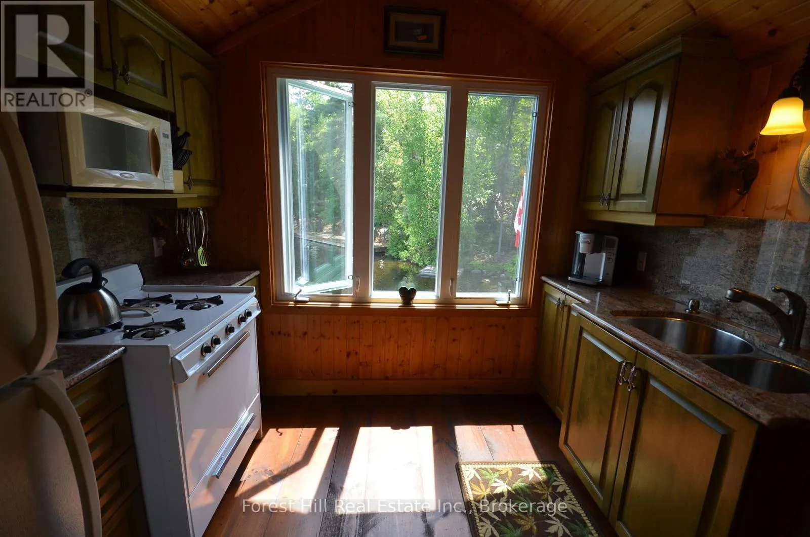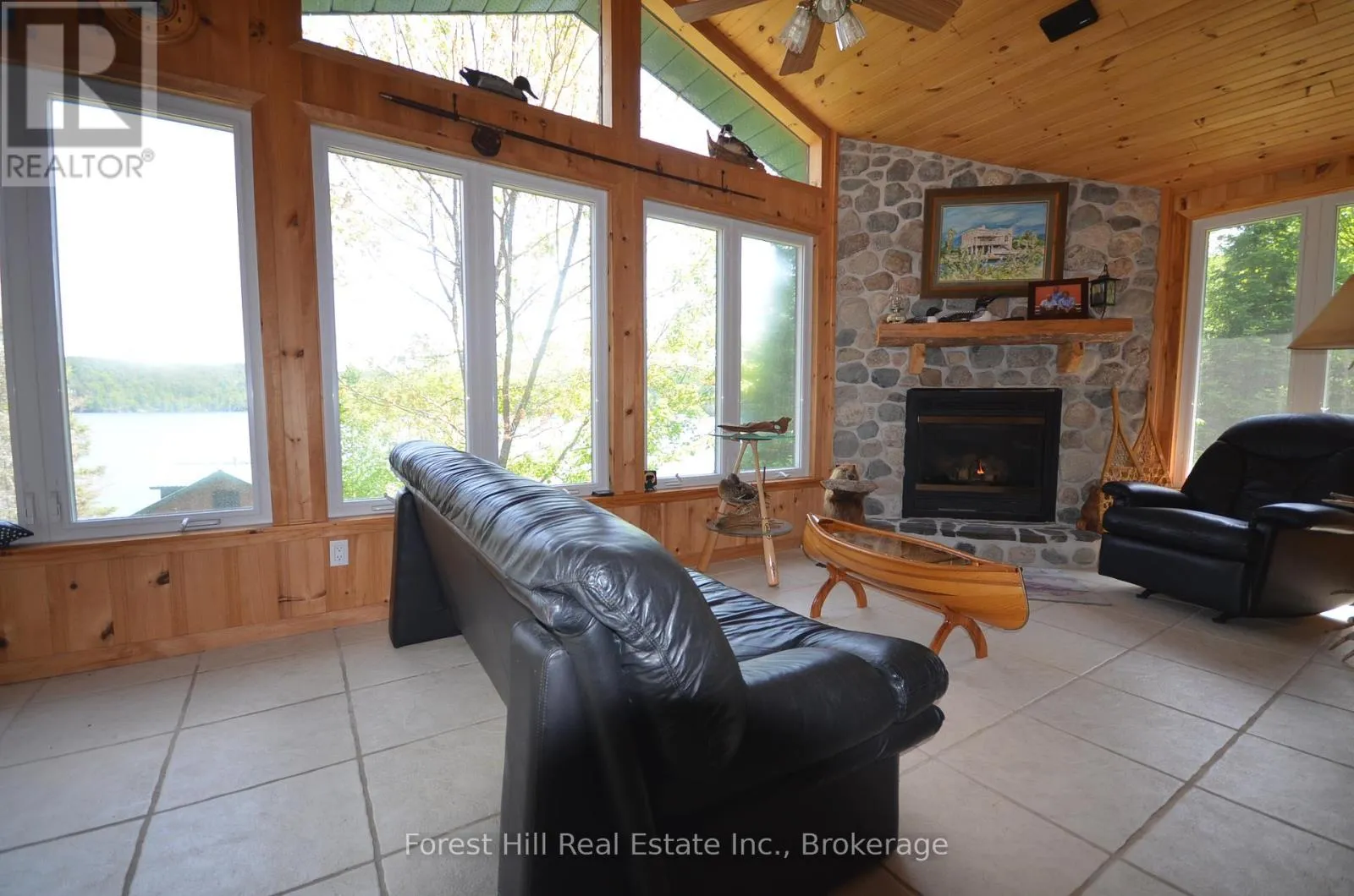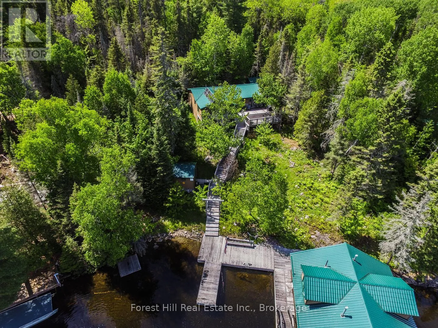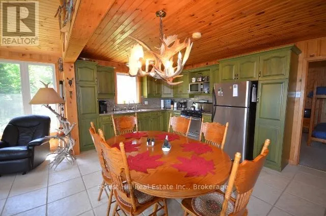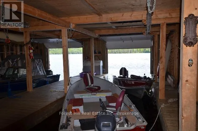 Highway 11 to Rabbit Lake Access Rd. By boat to dock. Embrace a serene lifestyle in this captivating cottage located in the idyllic setting of Teachers Bay/RabbitLake. Just a brief 10-minute boat ride from a secure dock, conveniently situated where you park your car, this authentic north-inspired retreat invites you to escape the everyday hustle and bustle. The fully winterized main cottage spans over 1400 square feet, designed for low maintenance and adorned with a steel roof, new solar panels, and an attractive hard iboard and rock exterior. Step inside to discover four generously sized bedrooms, a full bath, a main living room featuring a propane fireplace, a family room with a cozy wood-burning stove, and a spacious, stunning kitchen. Enjoy the simple pleasures of life on the multilevel deck, whether it's sipping your morning coffee or relishing the sunset. The boathouse suite, essentially a cottage on its own, offers 800 square feet of comfort, complete with a full kitchen, bath, a living room showcasing a propane log set fireplace, and a welcoming bedroom. Winterized for year-round use, it also boasts a private deck overlooking the water. Keep your boats and water equipment sheltered in the multiple-slip boathouse.The property's exceptional features include a dual water filtration system Trojan UV Max, in-wall cell, an automated solar/electrical system with an auto-programmed propane backup generator, and satellite T.V.Revel in the finer details with Carlisle antique plank flooring, granite counters, and rugged property backing onto crown land. The ownership of the waterfront lot beneath the dock and boathouse adds to the allure of this truly exceptional haven. (id:27476)