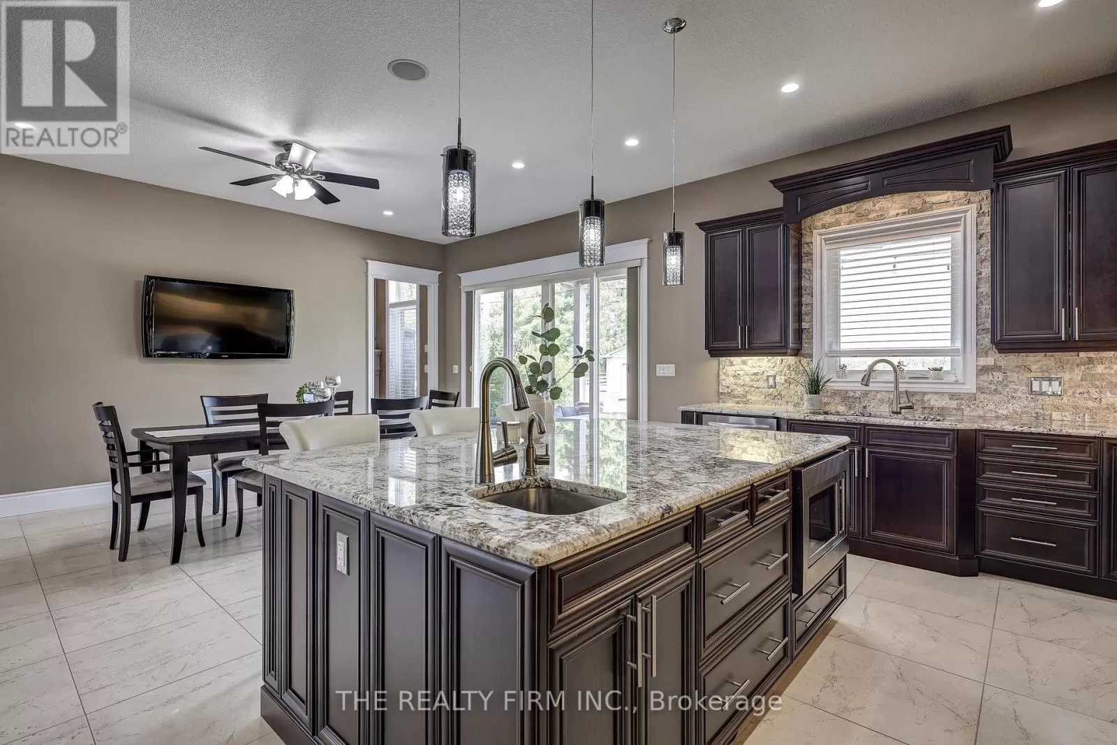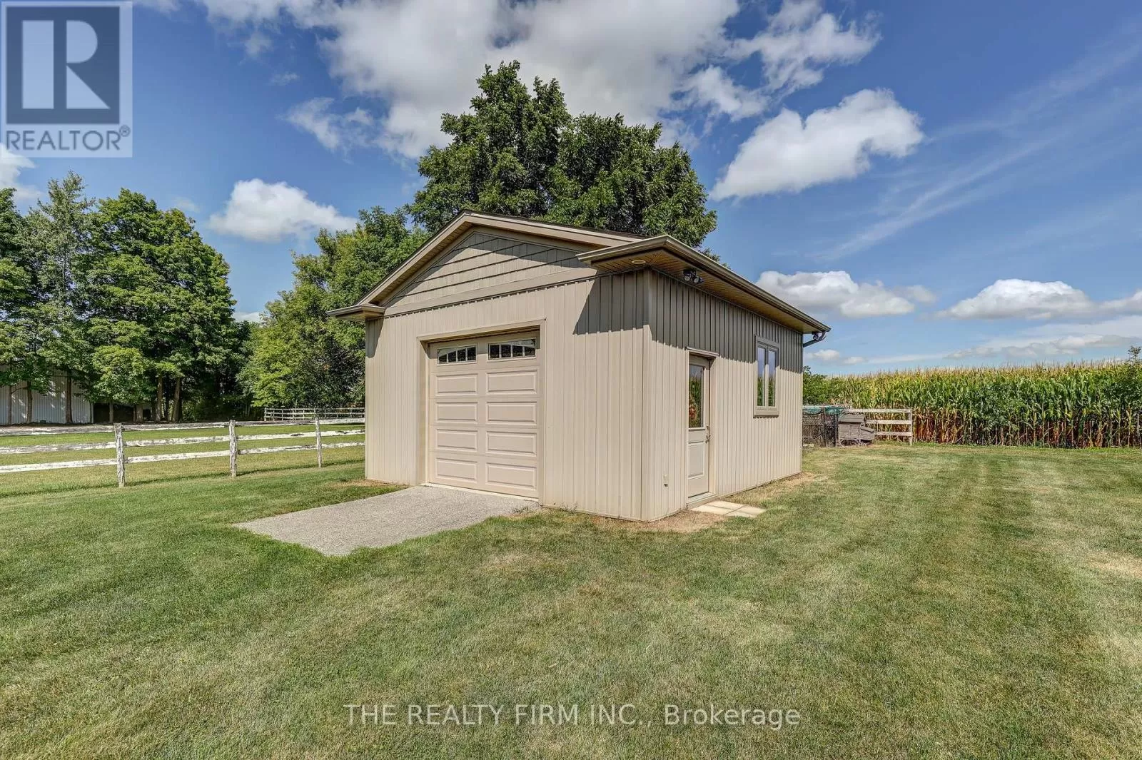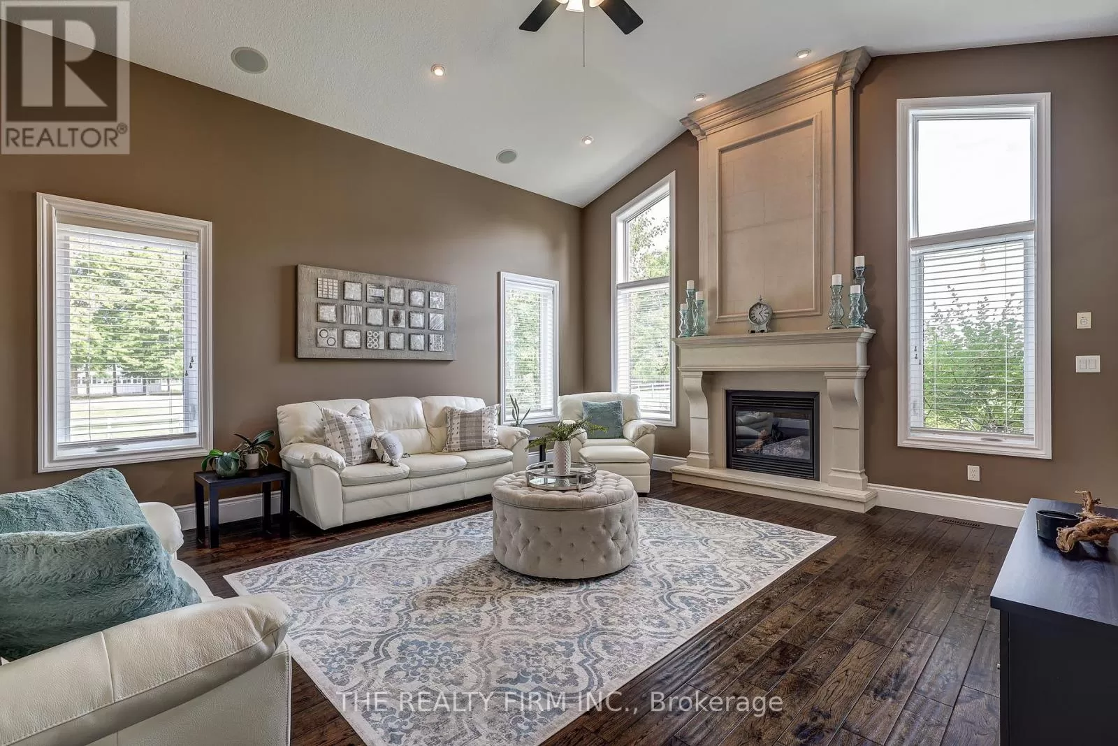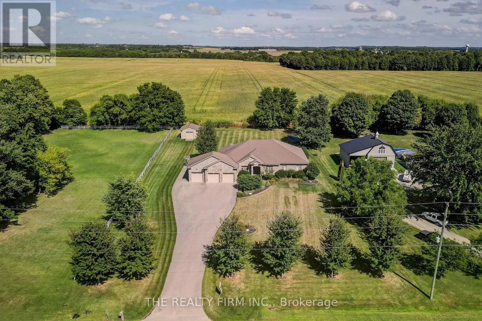 Cross Streets: Thorndale Rd. ** Directions: North off of Thorndale Rd. Welcome to your sanctuary of refined rural living at 22060 Nissouri Rd. Thorndale On. A breathtaking estate nestled on 1.33 acres spanning over 5,000 sq ft with exquisitely finished space. This majestic home features 4 + 1 bedrooms and 3.5 baths, crafted with thoughtful design and premium craftsmanship at every turn. Step through the stately entry into a 12' coffered-ceiling foyer with poplar custom trim flowing seamlessly into the family room with its soaring 13 vaulted ceiling and commanding floor-to-ceiling plaster gas fireplace. The kitchen, dazzles with maple cabinetry, a massive island with sink with reverse osmosis, a 6 burner gas stove, double wall ovens and luxe finishes like a travertine backsplash, Brizo faucets and Electrolux ICON fridge/freezer. The main level boasts 10 ceilings, 8 doors, hand scraped oak floors, Italian porcelain tile, granite throughout and an ambient speaker system all complemented by Hunter Douglas window treatments. A convenient main-floor laundry and custom drop zone add to daily ease. The lower level inspires with a stylish wet bar, wine fridge, additional bedroom, full bath, quartz and dual electric fireplaces, oak staircase, spray-foam insulation, separate garage access and a cold room. This property is ideal for multigenerational living with the separate lower level entrance, full amenities and expansive layout. Outside experience meticulously curated 360 landscaping and lighting, stamped concrete walkways and patios, a covered 10' x 25' patio with speakers, insulated attic & 2 extra circuits for a future sunroom addition. Completing the yard is a gas fire pit, a 20' x 22' shed with hydro, gazebo, backyard hydrant and a triple garage with an extra bay door to the back. Thorndale offers tranquility and vibrant community living with playgrounds, splash pad, skate park, sports courts and community gardens. A short drive to Londons premier shopping, business district & airport. The perfect blend of rural and urban charm (id:27476)
