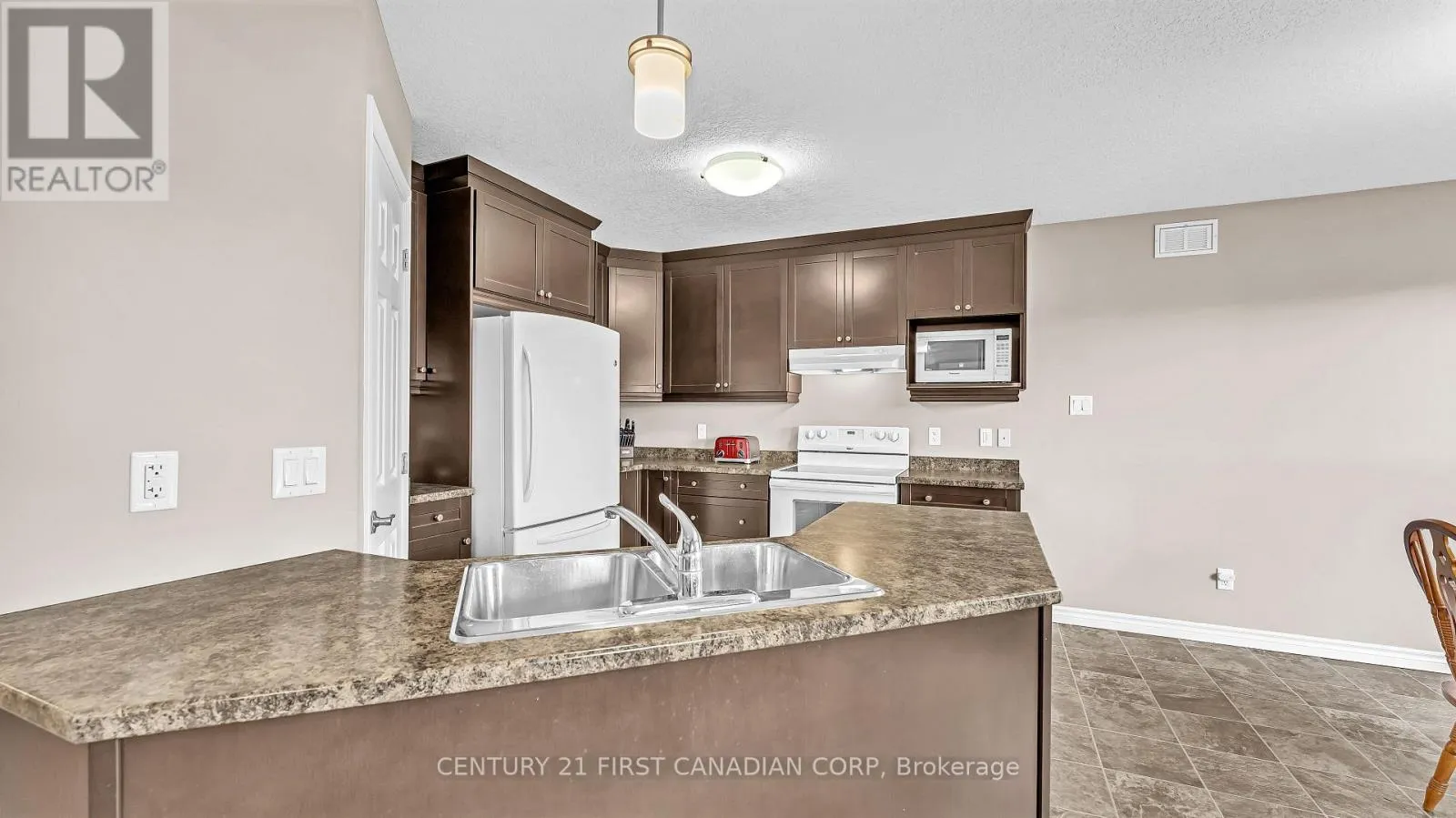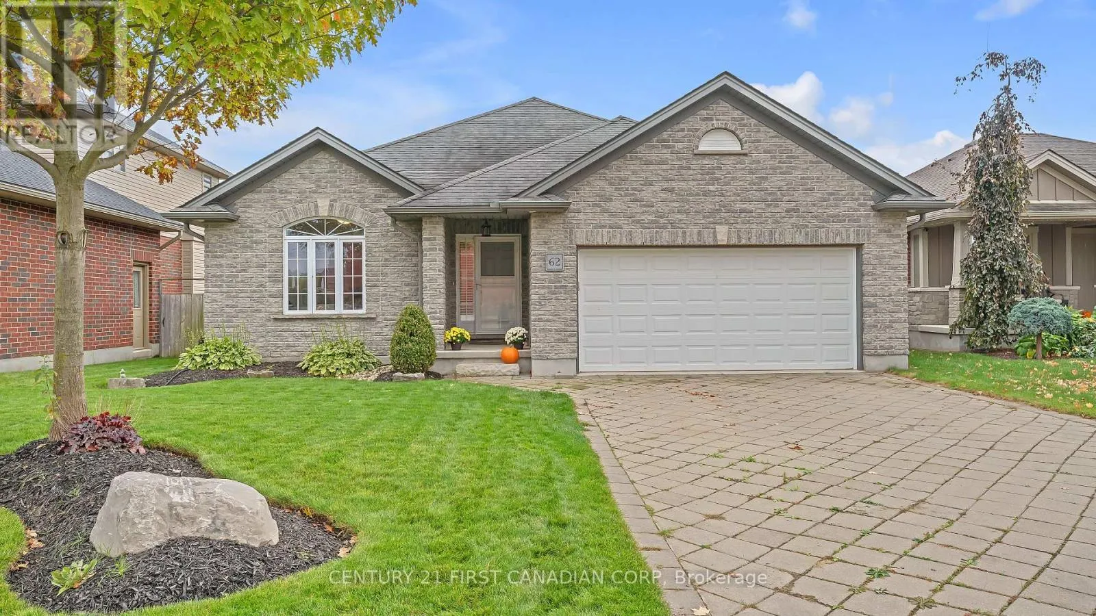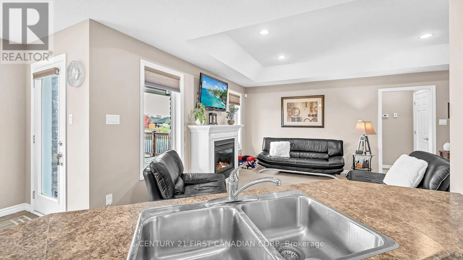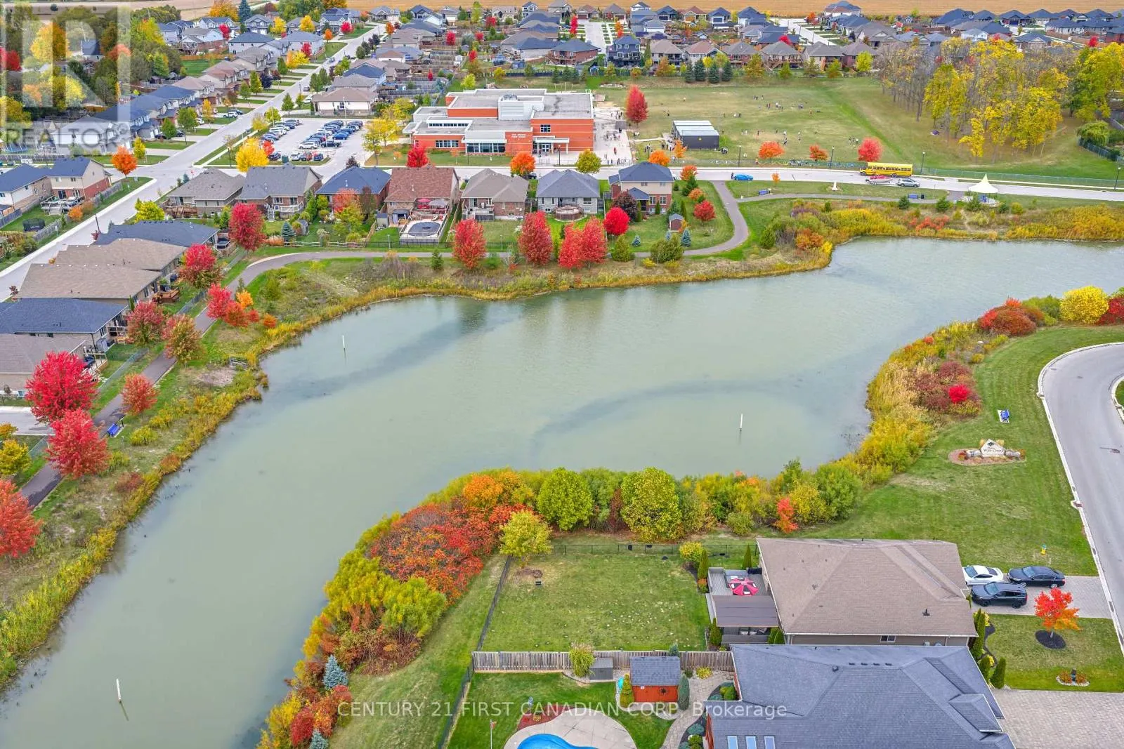 From Nissouri Road, turn onto Elliott Trail & the house will be on the right, just past Leesboro Trail Welcome home to this fantastically positioned 3 Bedroom All-Brick Bungalow with Double Car Garage, on a RARE LOT backing onto Wye Creek Pond, right in the heart of the close-knit community of Thorndale. This home offers exceptional flow, including a spacious front foyer which leads to an open-concept floor plan, including an eat-in kitchen with tons of cupboard and counter space, together with an island and corner pantry, open to the eat-in area which overlooks picturesque views of the pond and stunning landscaping surrounding the walking trails. The dining area has a door out to the backyard deck and large fenced yard, views to enjoy while sipping your morning coffee, or host summer dinners on the deck with peace and ambiance. The main floor also showcases a vast living room area with a gas fireplace and trayed ceiling including pot lighting. The main floor is also complete with a large Primary Bedroom with 3PC ensuite, as well as two other main floor bedrooms and an additional 4PC washroom. The sprawling basement is unspoiled offering ample opportunity for another bedroom and a large family & rec room area, already framed or easily modified-plus tons of storage space! The lower level also features a good amount of sunlight with larger windows and the opportunity for another bathroom with an existing extra washroom rough-in. The water heater is owned. Thorndale offers quiet small town charm, with the convenience of being less than 15 mins to London city amenities. Excellent schools & parks in the area-just steps away from West Nissouri Public School. Garage fully insulated, as well as the garage door. Gas BBQ hook-up. (id:27476)