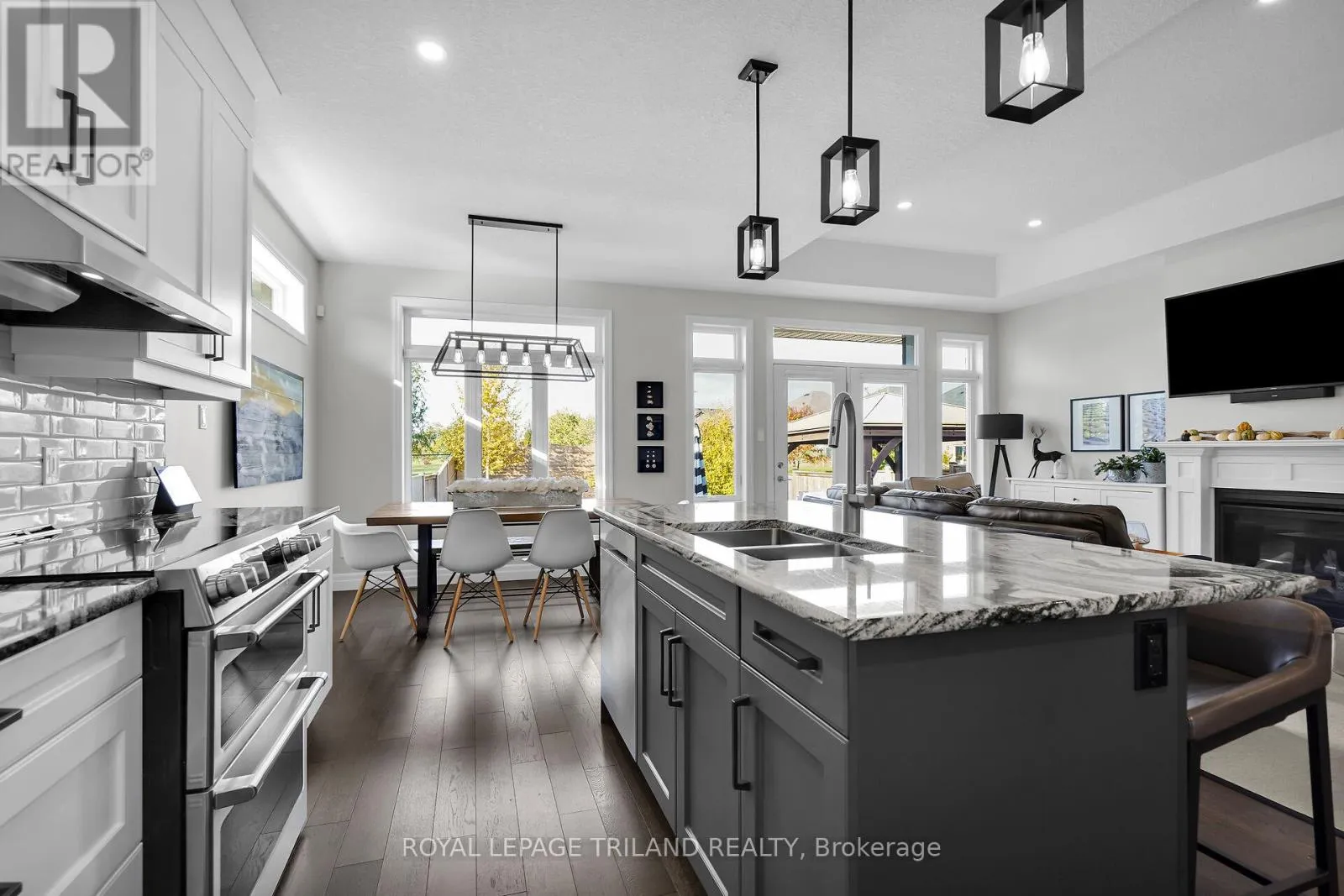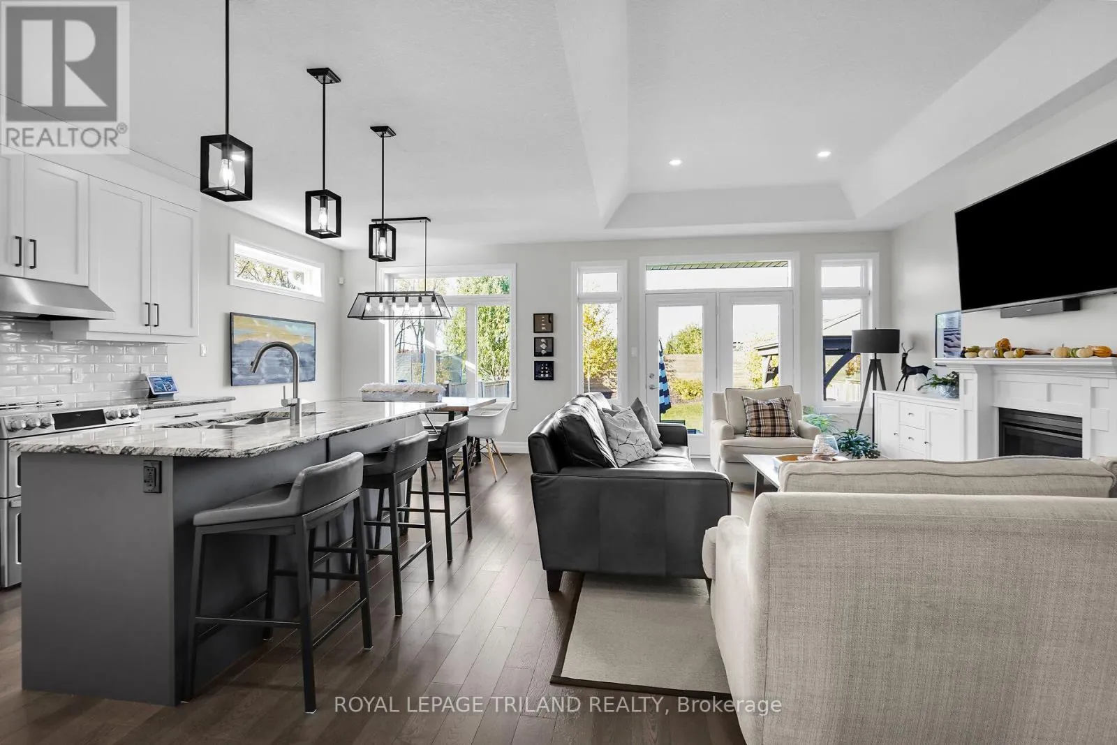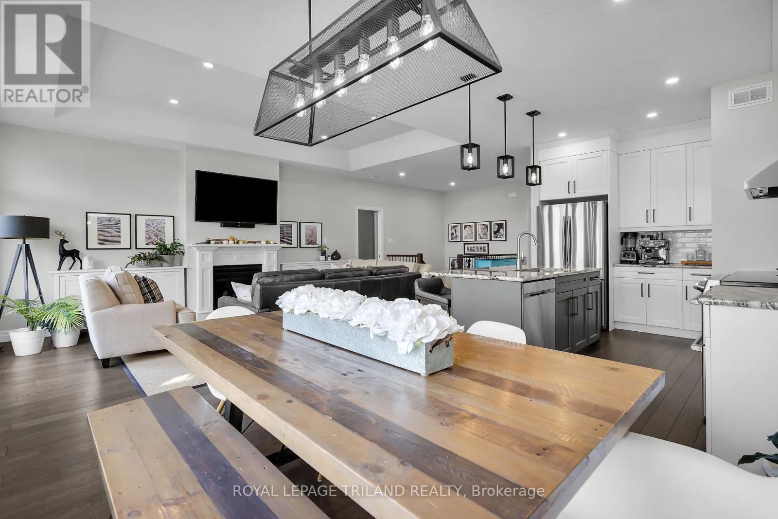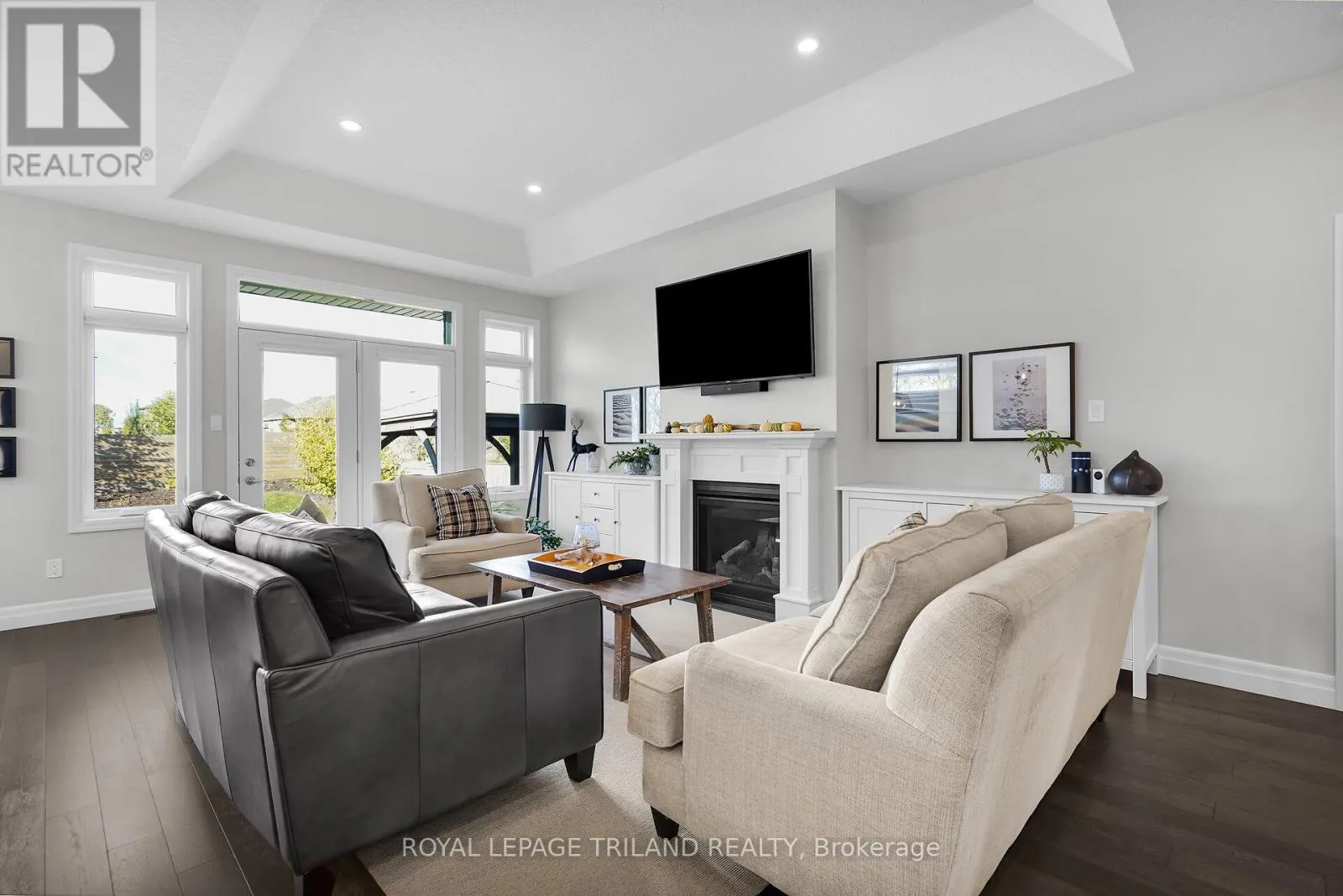 Cross Streets: SLAMMER AND BROOKER. ** Directions: FOLLOW MEDWAY ROAD EAST THAT WILL CHANGE TO THORNDALE ROAD KEEP STRAIGHT AND ROAD TURNS INTO KING STREET THEN JUST BEFOR THE VILLAGE OF THORNDALE TURN LEFT ON BROOKER. Check out this BEAUTY backing onto Greenspace! Meticulously maintained inside and out, this exceptional home sits on a deep 155' private lot backing at the far end of a school field-offering both privacy and open views.The inviting covered front porch sets the tone, while the backyard is designed for entertaining with a tastefully finished patio, pergola, and cozy outdoor fireplace-perfect for relaxing evenings or hosting guests.Car enthusiasts and hobbyists will appreciate the oversized 24.6' x 20' garage, offering ample space for vehicles, storage, or a workshop.Inside, the thoughtfully designed layout features main floor laundry, two spacious bedrooms plus one additional bedroom on the lower level, and three full bathrooms. Elegant ceramic tile and engineered hardwood flooring lead into the stunning great room, highlighted by a tray ceiling and gas fireplace-creating a warm yet sophisticated gathering space.The lower level includes a generous bedroom and a beautiful 4-piece bath, ideal for extended family, guests, or a teenager seeking their own retreat.Loaded with modern upgrades including auto WiFi light switches, a GenerLink power hook-up system, and a Celebright permanent outdoor lighting system-this home blends style, comfort, and smart functionality.Attention to detail and a true flair for design define this beauty. A rare opportunity to own a move-in-ready home in a prime setting. (id:27476)