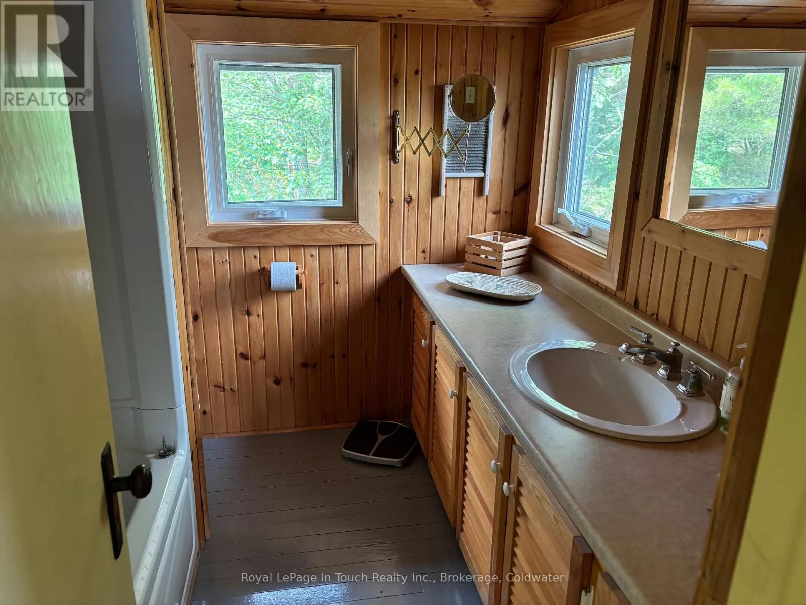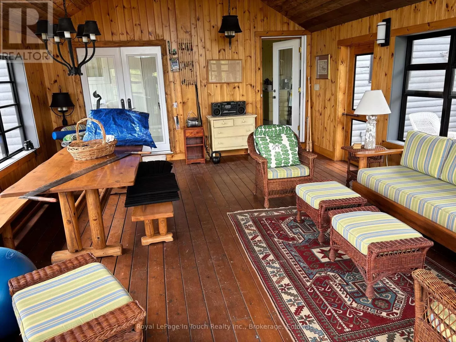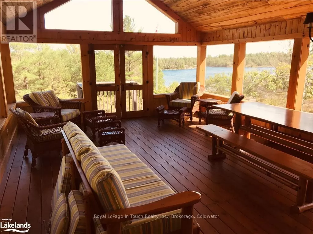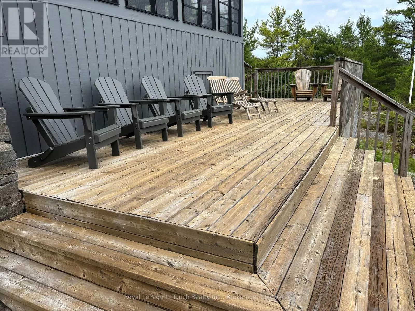 BY BOAT FROM PARRY SOUND, MOON RIVER AND MOOSE DEER PT (12 MILE BAY) MARINAS 375 Georgian Bay Water is a beautifully maintained cottage in the legacy Georgian Bay style with contemporary features that make holidaying truly relaxing. Offers unobstructed panoramic southwest views of the bay, the original hardwood floors, high ceilings with the original huge, by modern standards, rough hewn beams. old-style bedrooms, a large screened in porch, perfect for entertaining multitudes that's surrounded on three sides with decks for sun worshippers and barbecuing. It sits on 7.87 acres with 1500 ft of shoreline that bends around the mouth of the Garden Channel, an undisturbed natural paradise for swimming, bird watching or quiet paddling. The contemporary features include, double hung windows; solar panels, backup gas-powered generator, a writers studio by the water. Above all, its private. The cottage is set back from the water on a height of land that allows for its expansive views but close enough to provide easy access to the two new docks. (id:27476)