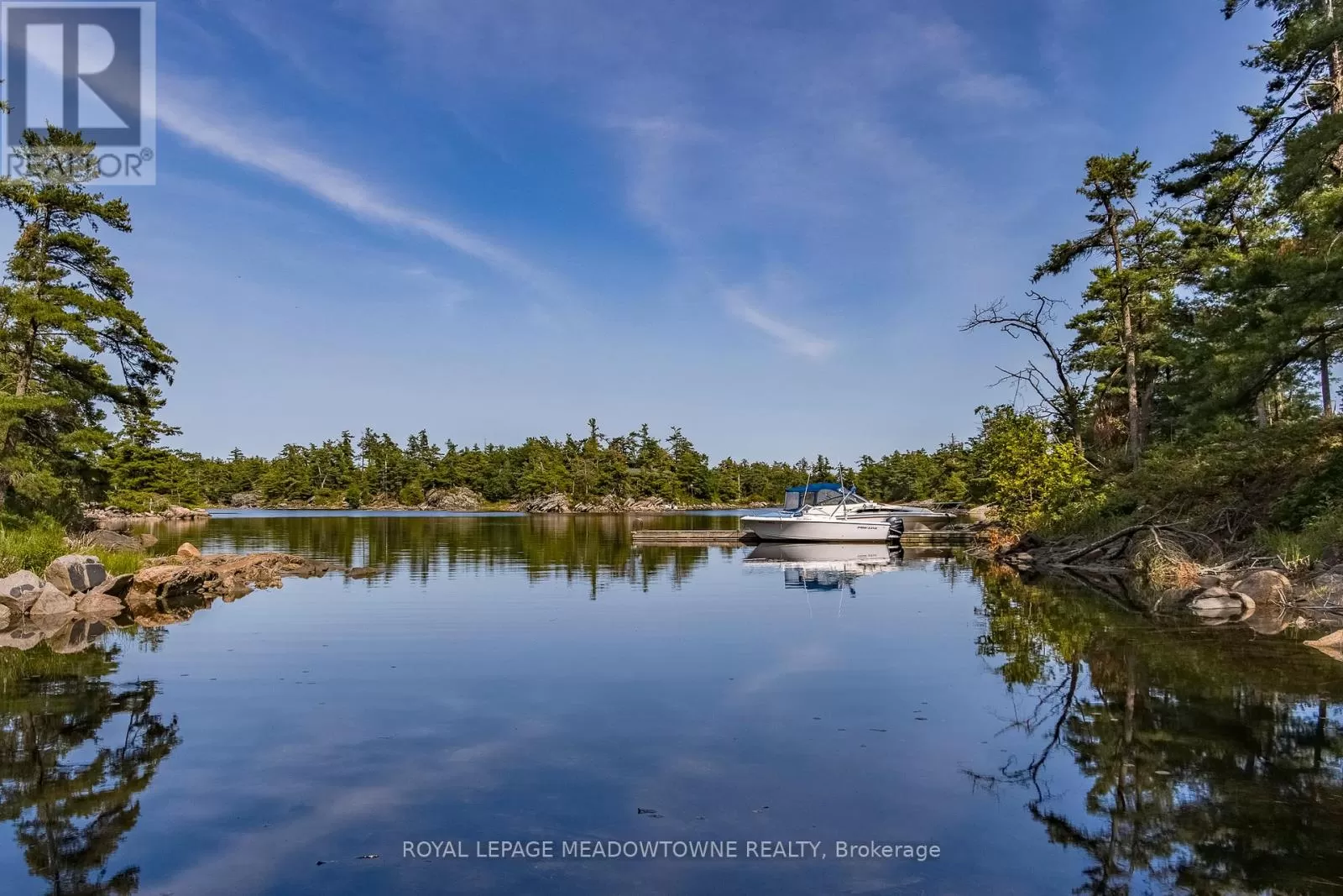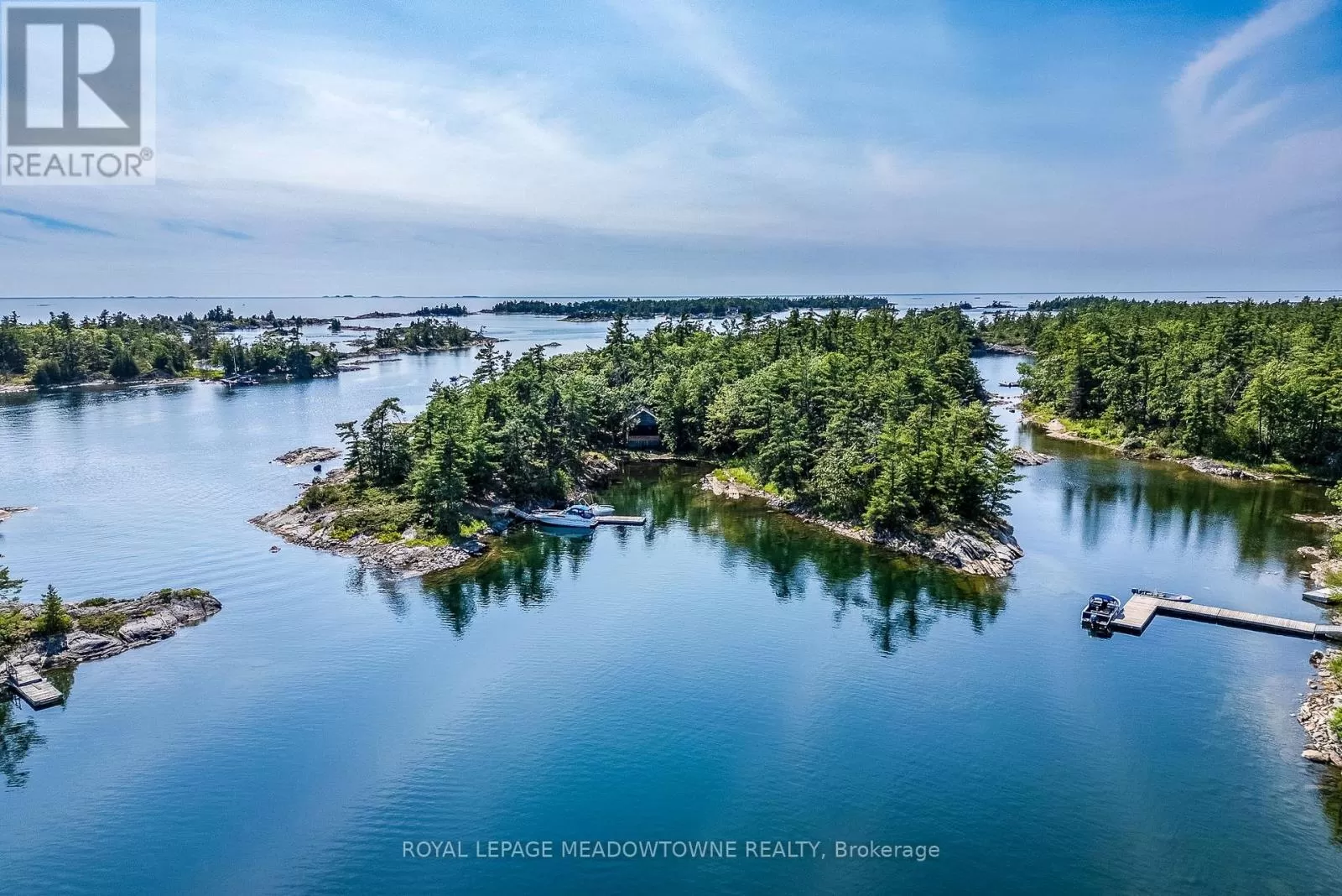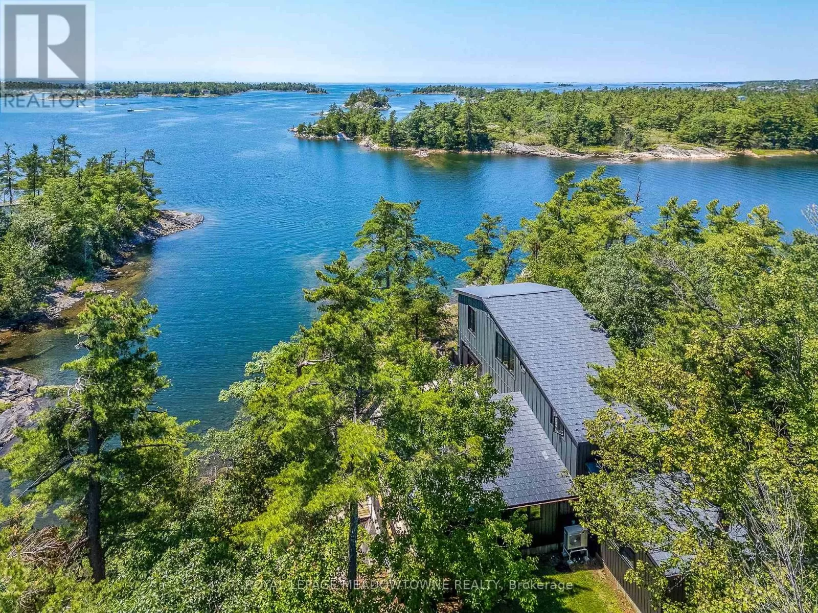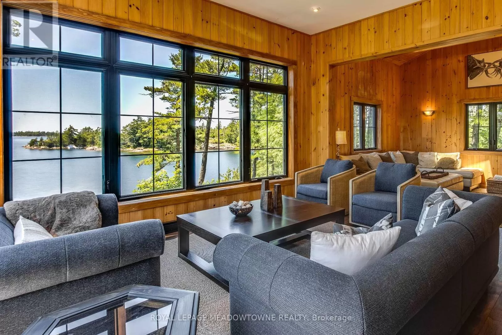Cross Streets: HWY 400N to Twelve Mile Bay Rd. to Moose Deer Point Marina, 8 min by boat. ** Directions: HWY 400N & Twelve Mile Bay Rd. Set on a private 5-acre island, this west-facing property offers sweeping views of Georgian Bay, mature forests, and majestic granite outcroppings- an idyllic setting for family gatherings, summer escapes, or elegant entertaining. Approached via a picturesque boardwalk winding through rugged rock and towering pines, the main house sits elevated beneath a canopy of oak and pine trees. Enjoy breathtaking sunsets from an expansive west-facing deck that feels suspended between sky and water. Exquisitely designed interiors using the finest materials and finishes integrates a refined sensibility with the comfort of cottage life. This is Muskoka quality and style in a classic Georgian Bay setting! Fully renovated in 2024-25 the 2328 sq.ft.cottage features a spacious dining room with a gas fireplace, and an open concept west-facing living room and vaulted TV room- offering stunning views of the bay and ideal spaces for family gatherings or intimate moments. The Chefs Kitchen anchored by an impressive 8-ft island and complemented by a sleek bar area is ideal for both culinary creativity and entertaining. The two upper-level bedrooms provide comfortable sleeping quarters, while the main primary bedroom offers privacy, space and quiet serenity. A cozy lounge/office & 2-pc bath completes the upper floor, offering additional flexibility for your needs. A large 4 pc bath and laundry are adjacent to the master on the main floor. Further enhancements include: - A large backyard with views extending deep into the forest, complemented by perennial gardens and an area for recreation - a 840 sq ft waterside recreation building with vaulted ceilings and a huge screened-in porch -A well-equipped fitness shed - A private beach and fire pit with day dock - A protected deep-water dock for larger boats - A scenic waterfront walking trail linking the five buildings on the island. Only 8-10 min by boat from local marina via protected channel, easy even for a timid boater. (id:27476)