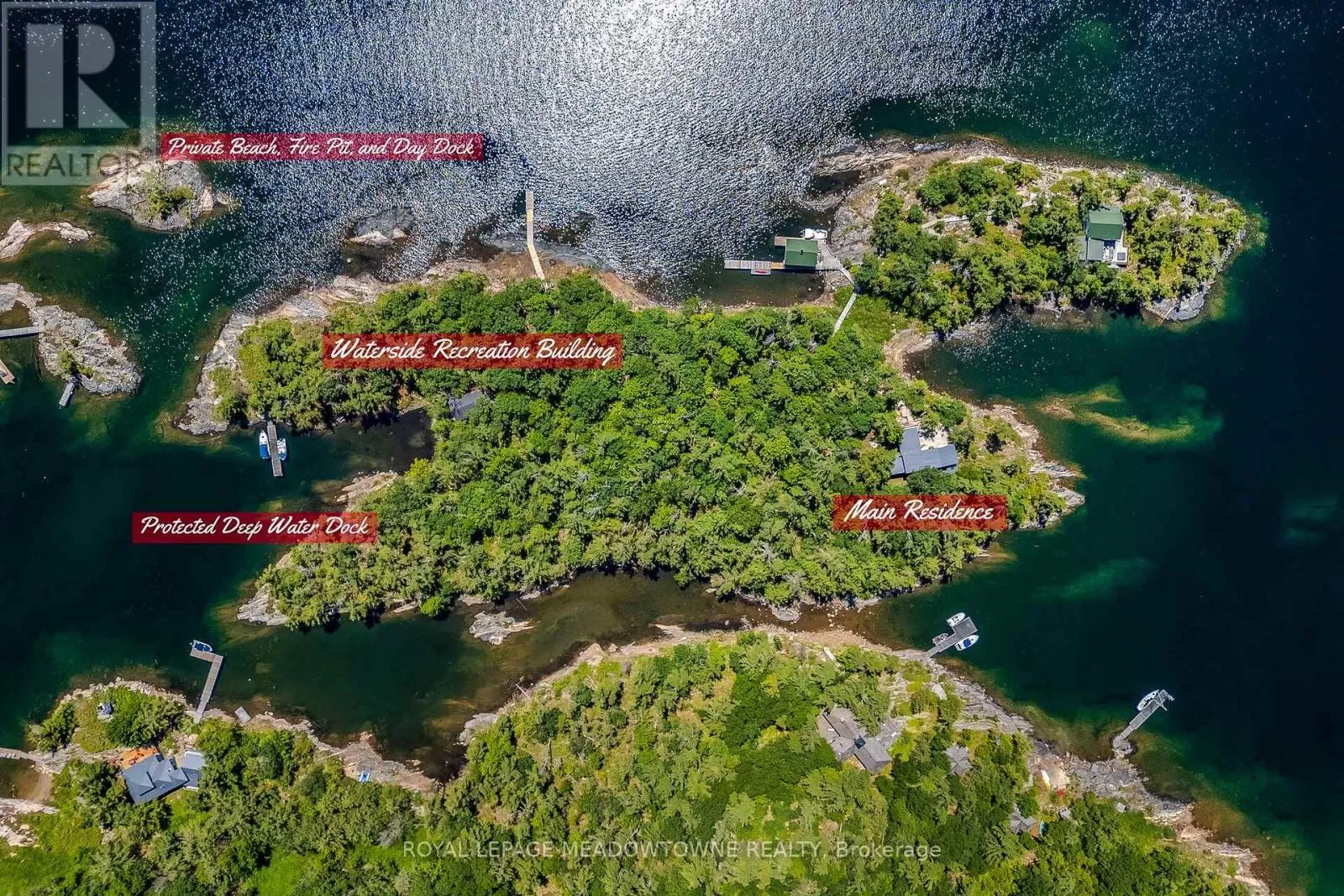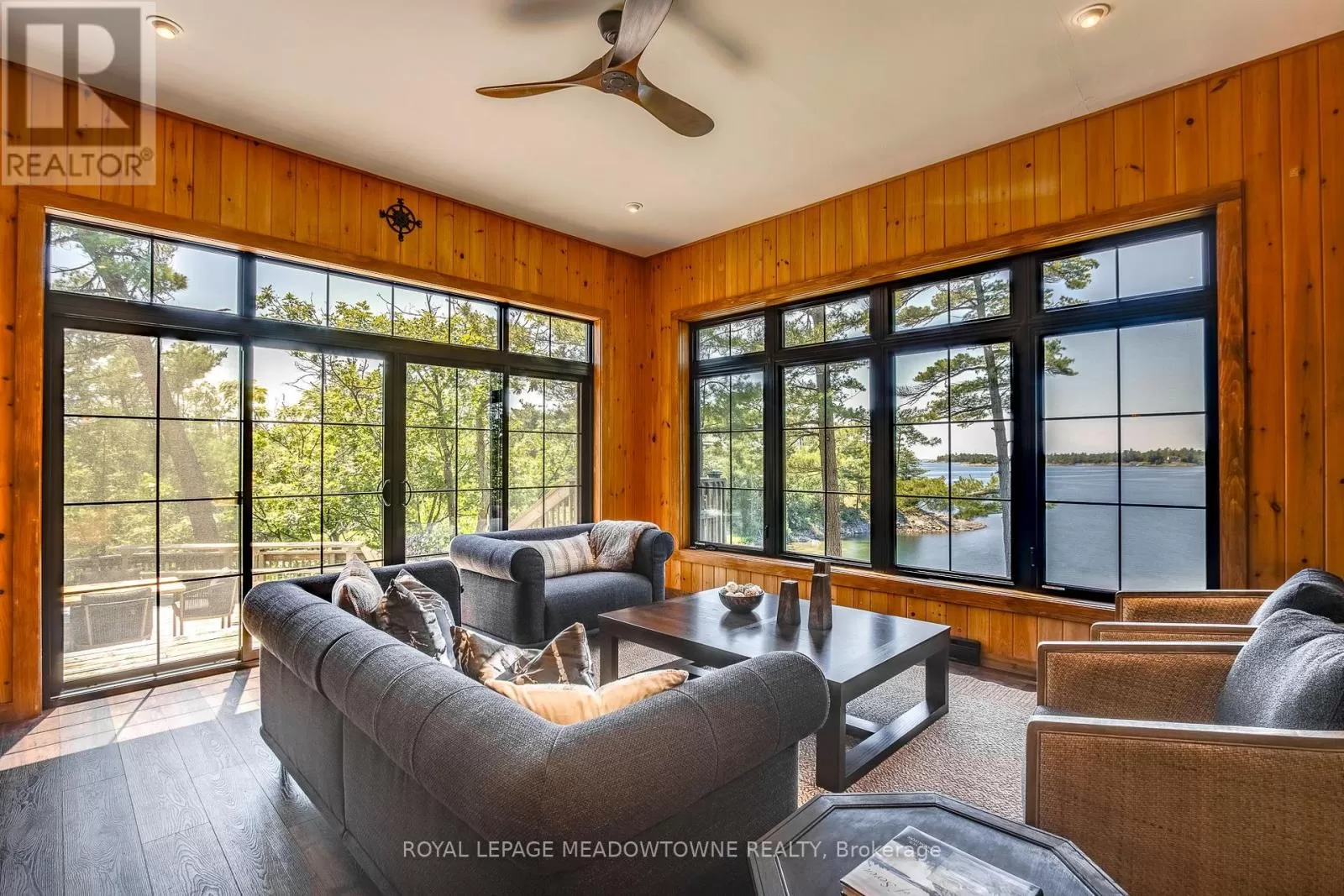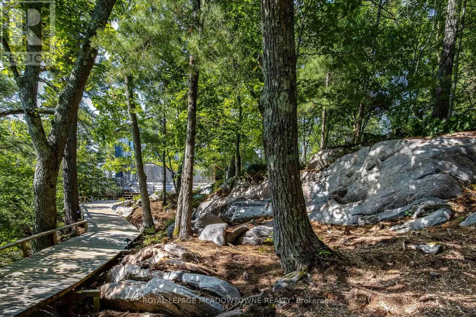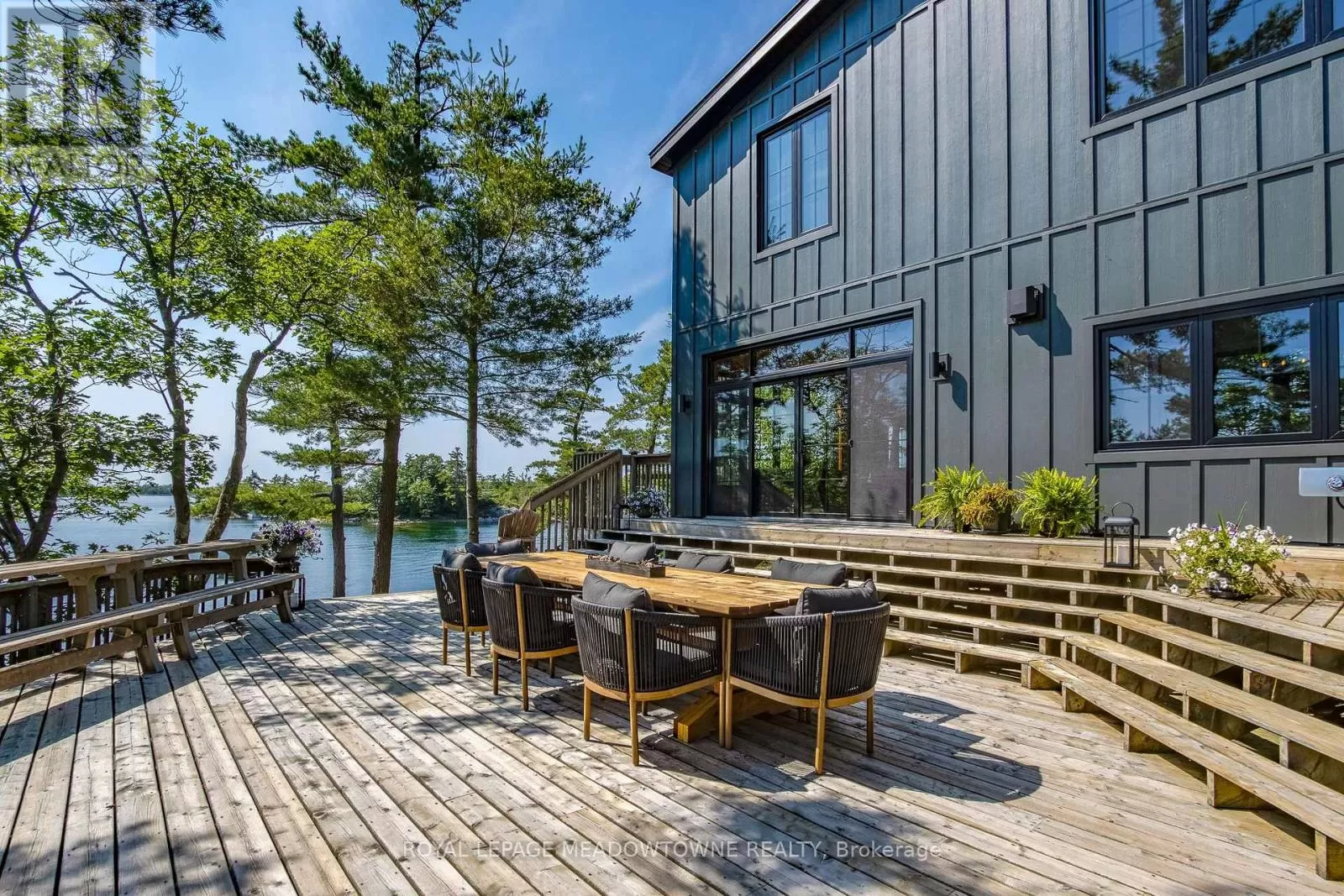 Cross Streets: HWY 400N to Twelve Mile Bay Rd. to Moose Deer Point Marina, 8 min by boat. ** Directions: HWY 400N & Twelve Mile Bay Rd. Set on a private 5-acre island, this west-facing property offers sweeping views of Georgian Bay, mature forests, and majestic granite outcroppings- an idyllic setting for family gatherings, summer escapes, or elegant entertaining. Approached via a picturesque boardwalk winding through rugged rock and towering pines, the main house sits elevated beneath a canopy of oak and pine trees. Enjoy breathtaking sunsets from an expansive west-facing deck that feels suspended between sky and water. Exquisitely designed interiors using the finest materials and finishes integrates a refined sensibility with the comfort of cottage life. This is Muskoka quality and style in a classic Georgian Bay setting! Fully renovated in 2024-25 the 2328 sq.ft.cottage features a spacious dining room with a gas fireplace, and an open concept west-facing living room and vaulted TV room- offering stunning views of the bay and ideal spaces for family gatherings or intimate moments. The Chefs Kitchen anchored by an impressive 8-ft island and complemented by a sleek bar area is ideal for both culinary creativity and entertaining. The two upper-level bedrooms provide comfortable sleeping quarters, while the main primary bedroom offers privacy, space and quiet serenity. A cozy lounge/office & 2-pc bath completes the upper floor, offering additional flexibility for your needs. A large 4 pc bath and laundry are adjacent to the master on the main floor. Further enhancements include: - A large backyard with views extending deep into the forest, complemented by perennial gardens and an area for recreation - a 840 sq ft waterside recreation building with vaulted ceilings and a huge screened-in porch -A well-equipped fitness shed - A private beach and fire pit with day dock - A protected deep-water dock for larger boats - A scenic waterfront walking trail linking the five buildings on the island. Only 8-10 min by boat from local marina via protected channel, easy even for a timid boater. (id:27476)
