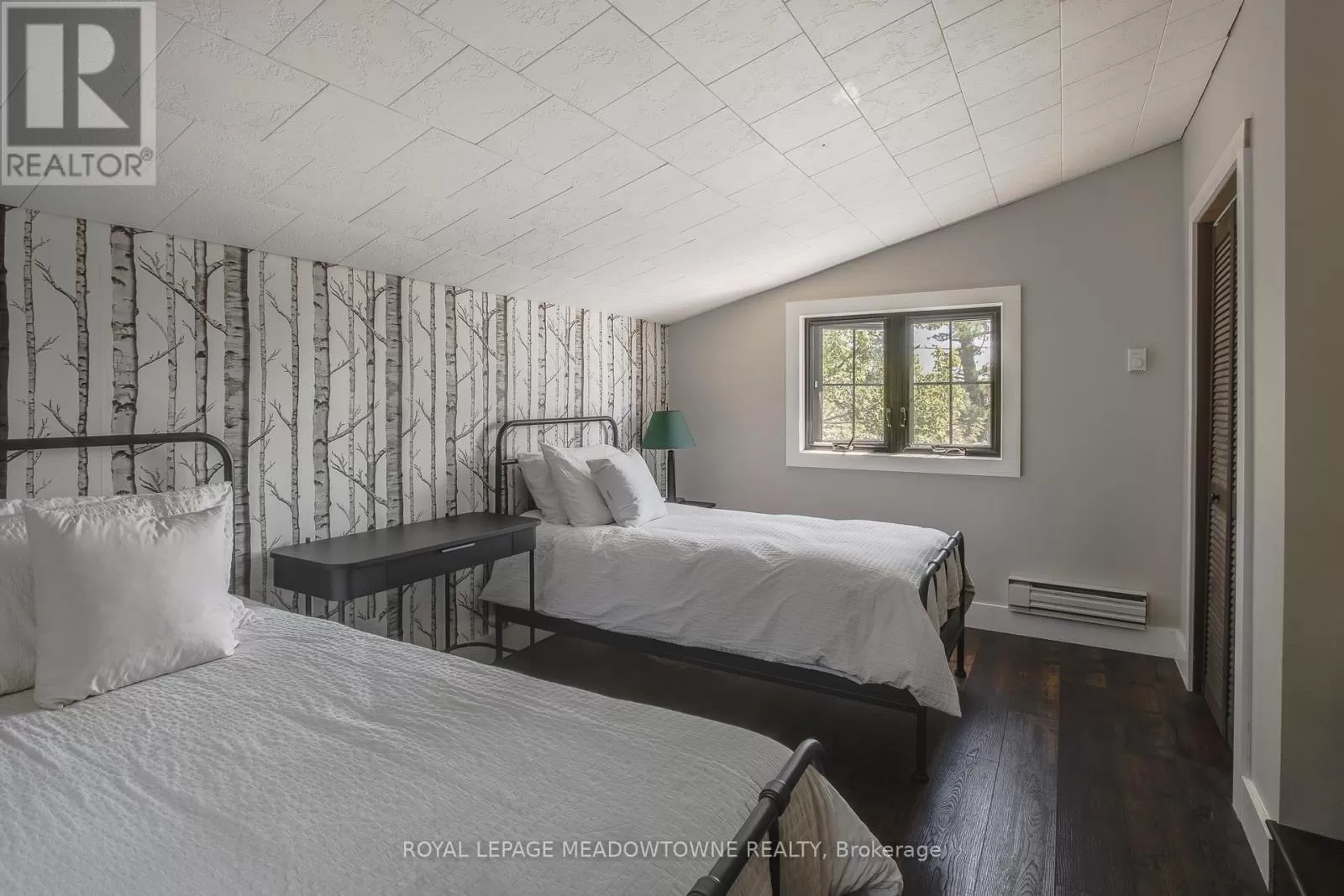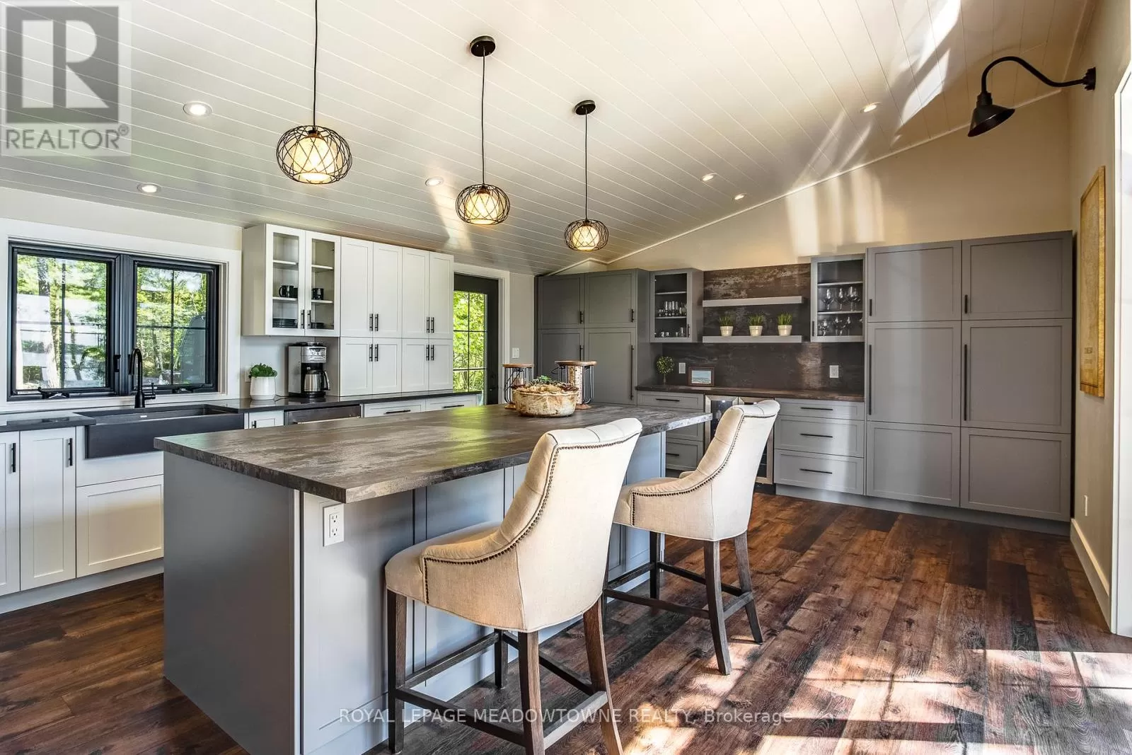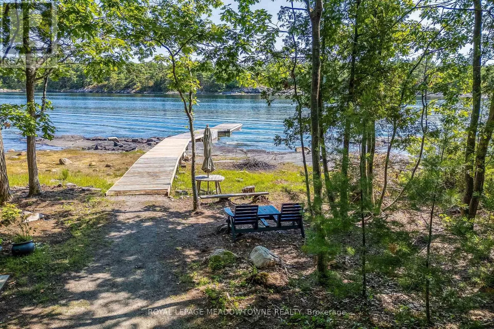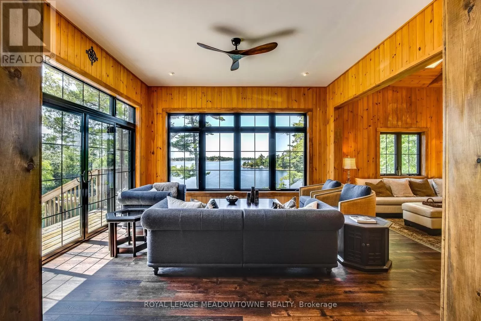 Cross Streets: HWY 400N to Twelve Mile Bay Rd. to Moose Deer Point Marina, 8 min by boat. ** Directions: HWY 400N & Twelve Mile Bay Rd. Set on a private 5-acre island, this west-facing property offers sweeping views of Georgian Bay, mature forests, and majestic granite outcroppings- an idyllic setting for family gatherings, summer escapes, or elegant entertaining. Approached via a picturesque boardwalk winding through rugged rock and towering pines, the main house sits elevated beneath a canopy of oak and pine trees. Enjoy breathtaking sunsets from an expansive west-facing deck that feels suspended between sky and water. Exquisitely designed interiors using the finest materials and finishes integrates a refined sensibility with the comfort of cottage life. This is Muskoka quality and style in a classic Georgian Bay setting! Fully renovated in 2024-25 the 2328 sq.ft.cottage features a spacious dining room with a gas fireplace, and an open concept west-facing living room and vaulted TV room- offering stunning views of the bay and ideal spaces for family gatherings or intimate moments. The Chefs Kitchen anchored by an impressive 8-ft island and complemented by a sleek bar area is ideal for both culinary creativity and entertaining. The two upper-level bedrooms provide comfortable sleeping quarters, while the main primary bedroom offers privacy, space and quiet serenity. A cozy lounge/office & 2-pc bath completes the upper floor, offering additional flexibility for your needs. A large 4 pc bath and laundry are adjacent to the master on the main floor. Further enhancements include: - A large backyard with views extending deep into the forest, complemented by perennial gardens and an area for recreation - a 840 sq ft waterside recreation building with vaulted ceilings and a huge screened-in porch -A well-equipped fitness shed - A private beach and fire pit with day dock - A protected deep-water dock for larger boats - A scenic waterfront walking trail linking the five buildings on the island. Only 8-10 min by boat from local marina via protected channel, easy even for a timid boater. (id:27476)