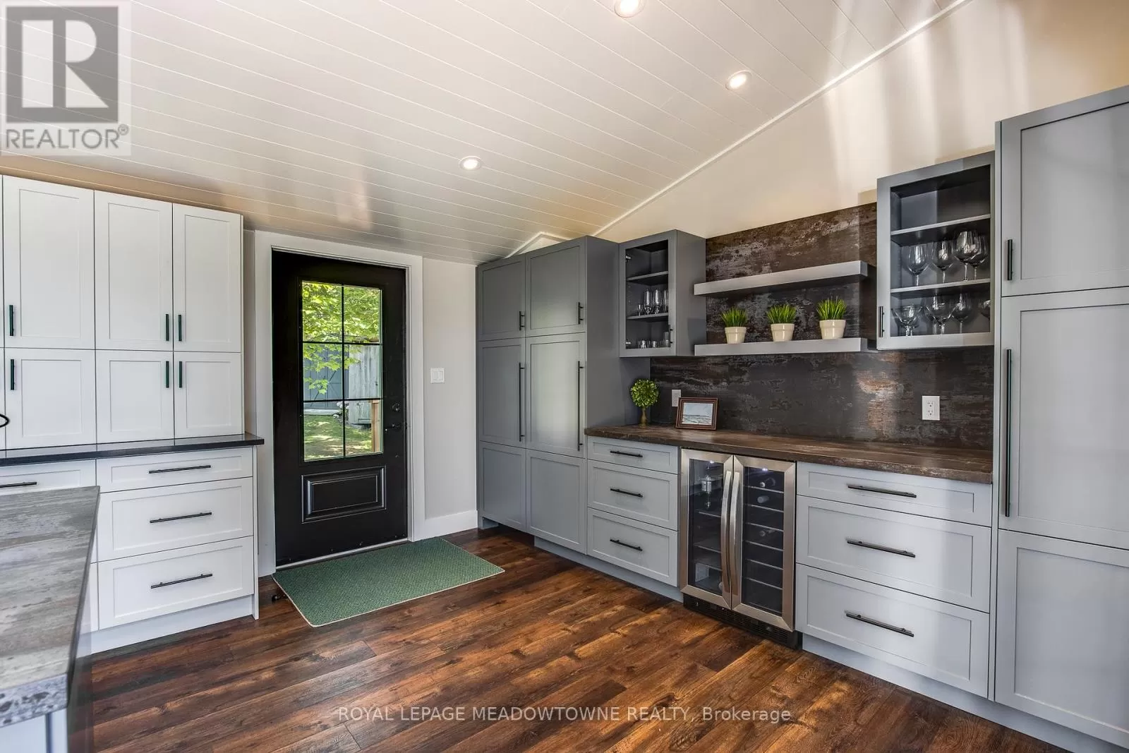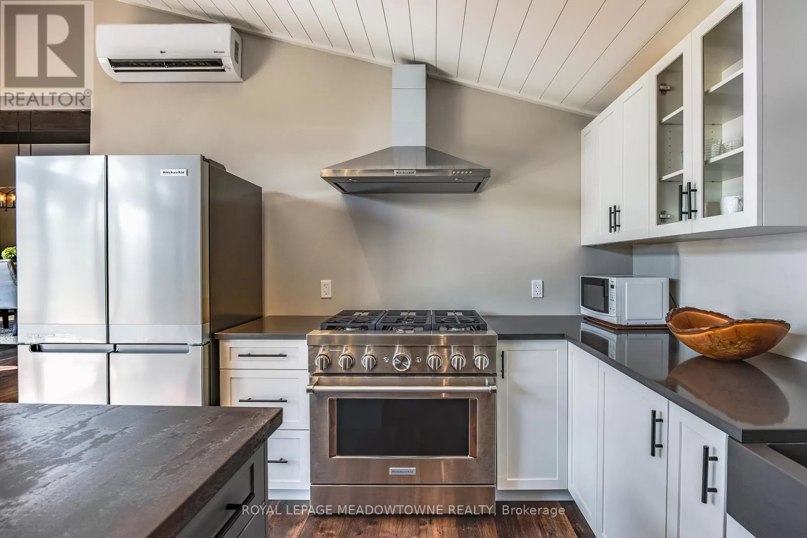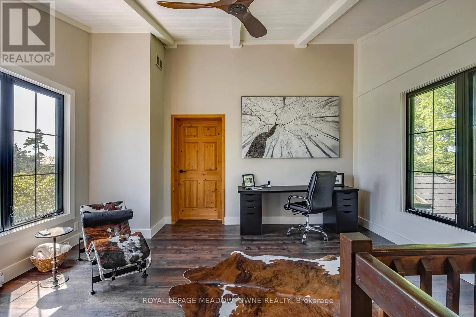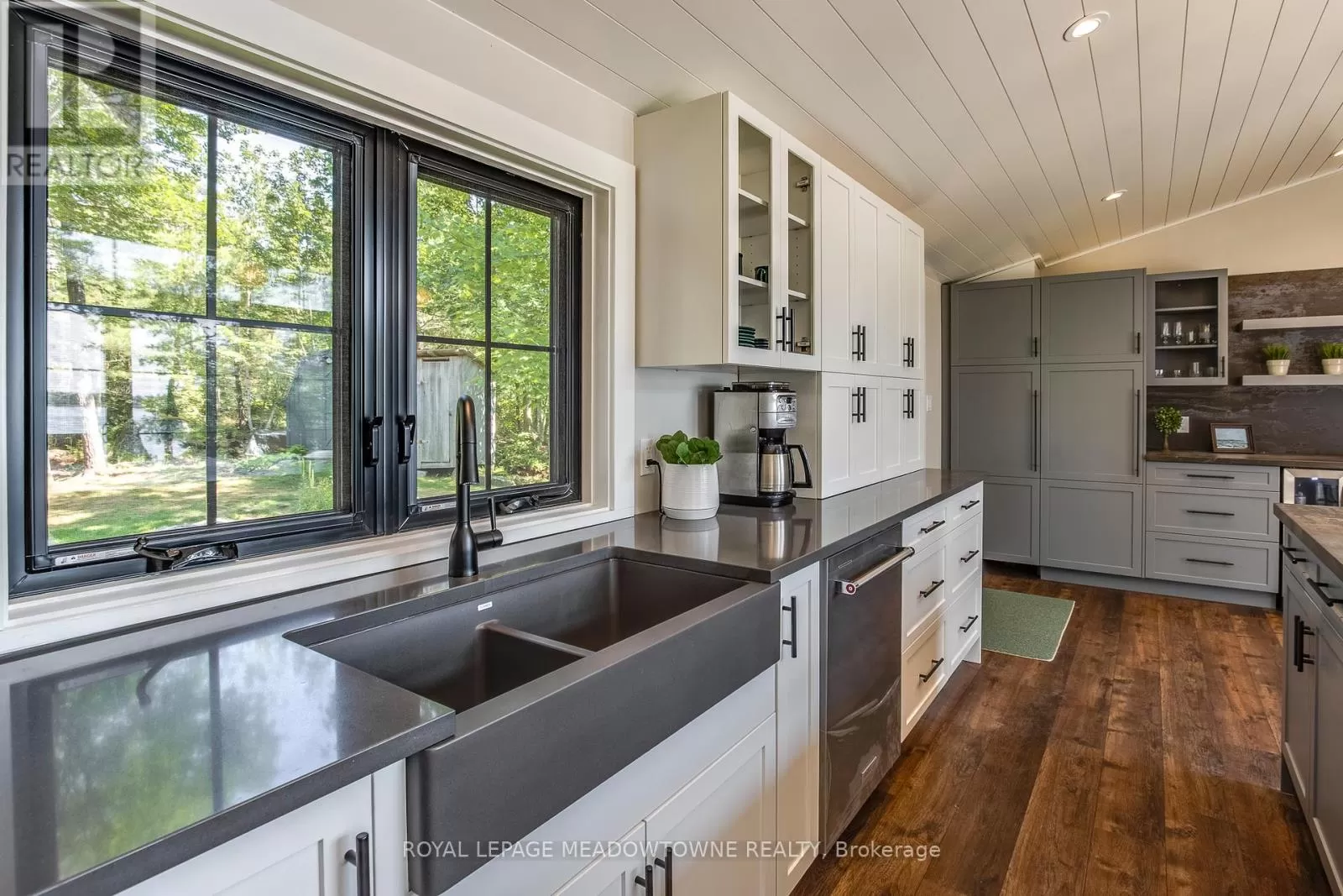 Cross Streets: HWY 400N to Twelve Mile Bay Rd. to Moose Deer Point Marina, 8 min by boat. ** Directions: HWY 400N & Twelve Mile Bay Rd. Set on a private 5-acre island, this west-facing property offers sweeping views of Georgian Bay, mature forests, and majestic granite outcroppings- an idyllic setting for family gatherings, summer escapes, or elegant entertaining. Approached via a picturesque boardwalk winding through rugged rock and towering pines, the main house sits elevated beneath a canopy of oak and pine trees. Enjoy breathtaking sunsets from an expansive west-facing deck that feels suspended between sky and water. Exquisitely designed interiors using the finest materials and finishes integrates a refined sensibility with the comfort of cottage life. This is Muskoka quality and style in a classic Georgian Bay setting! Fully renovated in 2024-25 the 2328 sq.ft.cottage features a spacious dining room with a gas fireplace, and an open concept west-facing living room and vaulted TV room- offering stunning views of the bay and ideal spaces for family gatherings or intimate moments. The Chefs Kitchen anchored by an impressive 8-ft island and complemented by a sleek bar area is ideal for both culinary creativity and entertaining. The two upper-level bedrooms provide comfortable sleeping quarters, while the main primary bedroom offers privacy, space and quiet serenity. A cozy lounge/office & 2-pc bath completes the upper floor, offering additional flexibility for your needs. A large 4 pc bath and laundry are adjacent to the master on the main floor. Further enhancements include: - A large backyard with views extending deep into the forest, complemented by perennial gardens and an area for recreation - a 840 sq ft waterside recreation building with vaulted ceilings and a huge screened-in porch -A well-equipped fitness shed - A private beach and fire pit with day dock - A protected deep-water dock for larger boats - A scenic waterfront walking trail linking the five buildings on the island. Only 8-10 min by boat from local marina via protected channel, easy even for a timid boater. (id:27476)