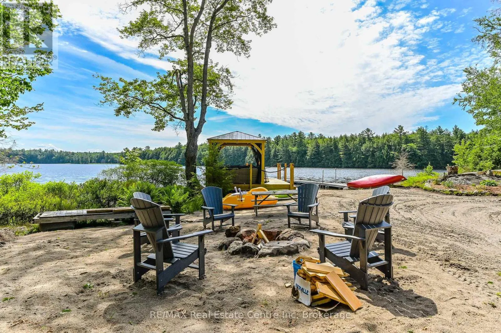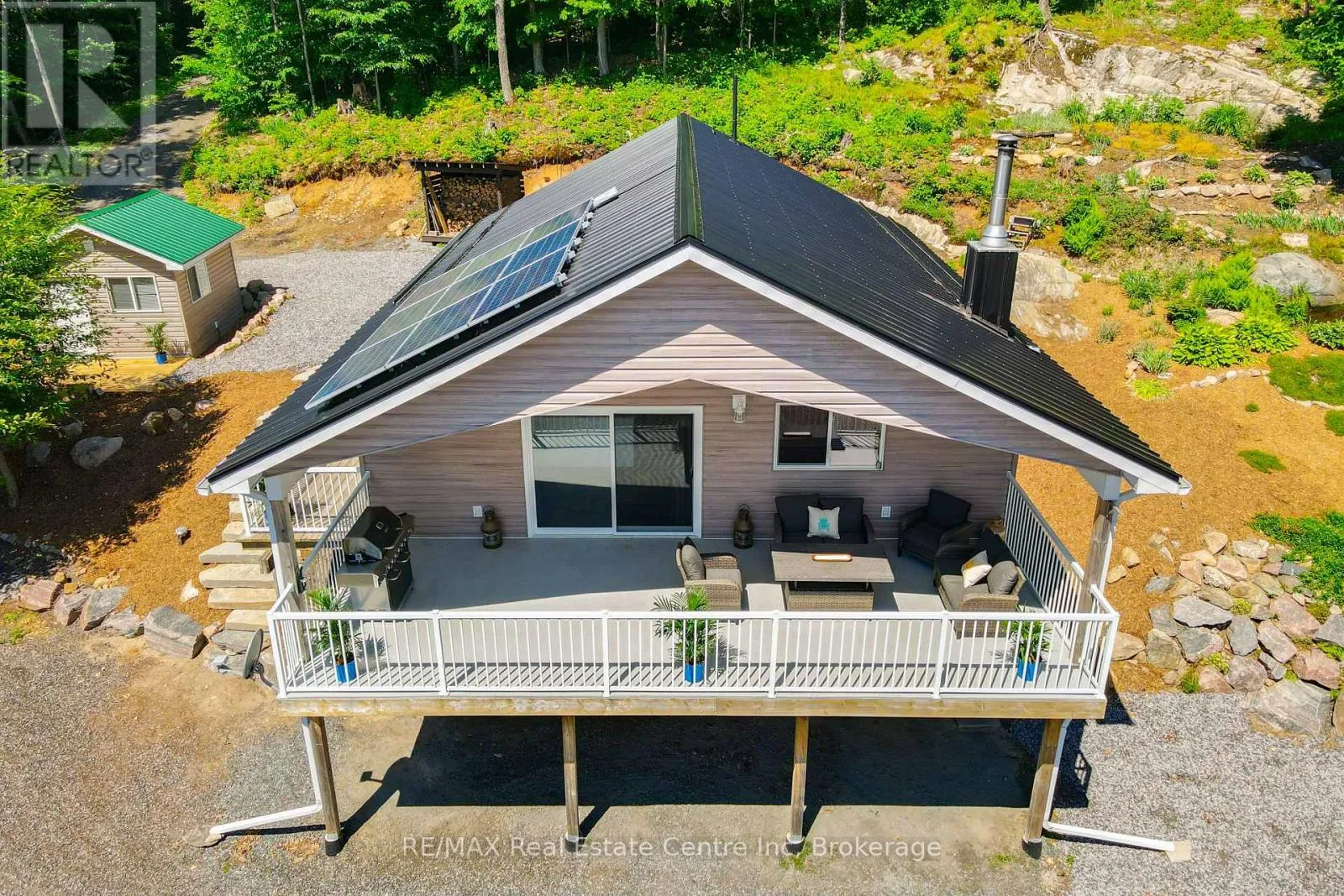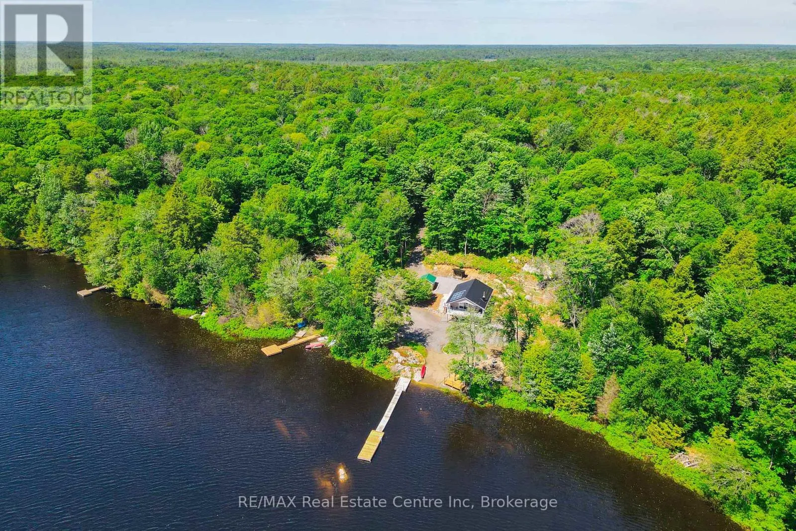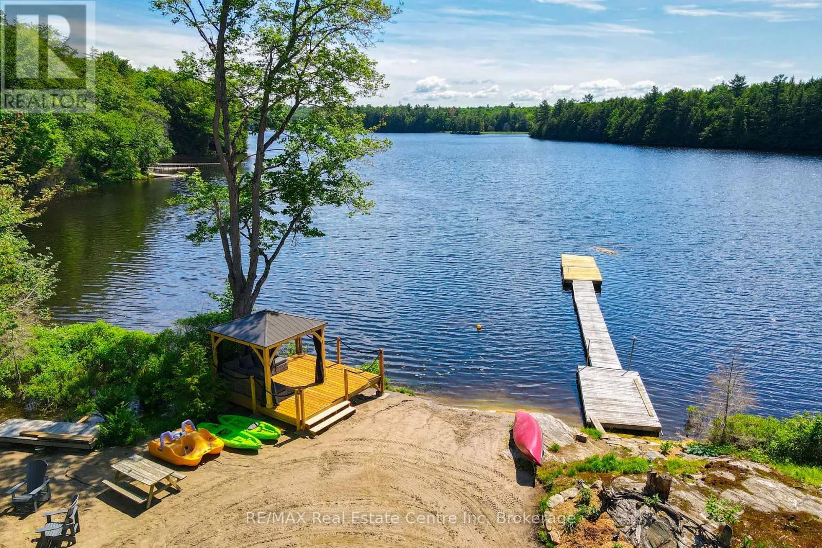 Cross Streets: Healey Lake Road. ** Directions: Healey Lake Road to South Crane, turn right. Welcome to Bloor Lake House (currently listed on Airbnb and has a full summer of rentals, if the buyer wants to assume them ($3000 per week) a fully renovated lakefront retreat, offering the same natural beauty and lifestyle the Muskoka area is known for with added privacy and tranquility. Set on 3.3 acres, with private tree lined laneway with gated secure entrance and ample parking, this property was completely renovated four years ago and combines modern systems with classic cottage character. The main cottage features open-concept living with vaulted pine ceilings, updated wood finishes, wood stove, large covered front porch with full lake view, and a bright kitchen with quartz countertops, white cabinetry, gas range, and excellent counter space for cooking and serving. Sleeping accommodations include space for up to 11 people between the cottage and a separate heated bunkie, making it ideal for families and guests.The property is situated on a private lake shared by only four cottages, with no public access, and the views are open and expansive. Outside you'll find expansive perennial gardens, lakeside firepit, enclosed wood storage, and lockable ATV or gardening storage. The waterfront includes a lakeside screened in gazebo with seating, private dock and swim platform, and a gradual entry sandy beach which allows for motor boat launch and opportunities for swimming, canoeing, kayaking, and excellent fishing for small and largemouth bass, sunfish, and crappie. A nearby waterfall offers portage access into the lower Crane Lake, adding to the recreational appeal. Recent upgrades include a wrapped foundation, solar power with lithium batteries, and a whole-home propane generator, ensuring efficient and reliable service in all seasons.With 3.3 acres of land, updated interiors, exceptional waterfront, and no short-term rental restrictions in the area, this lake house is well-suited as a year-round residence, seasonal getaway, or rental investment. (id:27476)