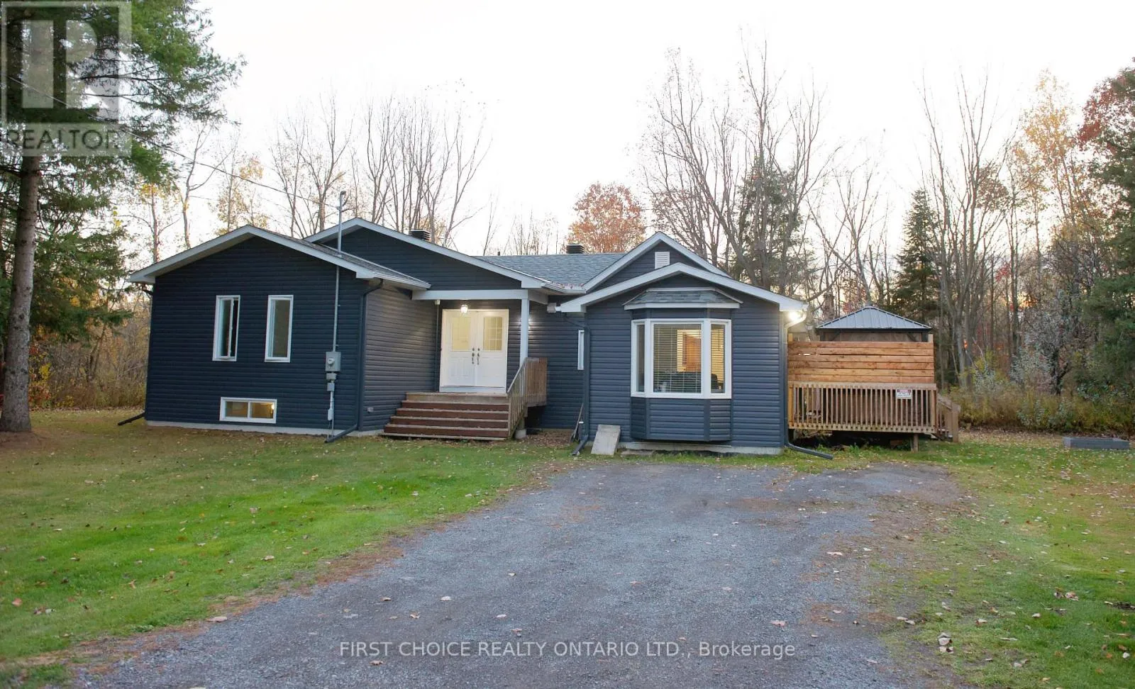 Cross Streets: Calypso Road and Baker Road. ** Directions: 417 to Limoges exit, head north over the 417, turn right on Calypso Road, 6kn to Baker Road, turn right, property on right side. This beautifully renovated bungalow has everything newer with very tasteful design. Approx 1 acre with trees around the parameter which makes this home very private. Plenty of space for gardens, decking off the eating area and fire pit for those amazing summer nights. This 4 plus 1 bedroom shows pride of ownership throughout. Master with a 4 piece ensuite (2 sinks), huge walk in closet, plus a door to the outside, 3 other very good sized bedrooms plus a lavish common bathroom. Large functional kitchen with island, Gas stove, new stainless steel appliances, breakfast bar, flat ceilings, bulk heads, pot lights. Lower level with a newly developed family room, large bedroom and a 4 piece bathroom. Family room also has a pellet stove (new in 2018), new furnace 2026, Kitchen new in 2018, deck off kitchen 2018, windows new since 2018, hot water tank (owned) 2014, some windows in 2021, complete lower level family room, bedroom and bathroom in 2020, new septic system (tank, bed, everything) 2009, AC unit 2022, Generac 2018, plastic garage 2020.New Roof, Eavestrough, Gutter Guards, Water Softener, Sump Pump, Paint, Security Lighting 2024/2025..5 minutes to Calypso Water park, 10 minutes to Casselman, 28 minutes to Ottawa. This property is ready for you to move in and call it Home! (id:27476)